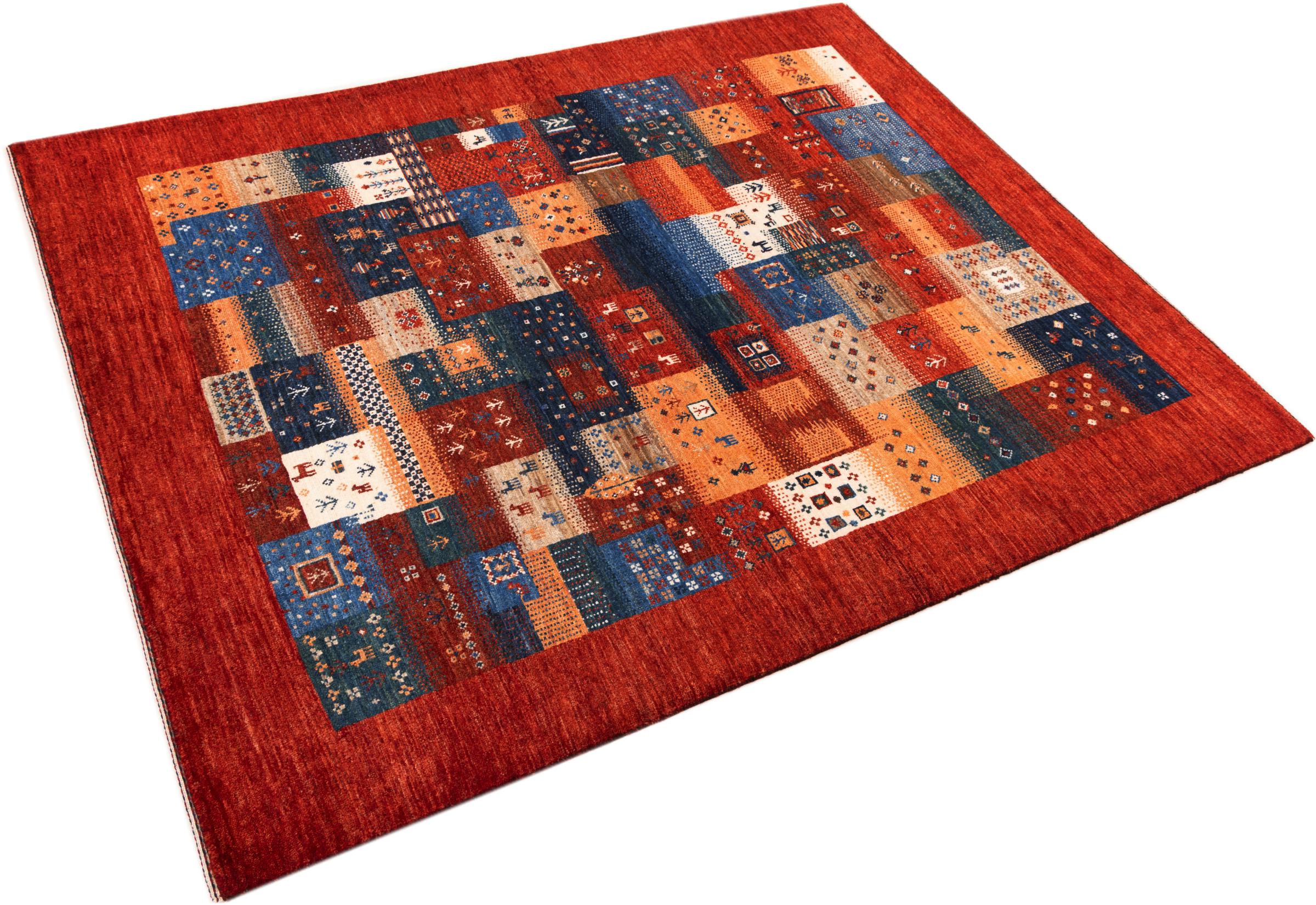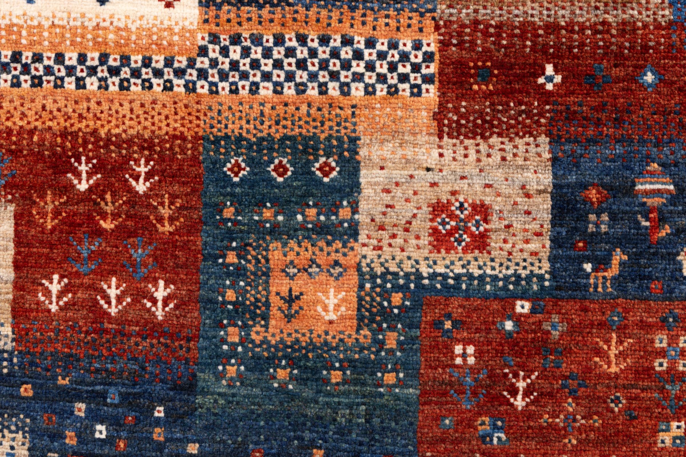 Esta hermosa alfombra es una Gabbeh persa y por lo tanto pertenece a las alfombras Gabbeh de mayor calidad. Las alfombras son anudadas por nómadas o seminómadas en Irán según la artesanía tradicional. Los motivos y patrones simples están inspirados en su mayoría por el entorno inmediato de los nómadas. Por ejemplo, los camellos, árboles o arbustos se pueden encontrar en las alfombras tradicionales. Las alfombras gabbeh persas están hechas de lana de rebaños de ovejas criados localmente. Por lo tanto, la lana se sigue hilando a mano. Así, cada una de estas alfombras orientales encarna un carácter único de la cultura de siglos de antigüedad.