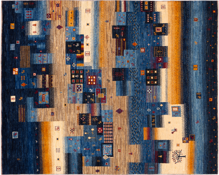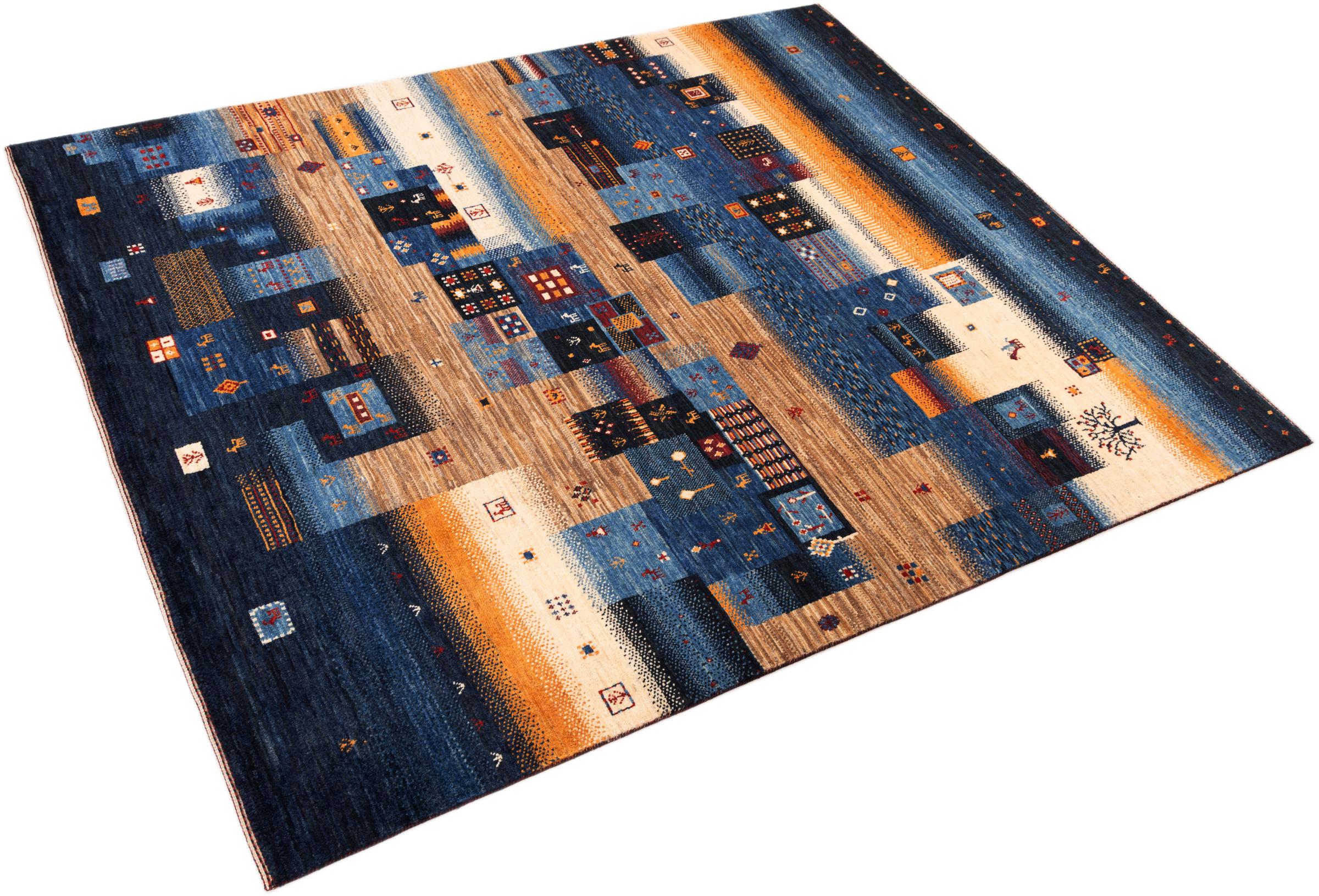 Esta hermosa alfombra es una Gabbeh persa y por lo tanto pertenece a las alfombras Gabbeh de mayor calidad. Las alfombras son anudadas por nómadas o seminómadas en Irán según la artesanía tradicional. Los motivos y patrones simples están inspirados en su mayoría por el entorno inmediato de los nómadas. Por ejemplo, los camellos, árboles o arbustos se pueden encontrar en las alfombras tradicionales. Las alfombras gabbeh persas están hechas de lana de rebaños de ovejas criados localmente. Por lo tanto, la lana se sigue hilando a mano. Así, cada una de estas alfombras orientales encarna un carácter único de la cultura de siglos de antigüedad.