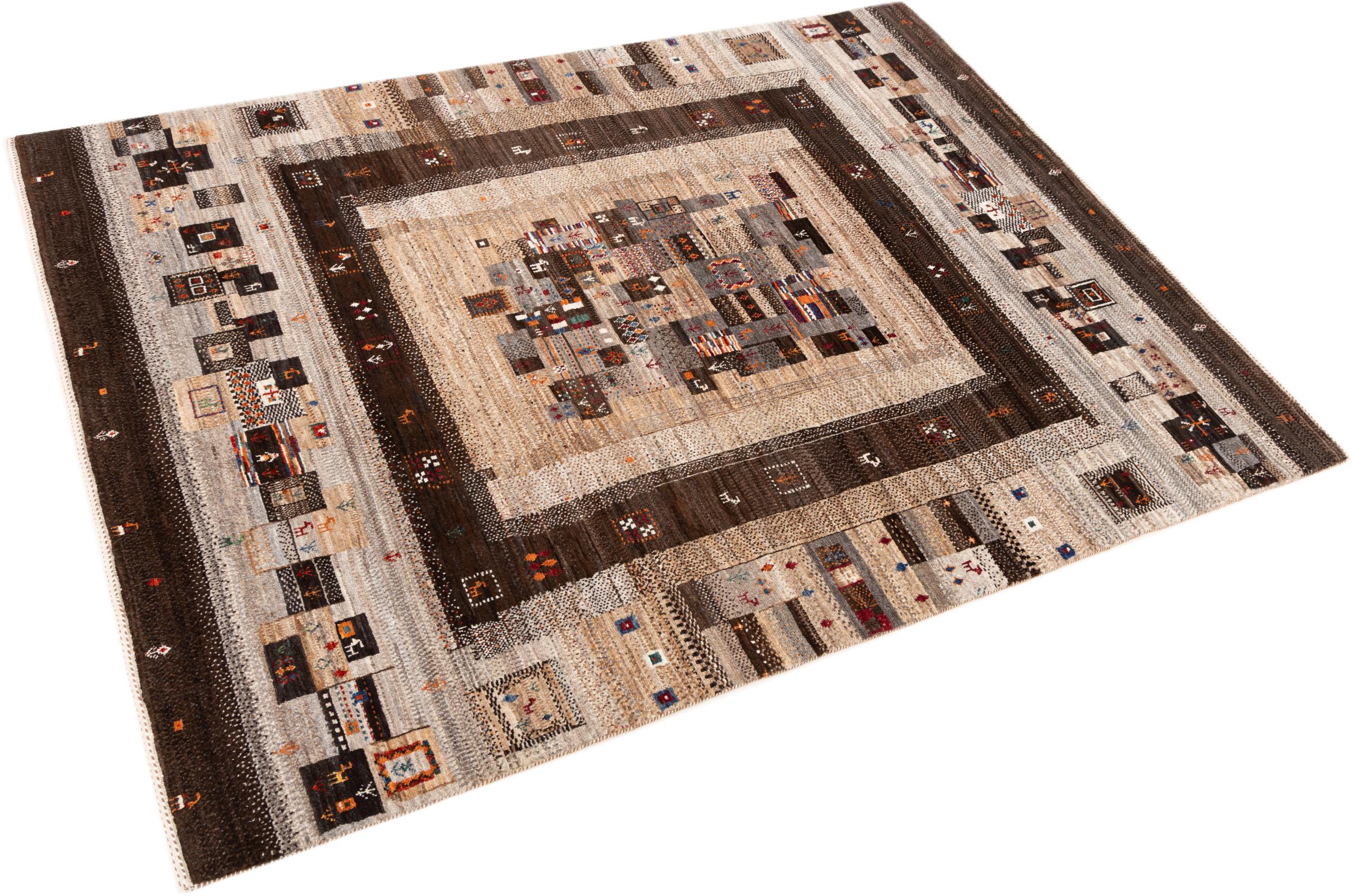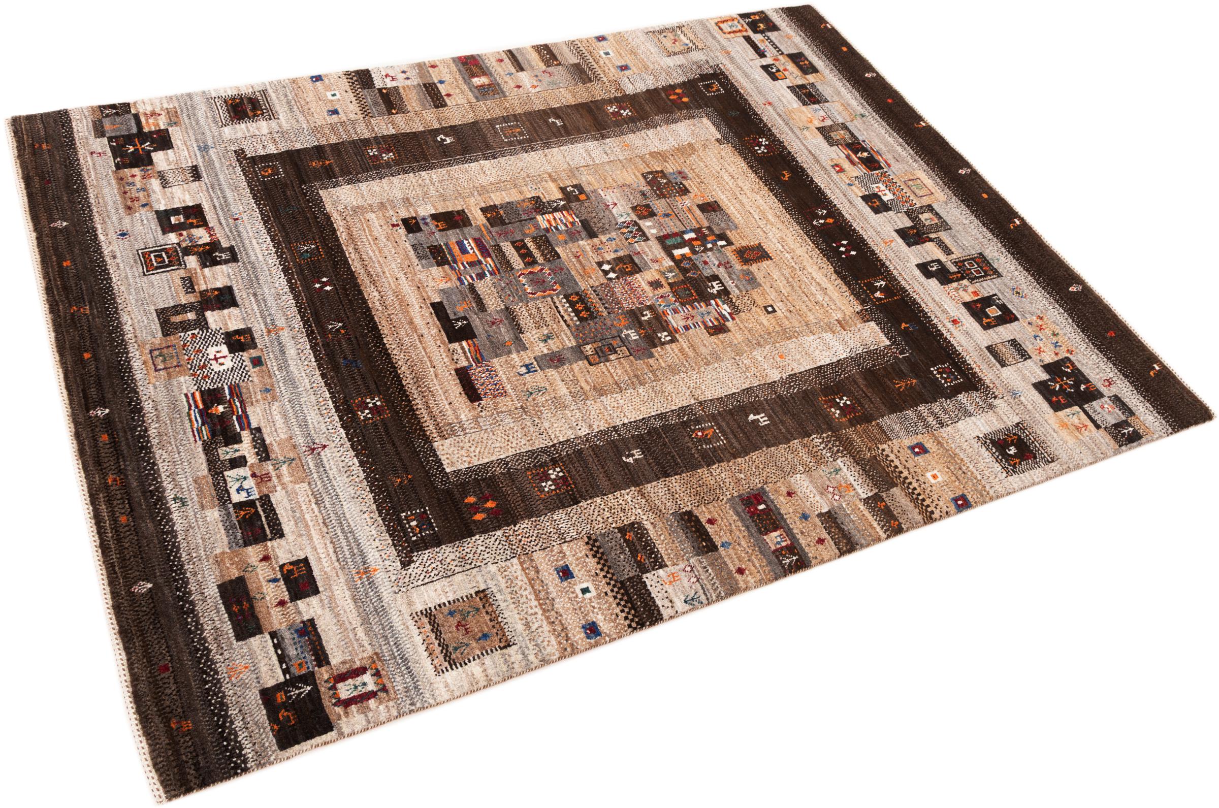 Esta hermosa alfombra es una Gabbeh persa y por lo tanto pertenece a las alfombras Gabbeh de mayor calidad. Las alfombras son anudadas por nómadas o seminómadas en Irán según la artesanía tradicional. Los motivos y patrones simples están inspirados en su mayoría por el entorno inmediato de los nómadas. Por ejemplo, los camellos, árboles o arbustos se pueden encontrar en las alfombras tradicionales. Las alfombras gabbeh persas están hechas de lana de rebaños de ovejas criados localmente. Por lo tanto, la lana se sigue hilando a mano. Así, cada una de estas alfombras orientales encarna un carácter único de la cultura de siglos de antigüedad.