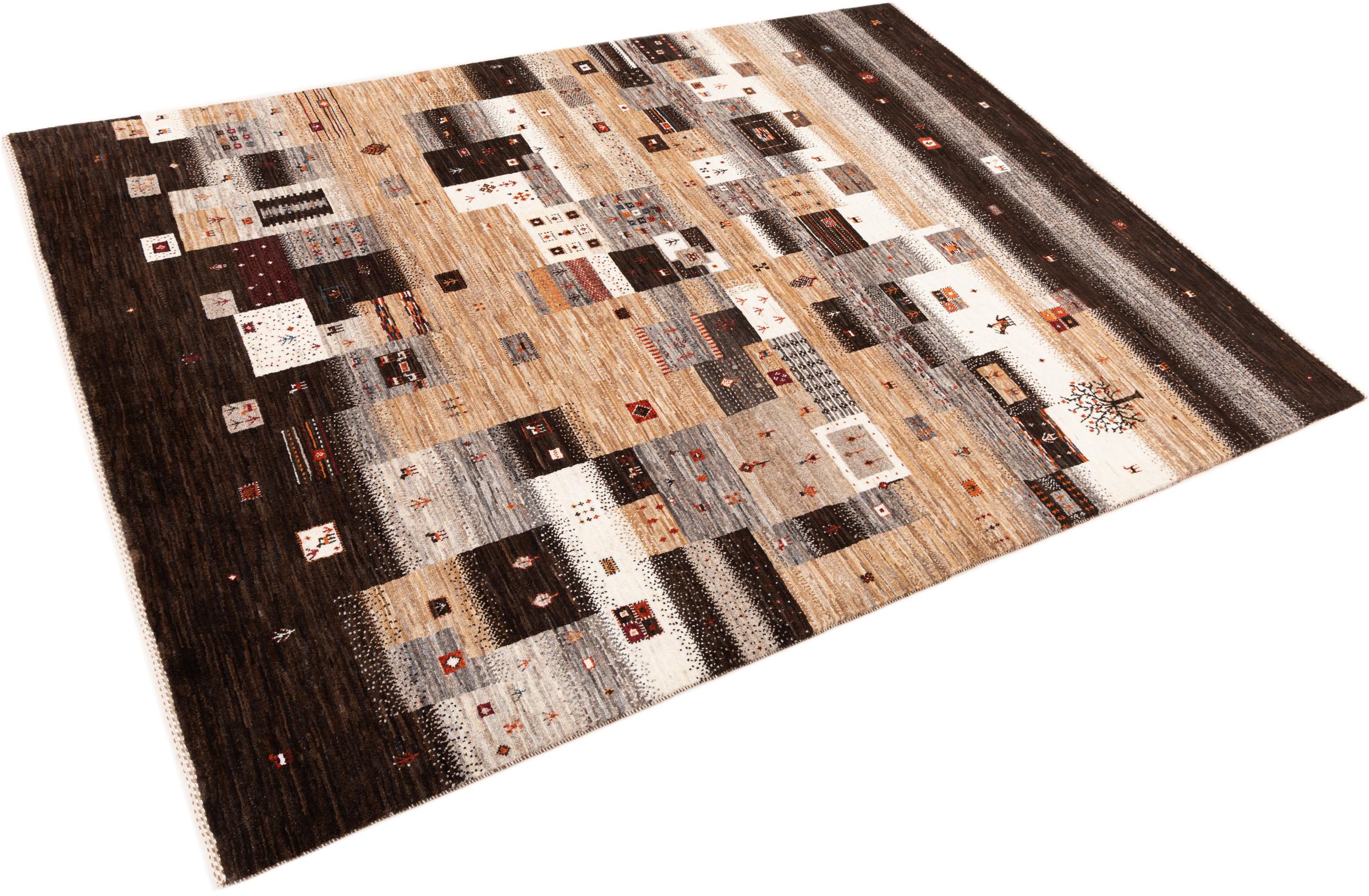 Esta hermosa alfombra es una Gabbeh persa y por lo tanto pertenece a las alfombras Gabbeh de mayor calidad. Las alfombras son anudadas por nómadas o seminómadas en Irán según la artesanía tradicional. Los motivos y patrones simples están inspirados en su mayoría por el entorno inmediato de los nómadas. Por ejemplo, los camellos, árboles o arbustos se pueden encontrar en las alfombras tradicionales. Las alfombras gabbeh persas están hechas de lana de rebaños de ovejas criados localmente. Por lo tanto, la lana se sigue hilando a mano. Así, cada una de estas alfombras orientales encarna un carácter único de la cultura de siglos de antigüedad.