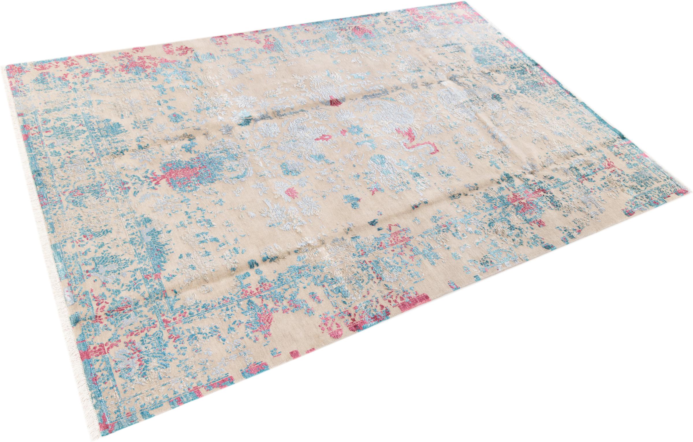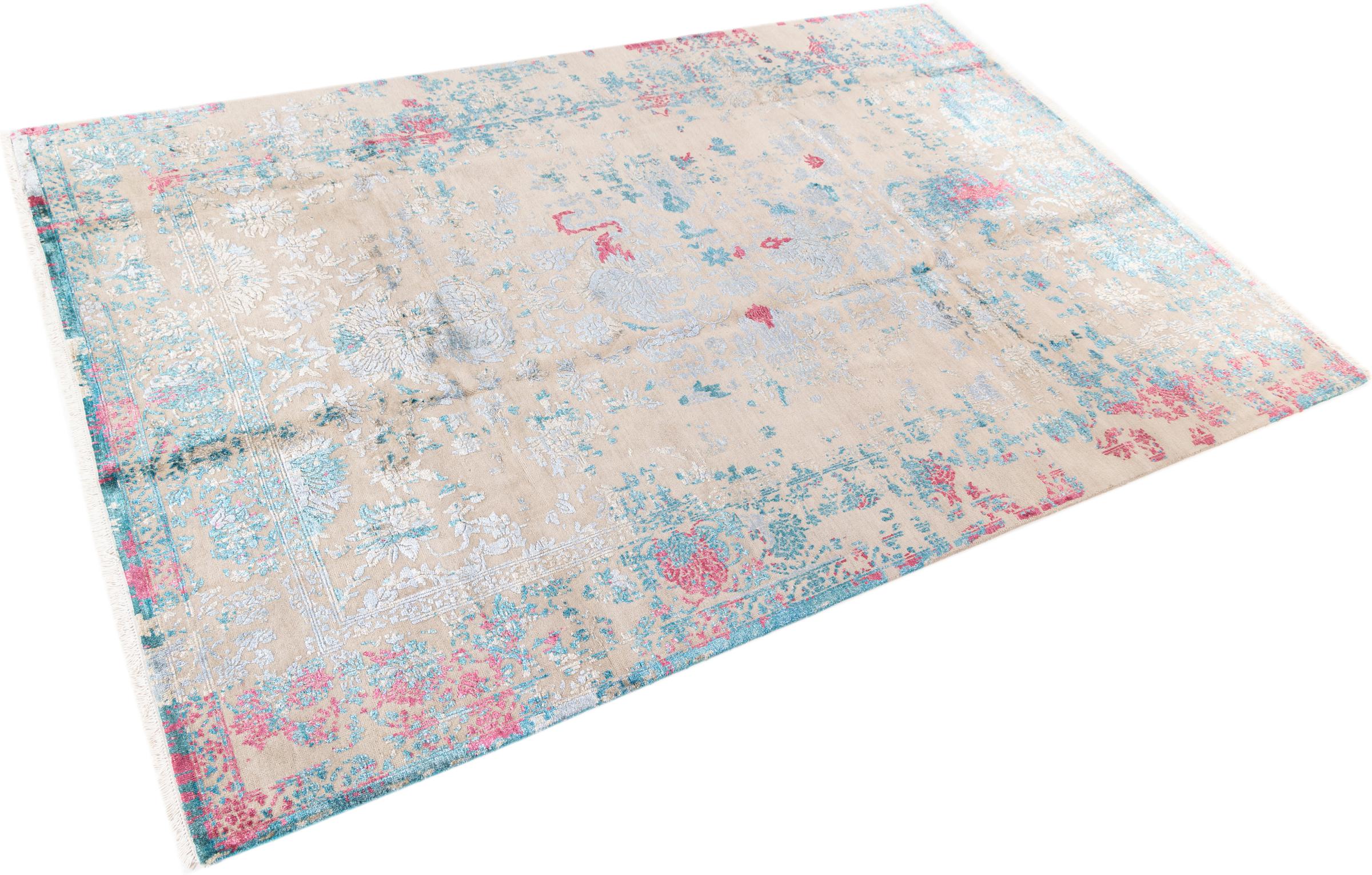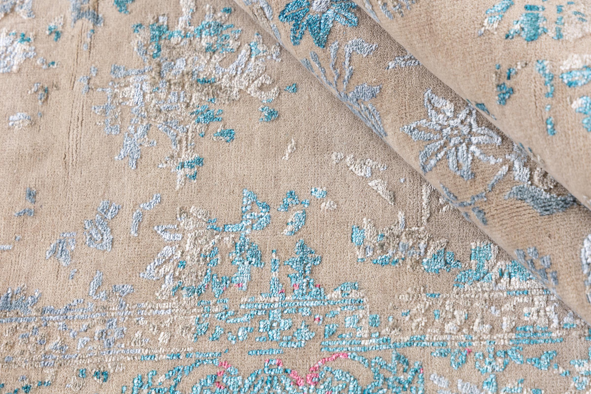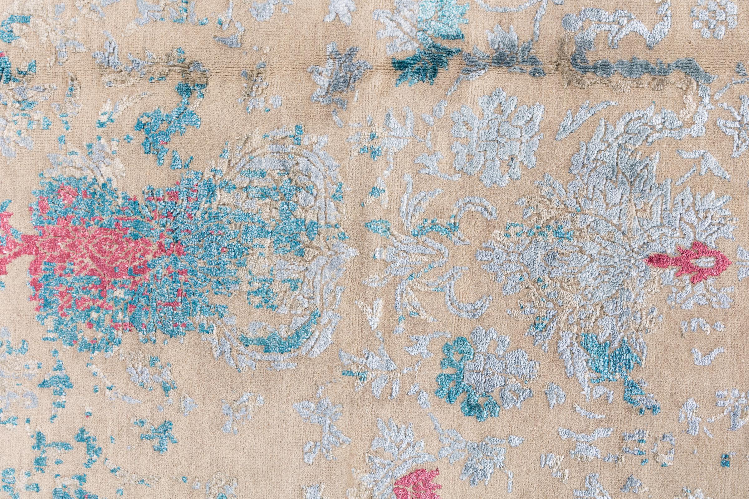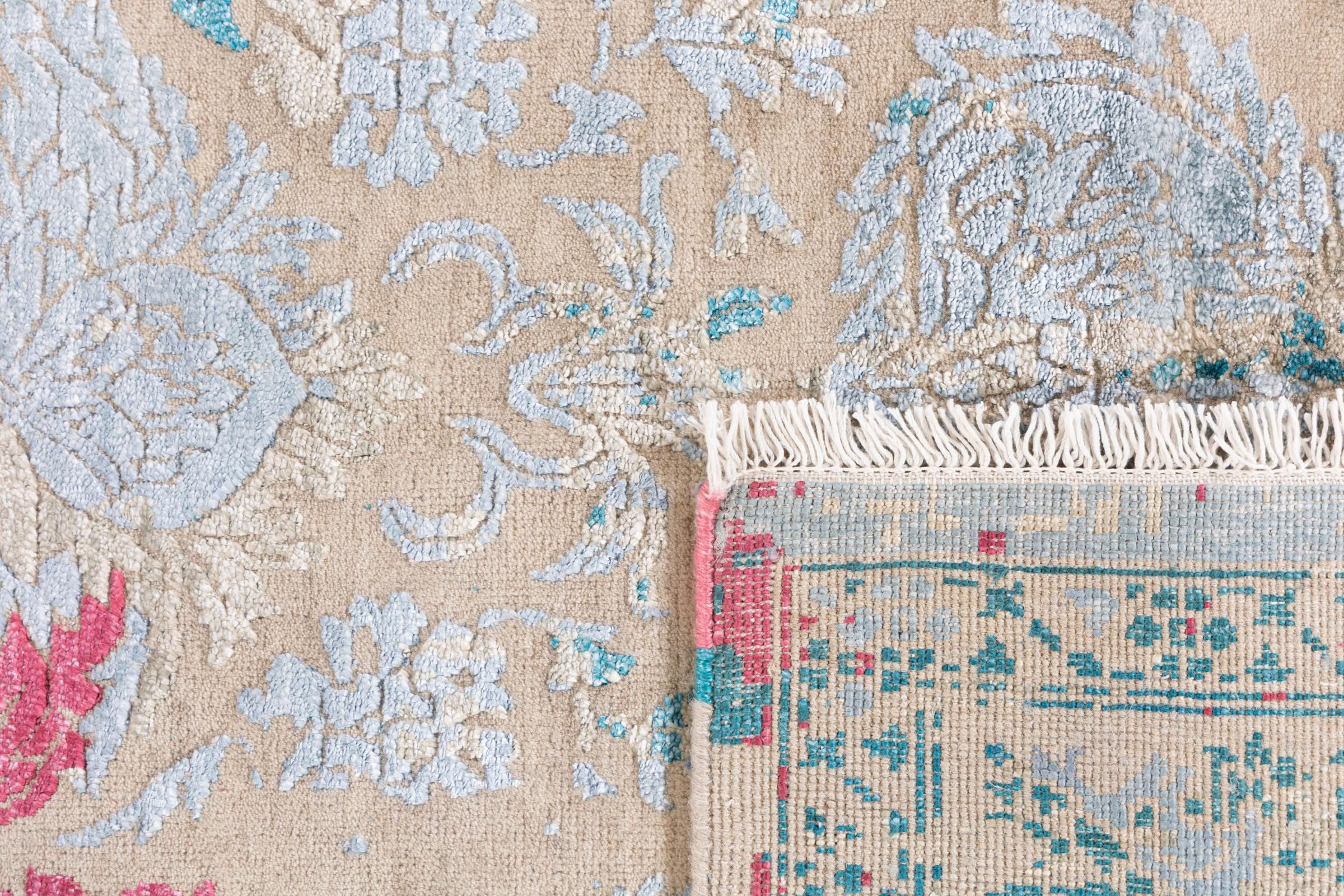 Alfombra número: 37141001154905 Tamaño: 280x190 cm Espesor: alrededor de 12 mm Nudos: 200 000 - 250 000 / m² Elaboración: Anudado a mano Crespón: Lana con seda de bambú Urdimbre: Algodón Origen: India Edad: Nuevo Peso: alrededor de 19 kg Cantidad en stock: Única - Solo 1 en stock