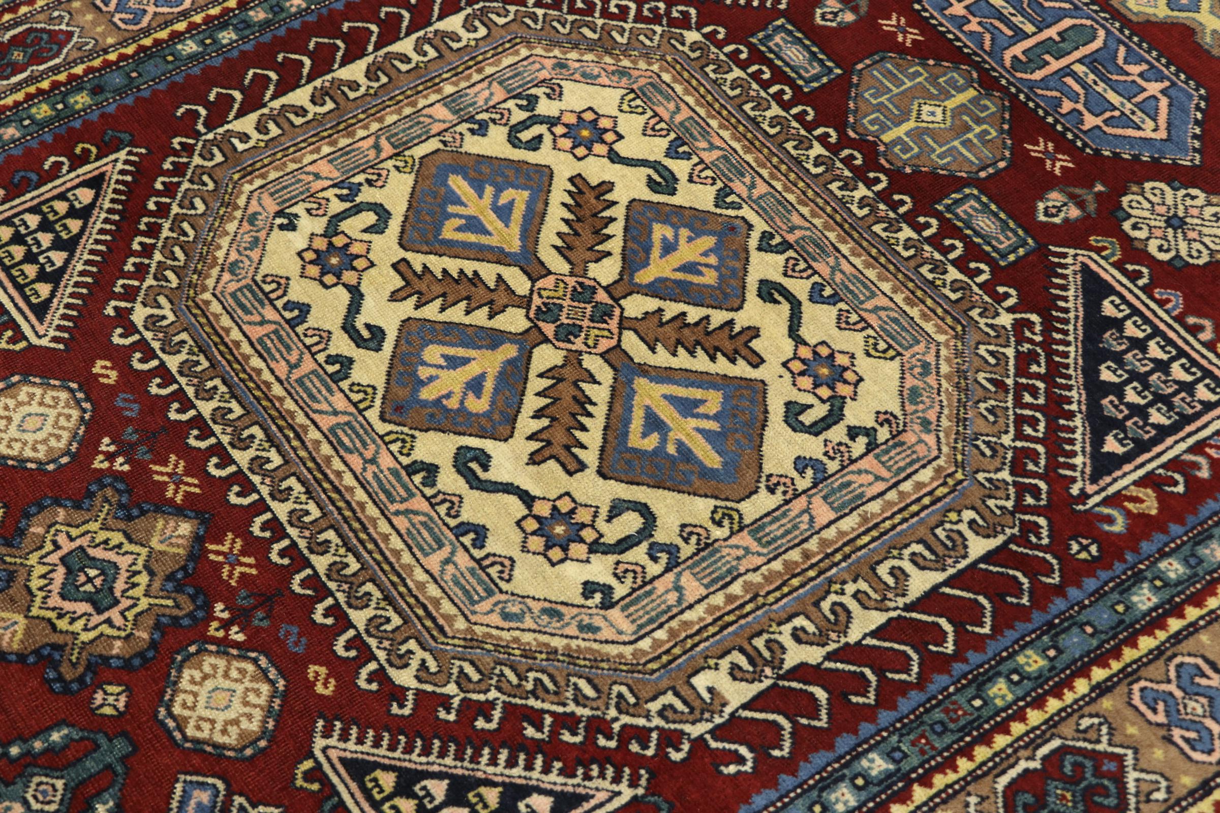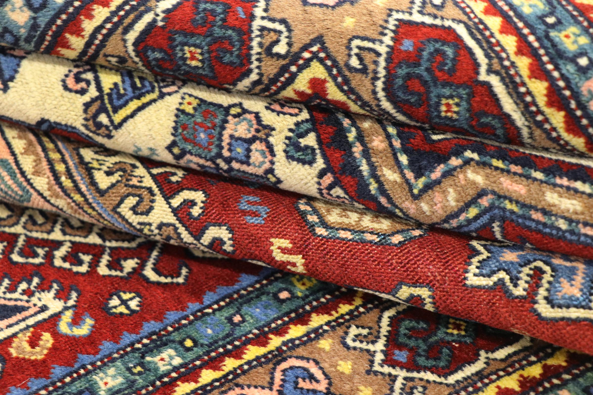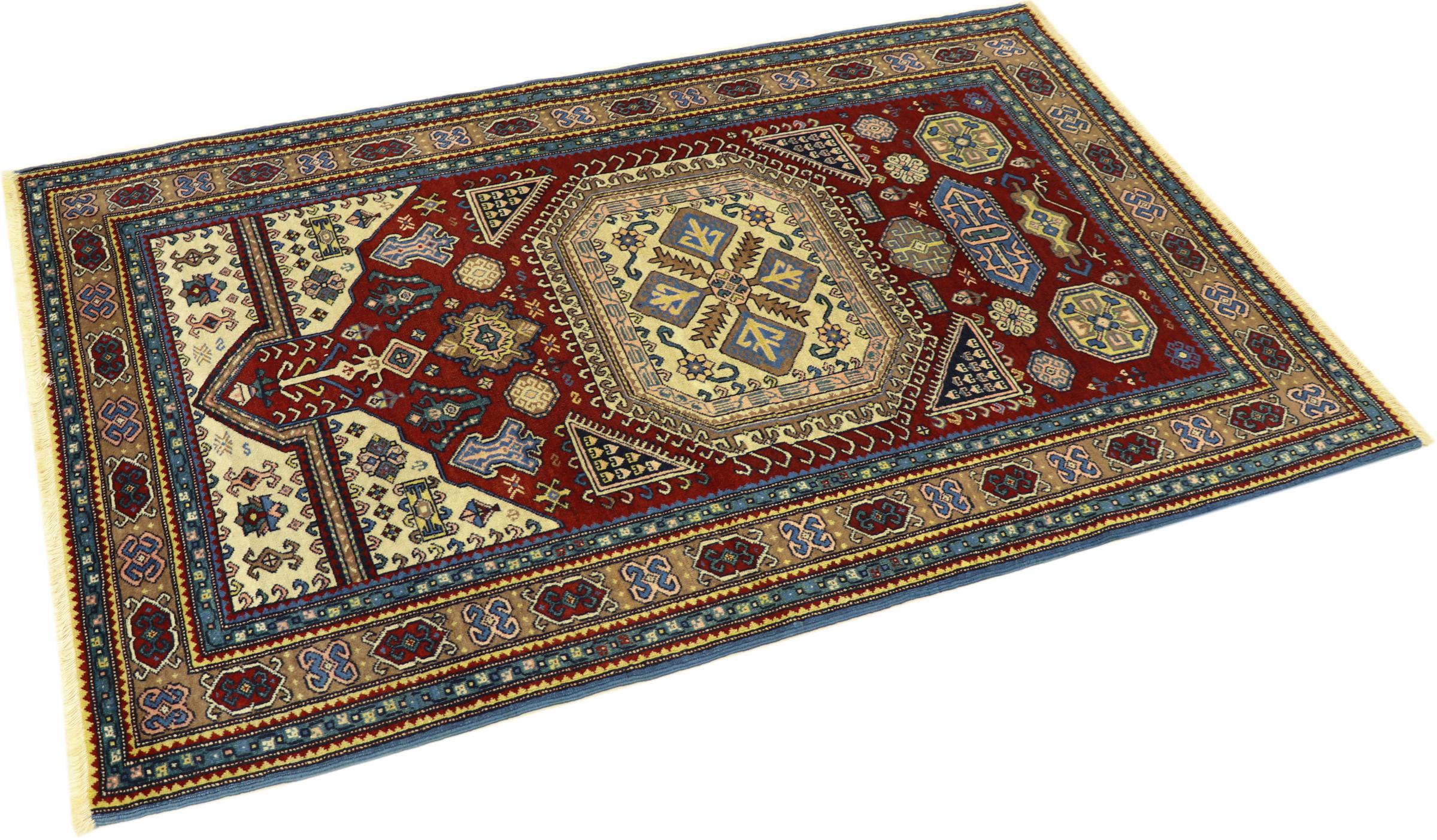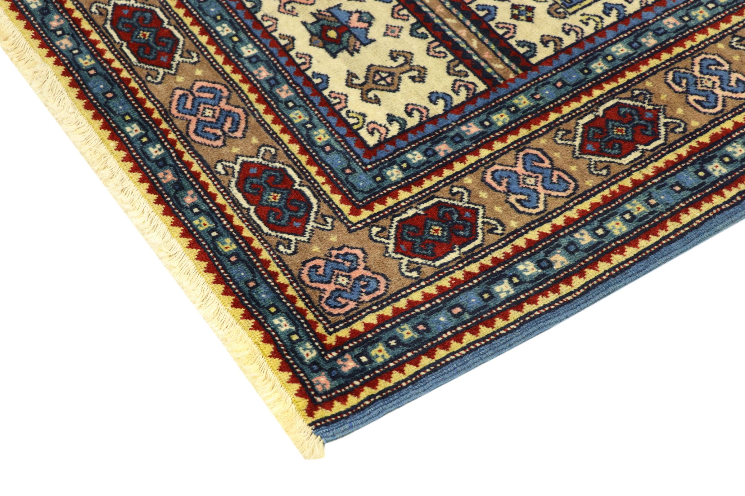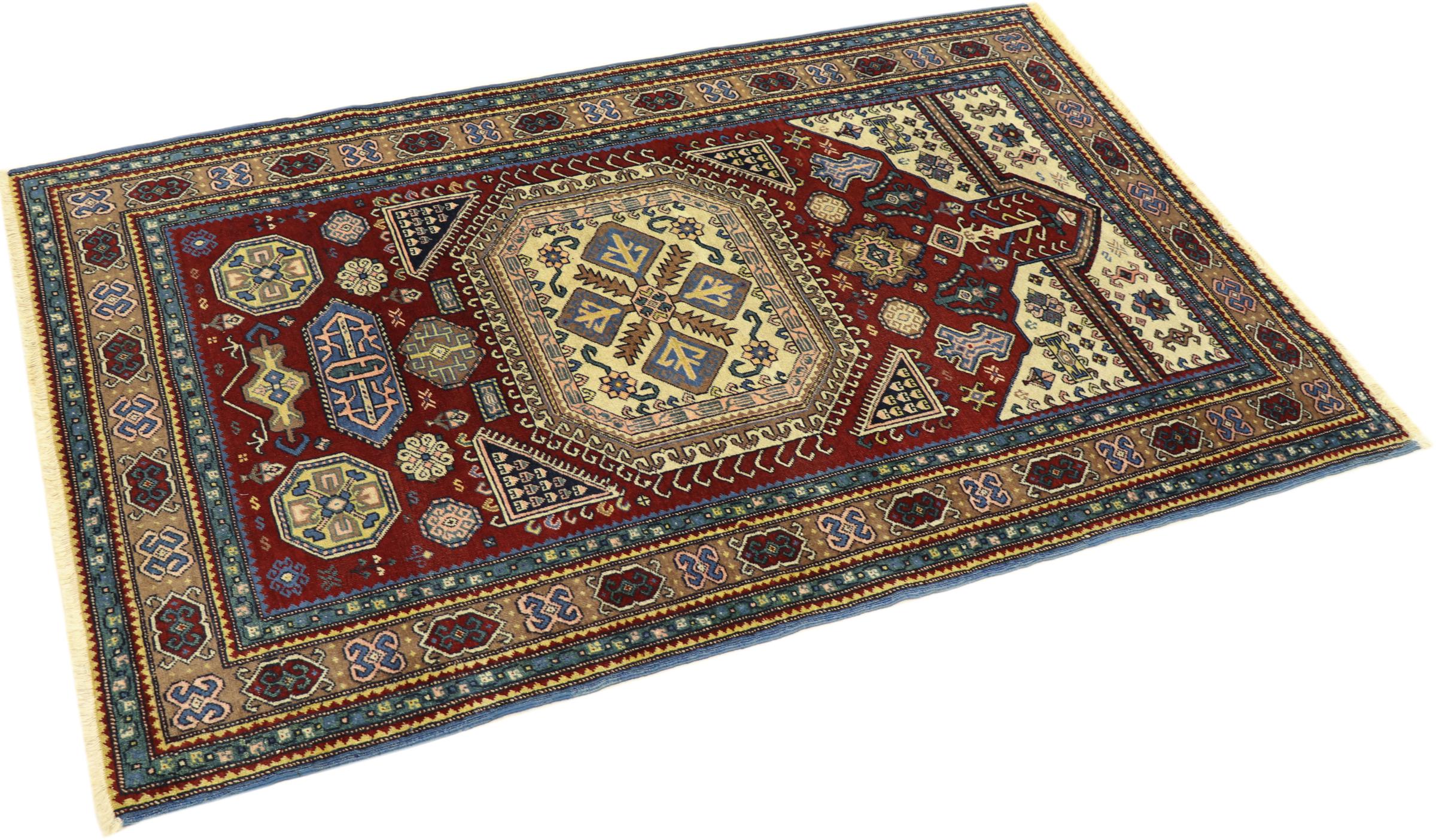 Esta alfombra Shirvan anudada a mano proveniente del Cáucaso oriental es muy robusta, y nos roba la mirada con sus hermosos colores y los elementos decorativos. Su denso anudado es el responsable de su alto rendimiento.