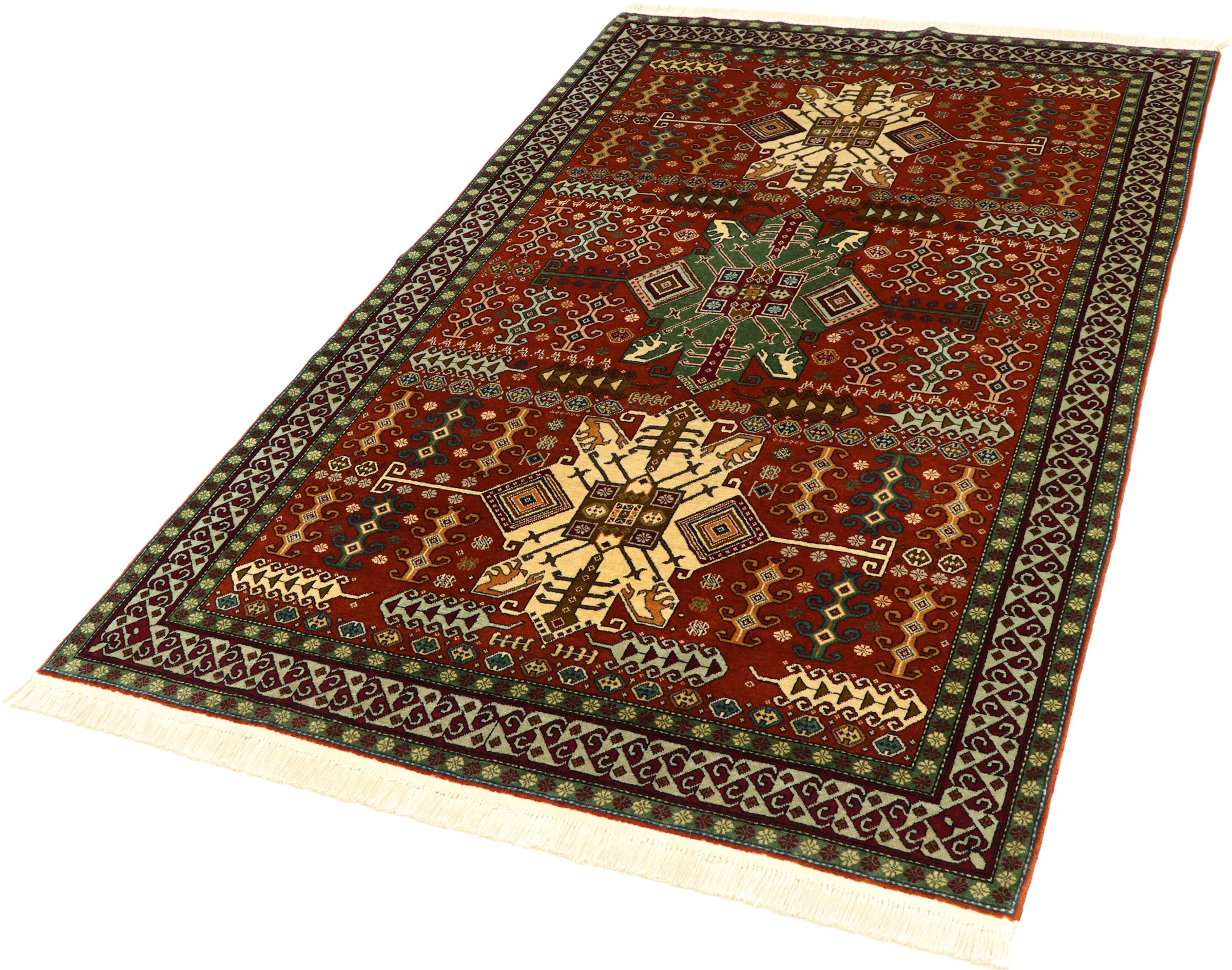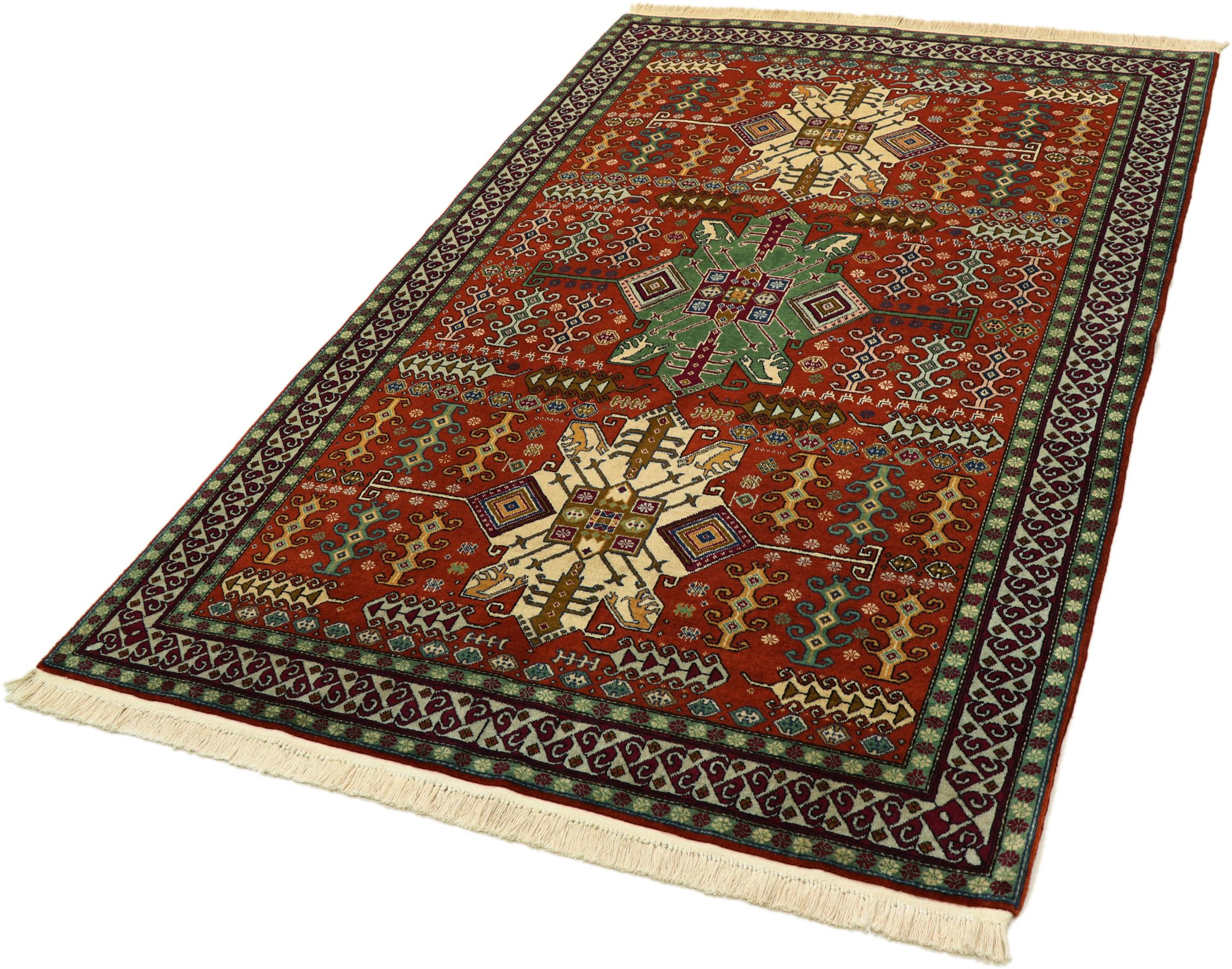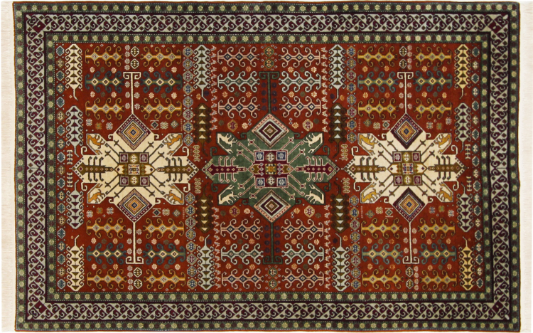 Esta alfombra Shirvan anudada a mano proveniente del Cáucaso oriental es muy robusta, y nos roba la mirada con sus hermosos colores y los elementos decorativos. Su denso anudado es el responsable de su alto rendimiento.