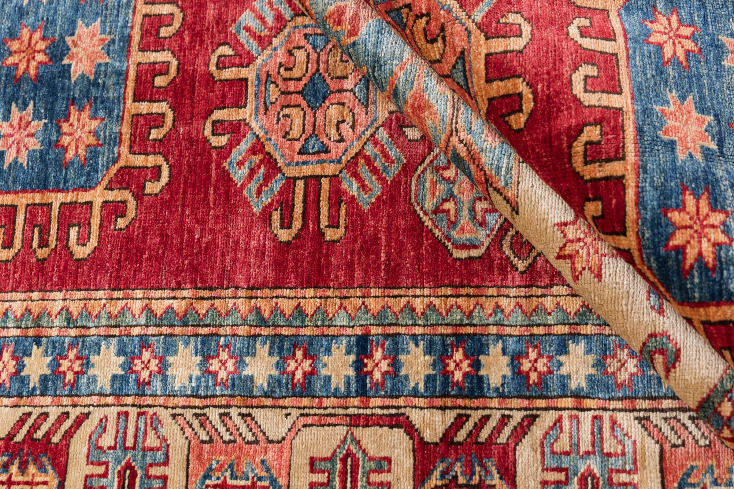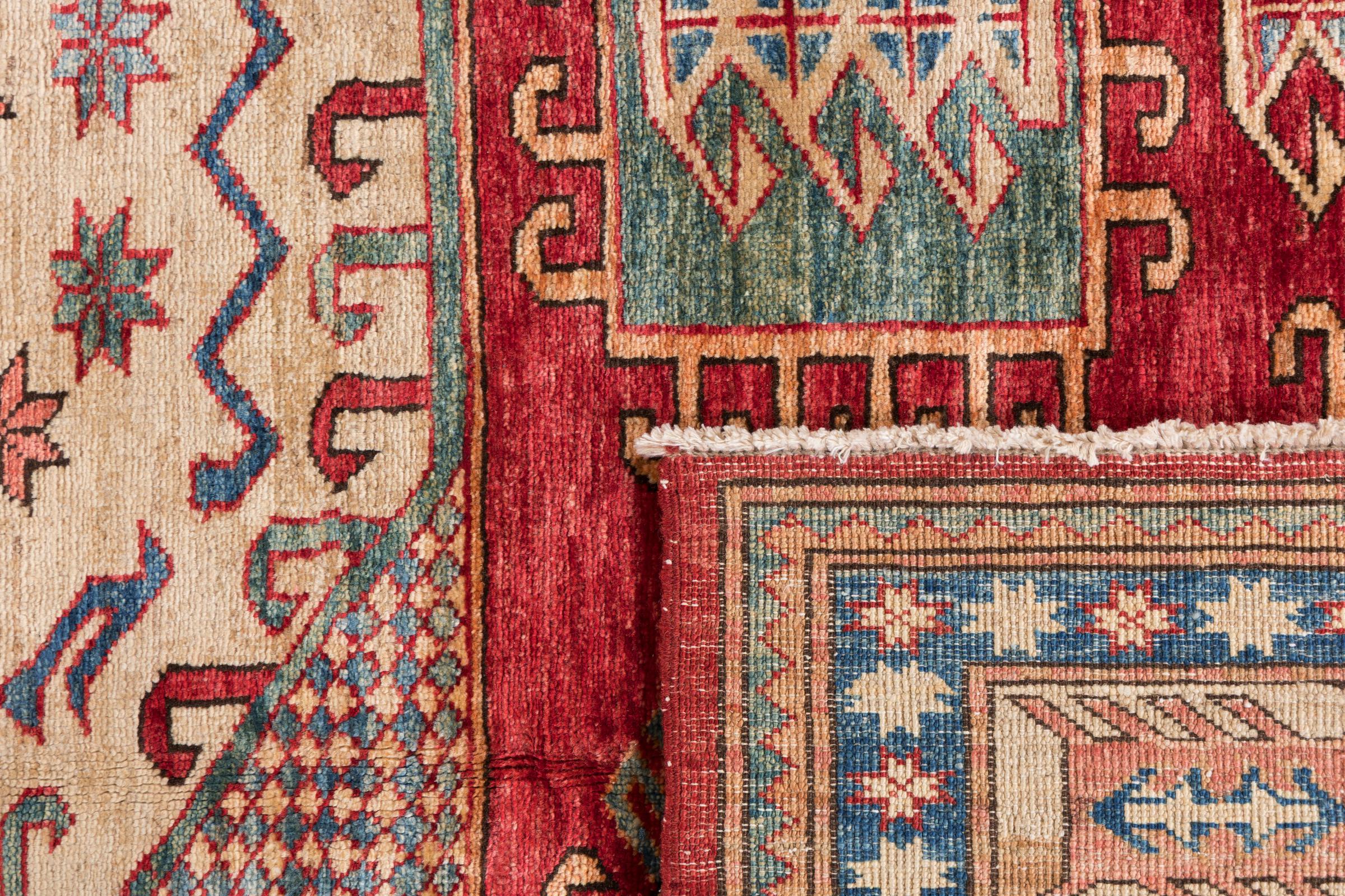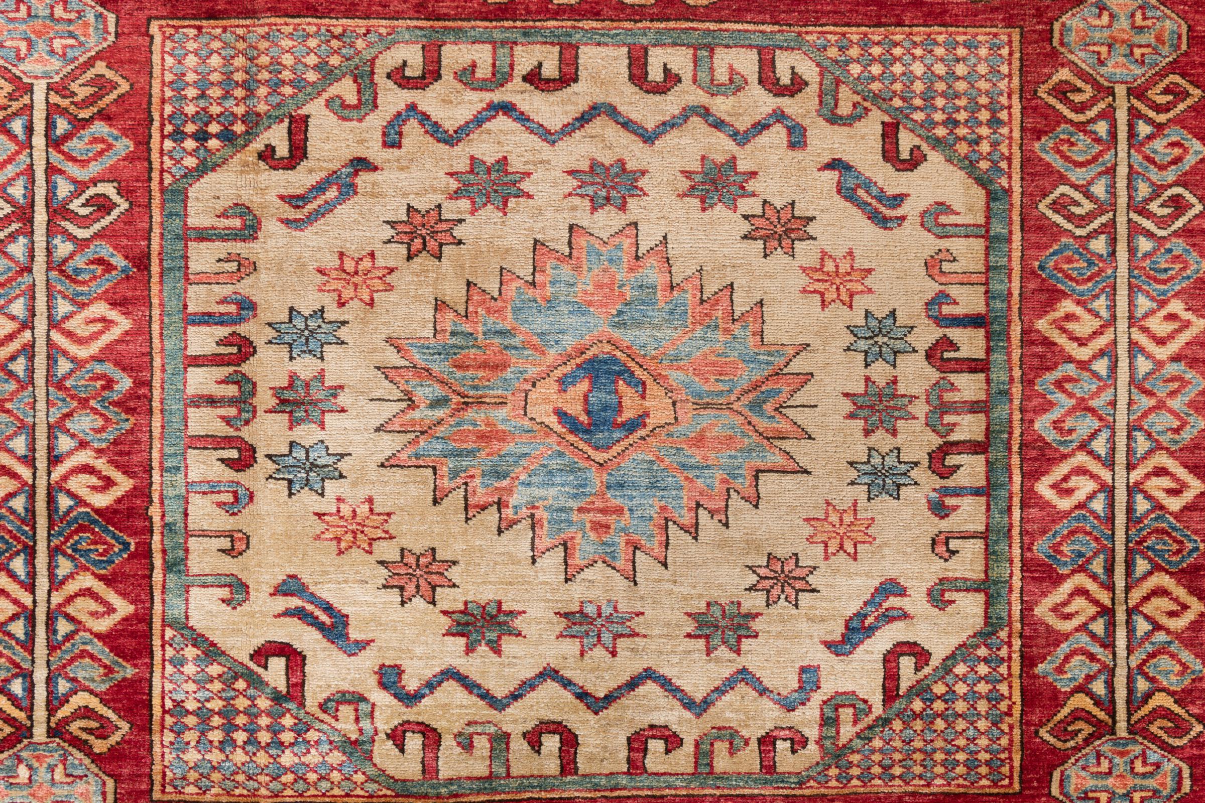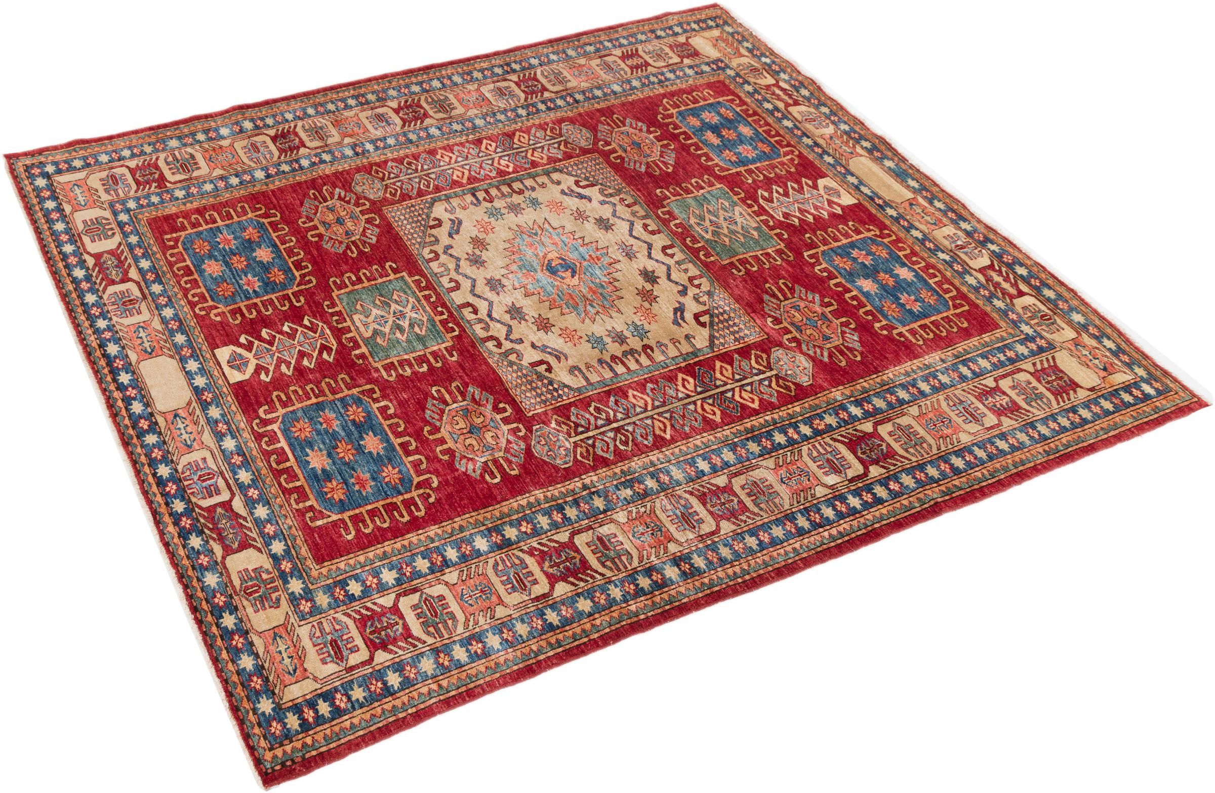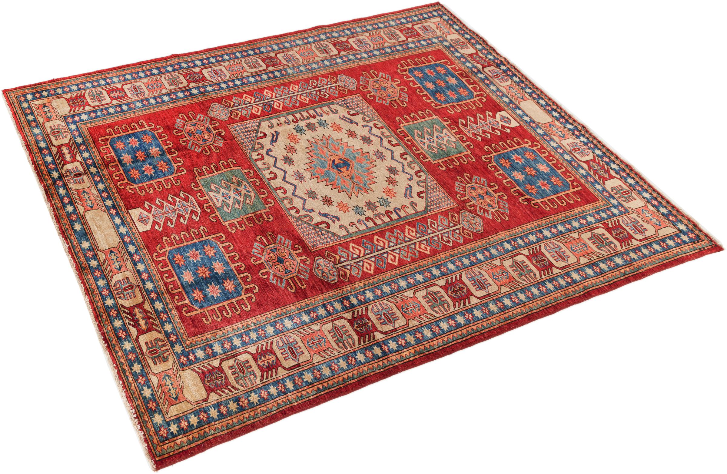 Esta alfombra Kazaka anudada a mano al estilo de las alfombras caucásicas convence por su gran robustez y sus vivos tonos. Así, refleja la cultura del Cáucaso en una bella composición. Una cultura que domina el arte de anudar alfombras desde hace siglos y que lo transmite al mundo exterior con formas encantadoramente sencillas en colores impresionantemente vivos.