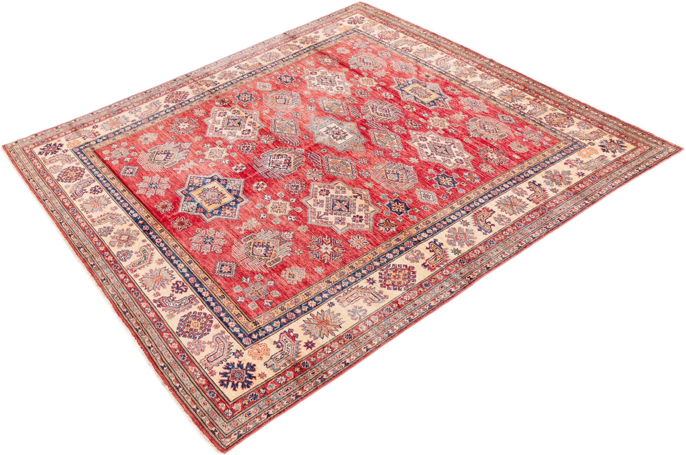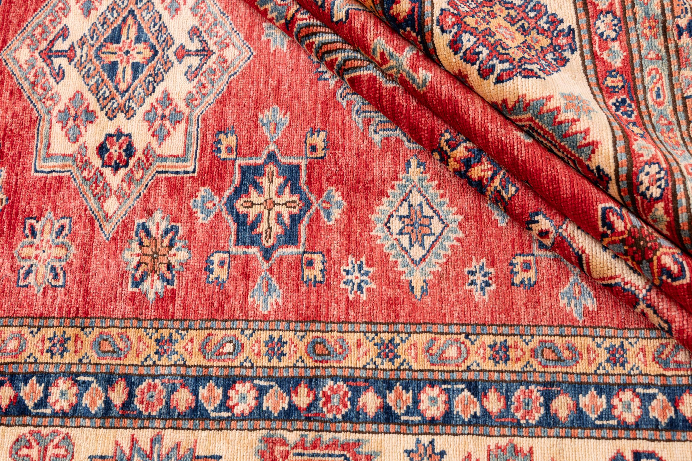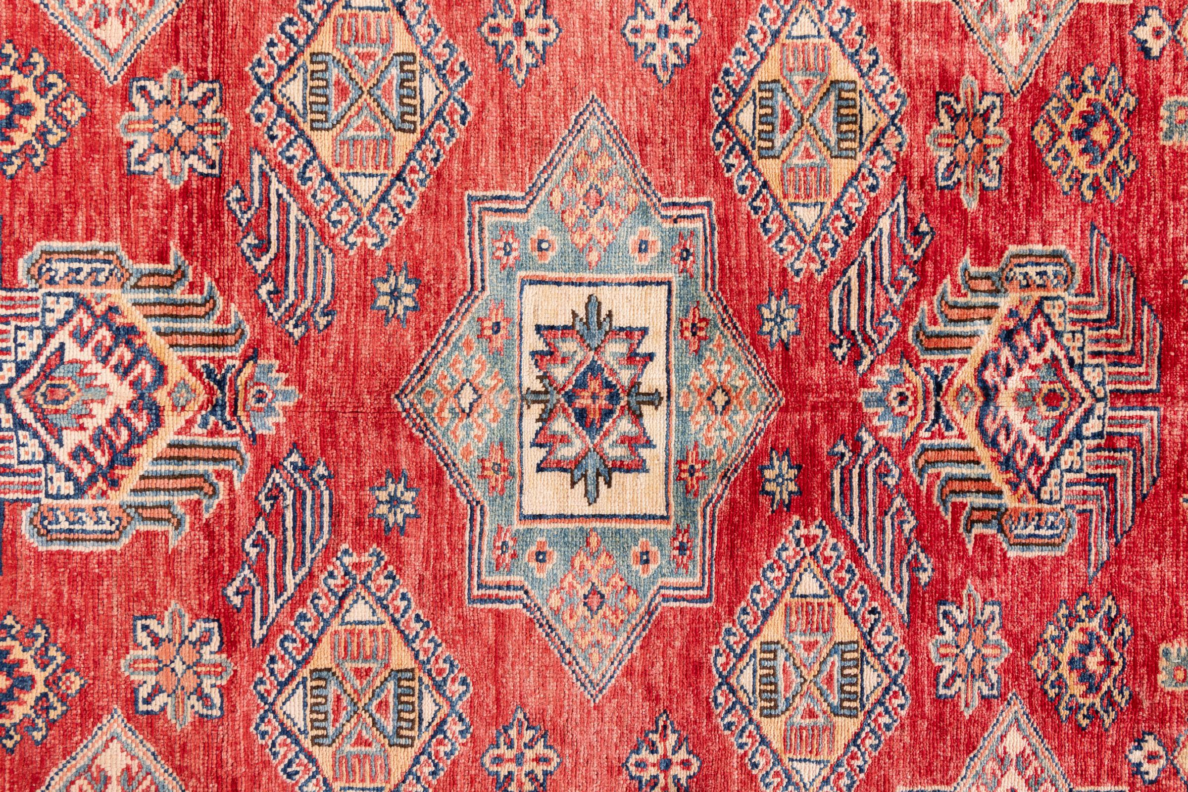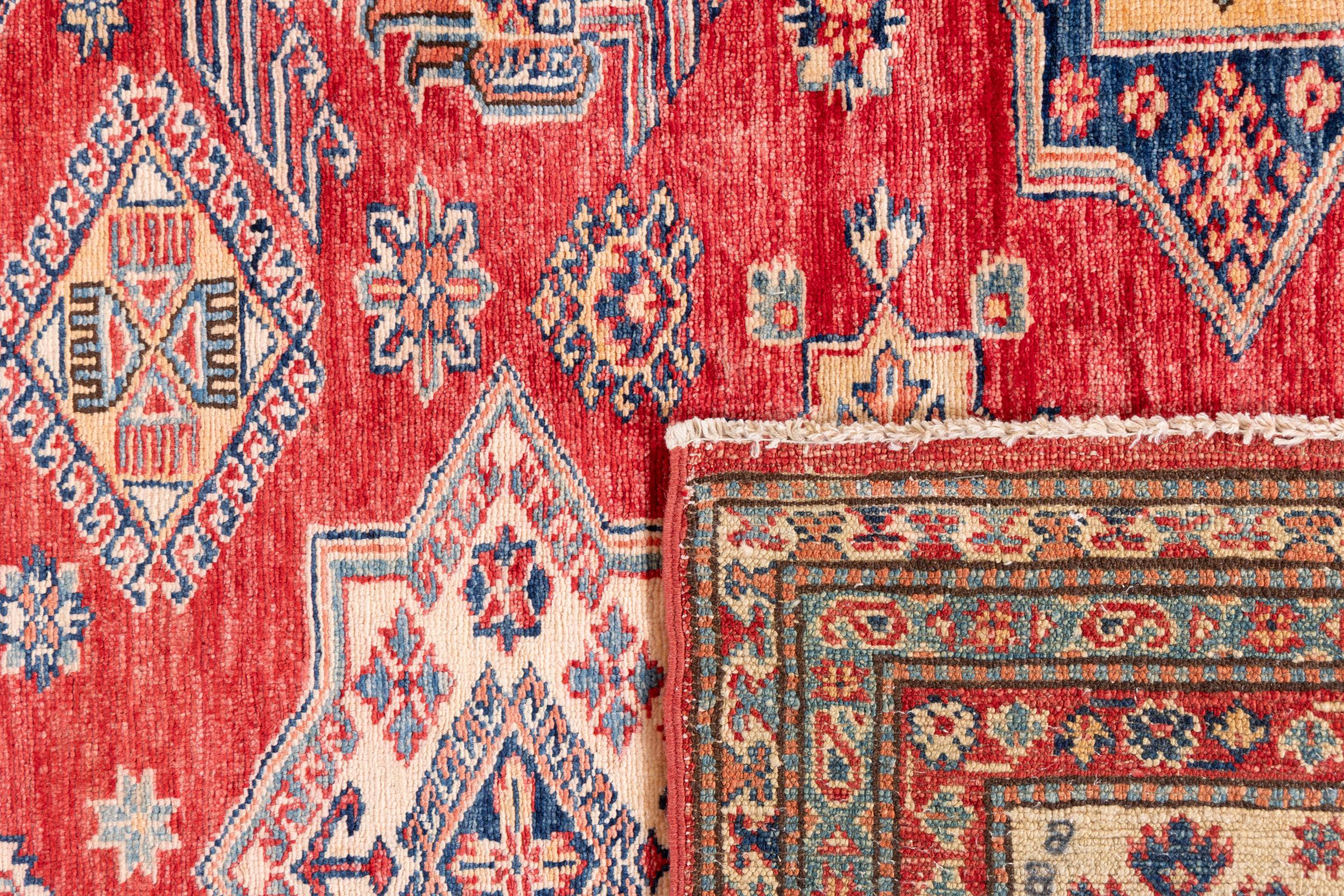 Esta alfombra Kazaka anudada a mano al estilo de las alfombras caucásicas convence por su gran robustez y sus vivos tonos. Así, refleja la cultura del Cáucaso en una bella composición. Una cultura que domina el arte de anudar alfombras desde hace siglos y que lo transmite al mundo exterior con formas encantadoramente sencillas en colores impresionantemente vivos.