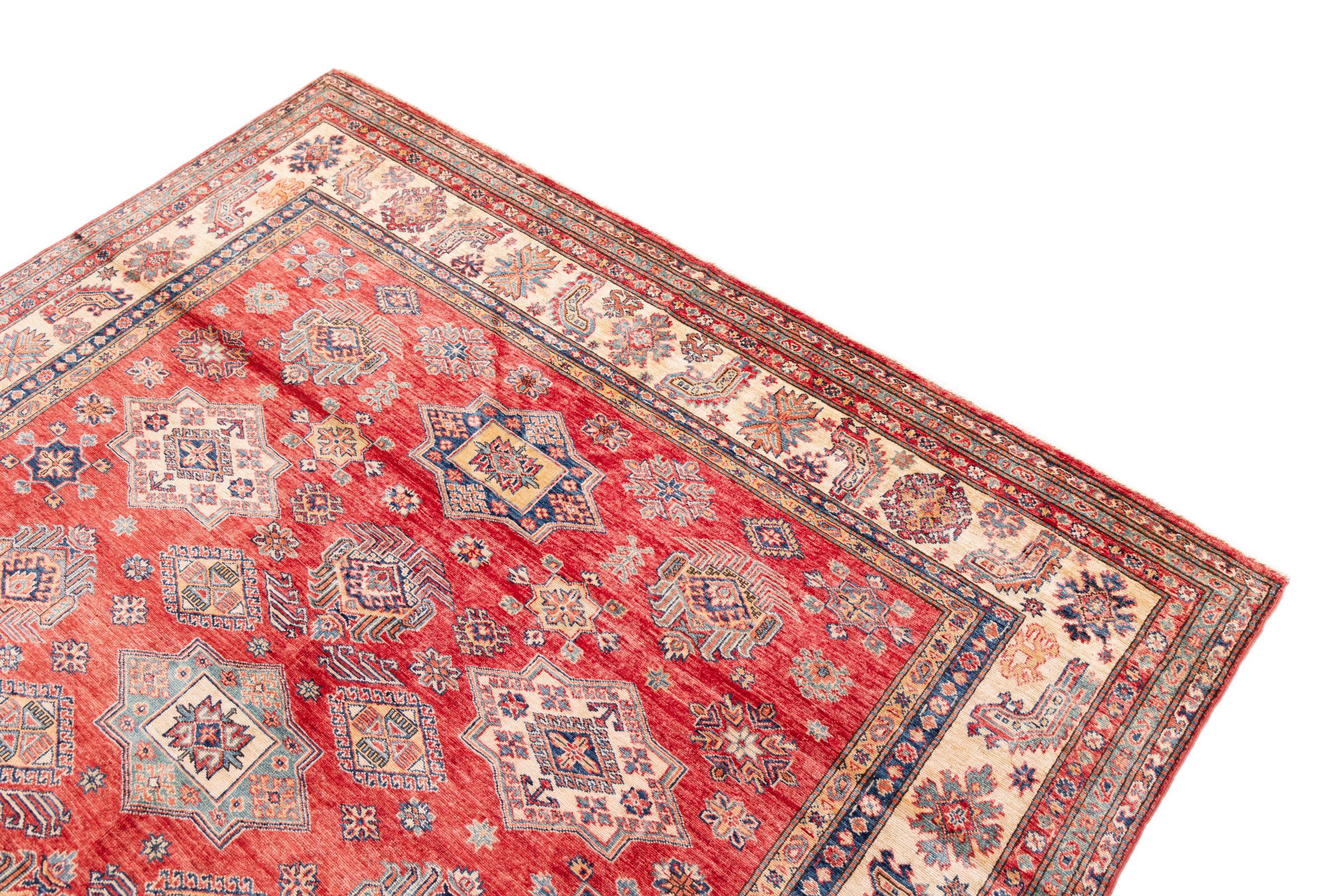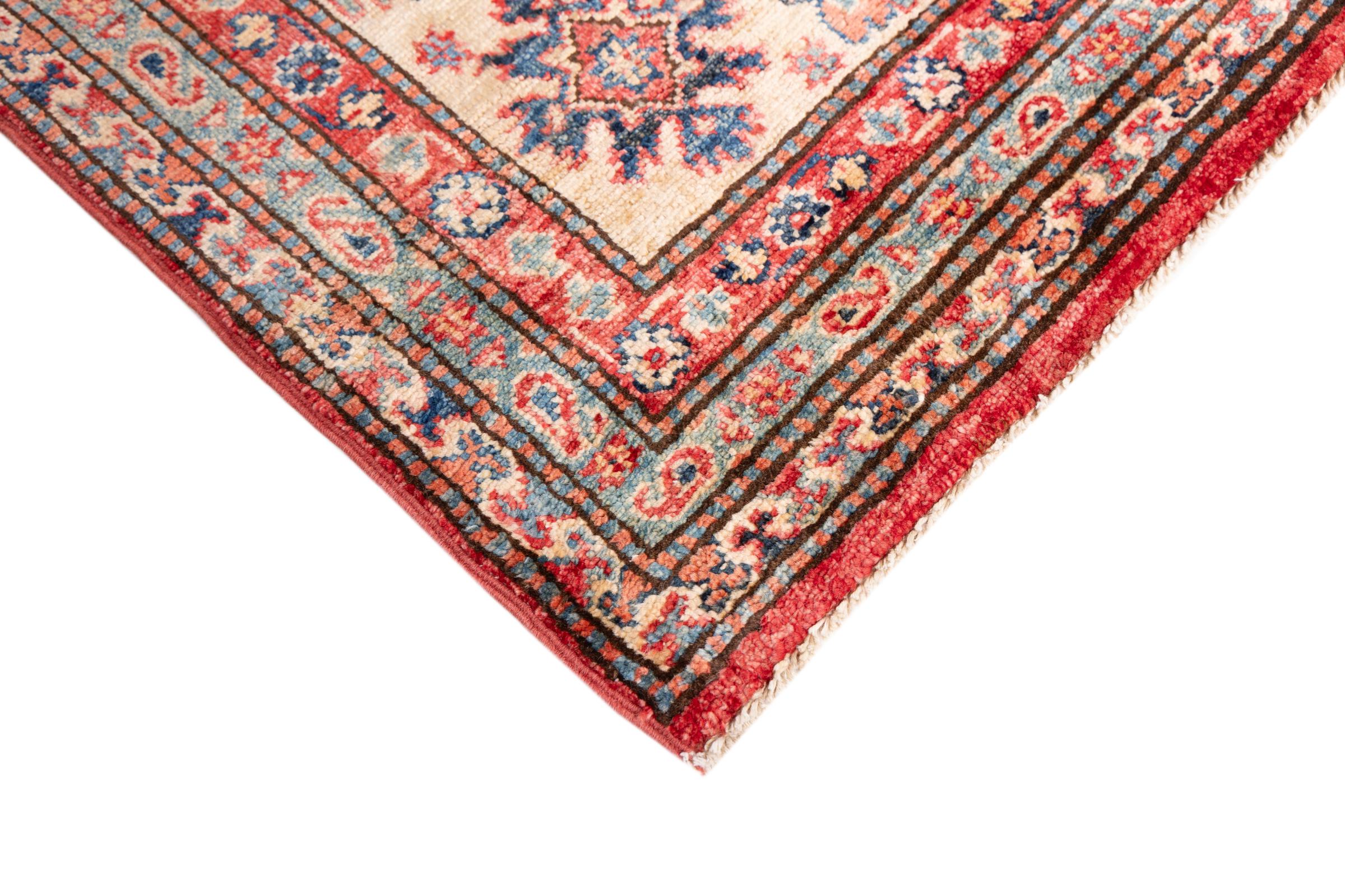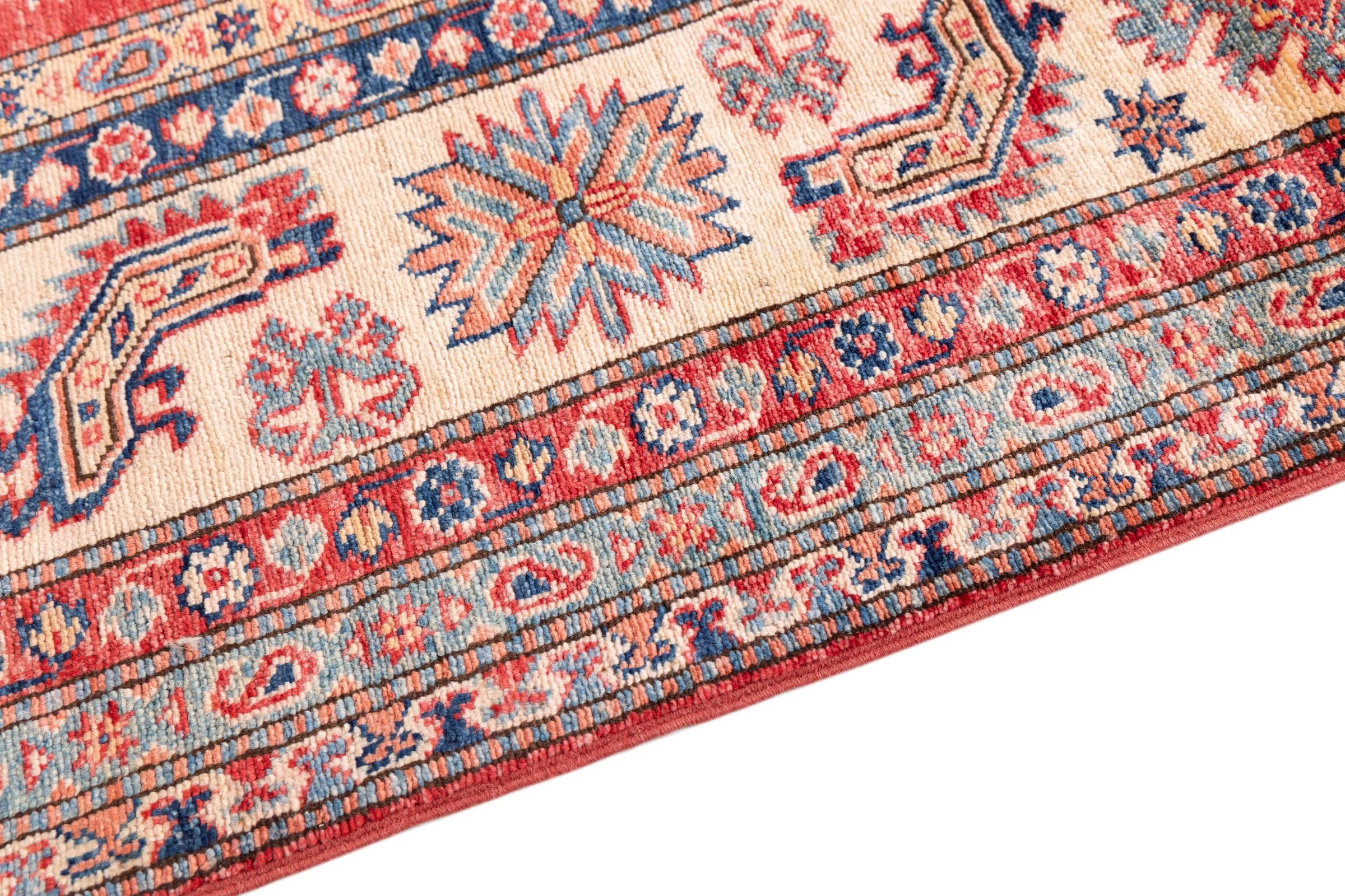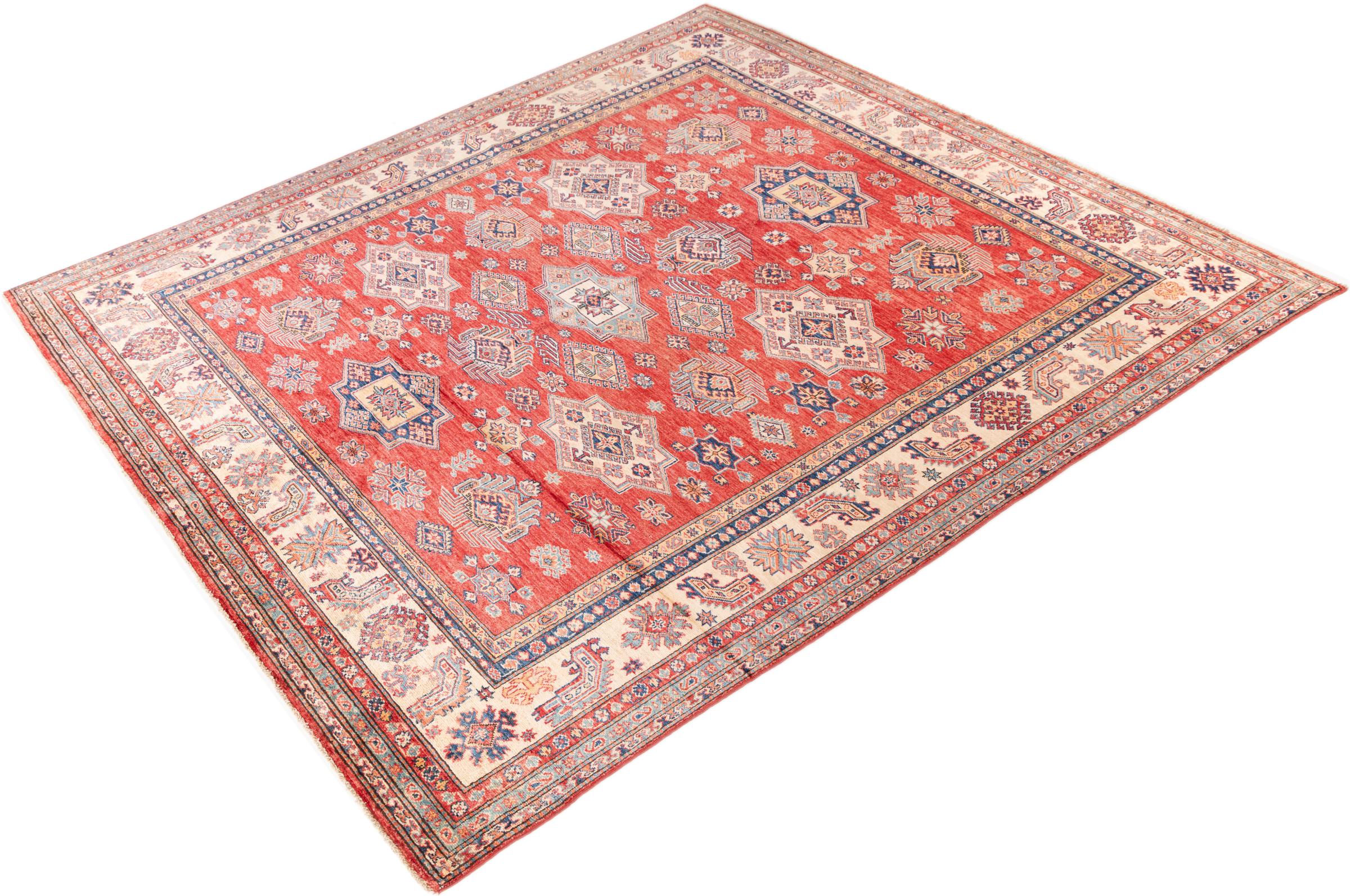 Esta alfombra Kazaka anudada a mano al estilo de las alfombras caucásicas convence por su gran robustez y sus vivos tonos. Así, refleja la cultura del Cáucaso en una bella composición. Una cultura que domina el arte de anudar alfombras desde hace siglos y que lo transmite al mundo exterior con formas encantadoramente sencillas en colores impresionantemente vivos.