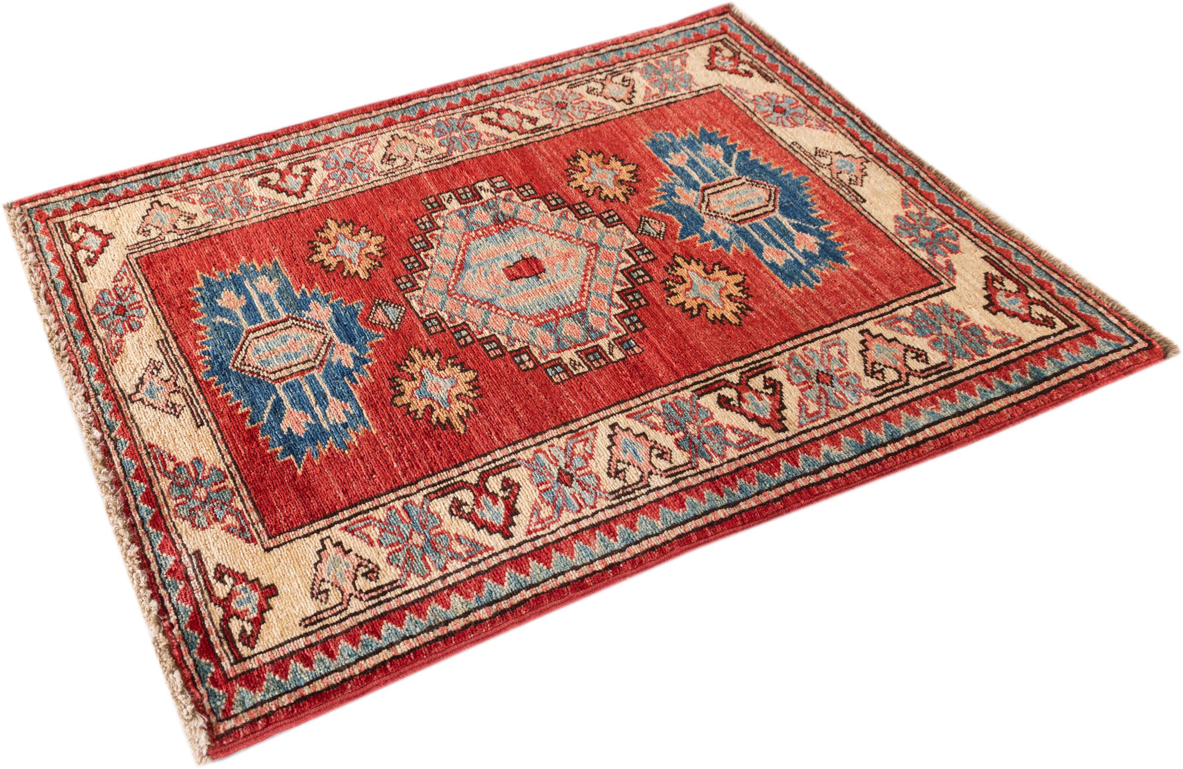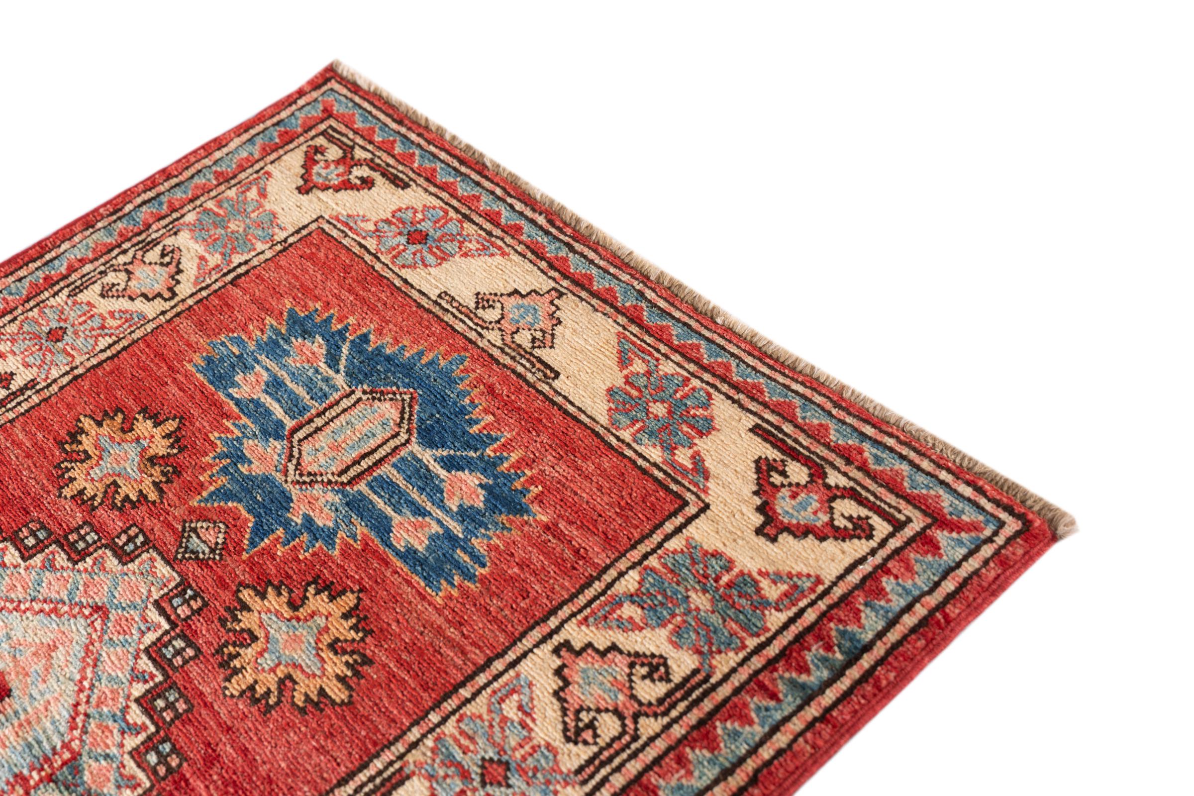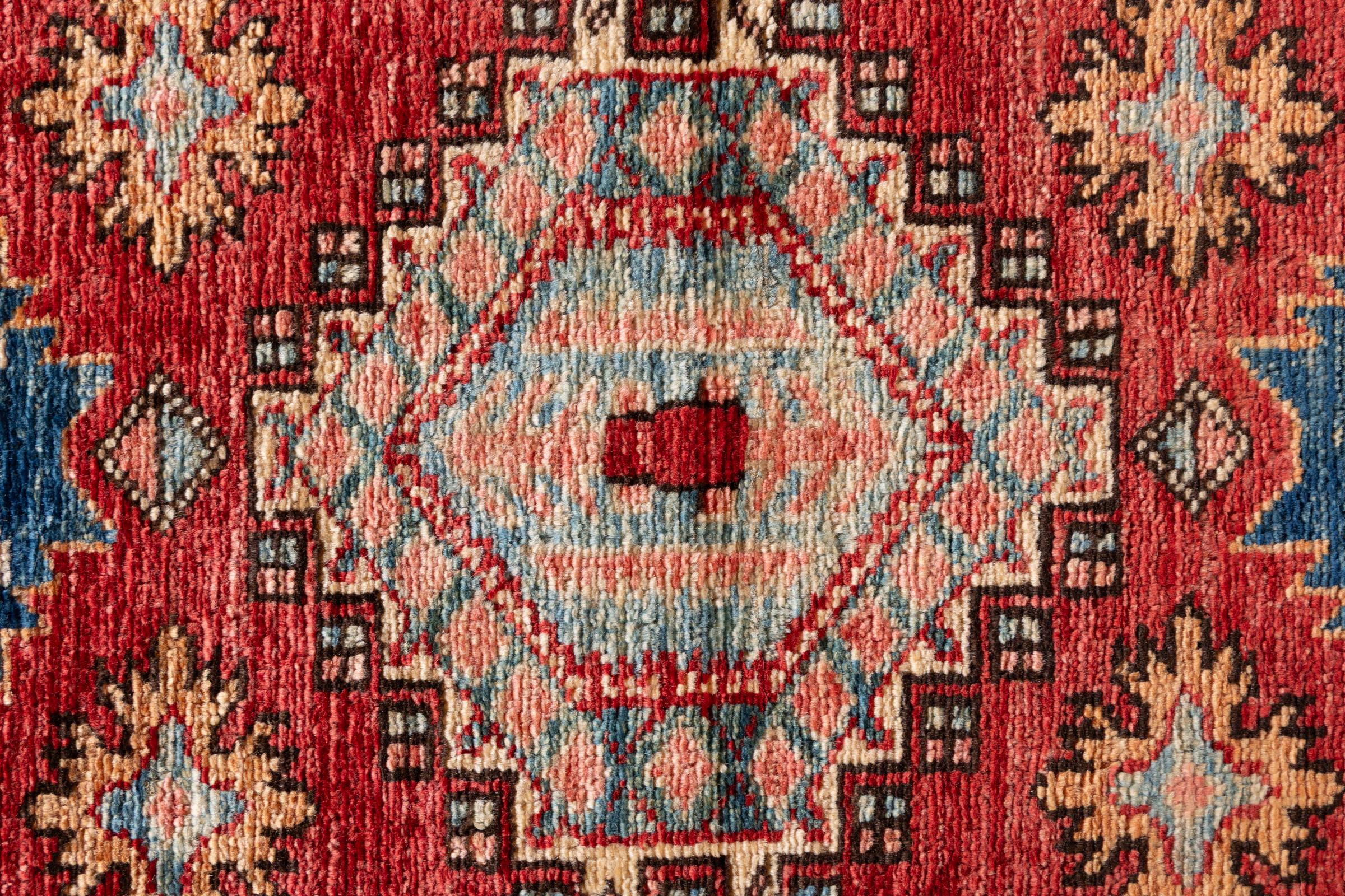 Esta alfombra Kazaka anudada a mano al estilo de las alfombras caucásicas convence por su gran robustez y sus vivos tonos. Así, refleja la cultura del Cáucaso en una bella composición. Una cultura que domina el arte de anudar alfombras desde hace siglos y que lo transmite al mundo exterior con formas encantadoramente sencillas en colores impresionantemente vivos.