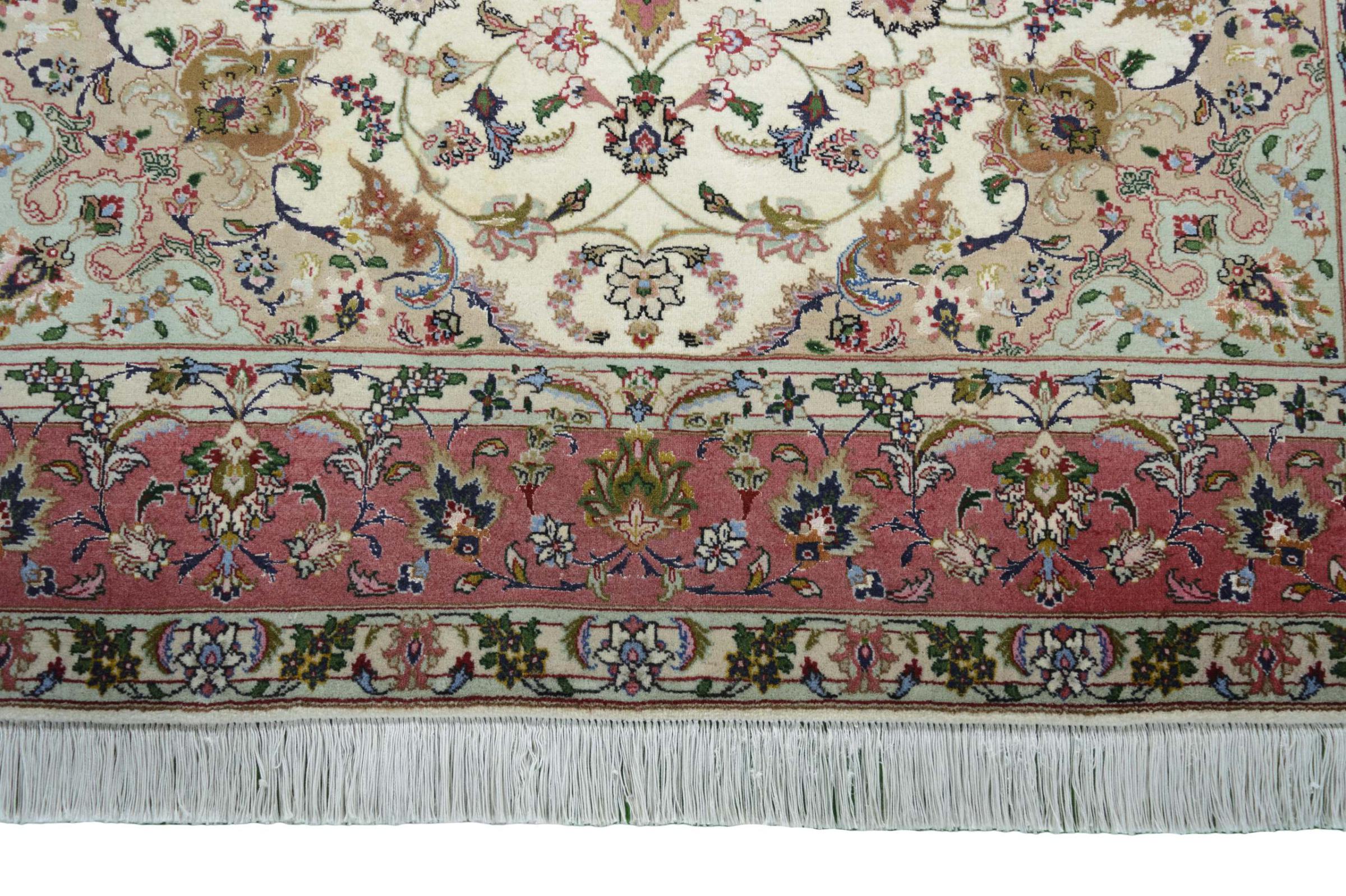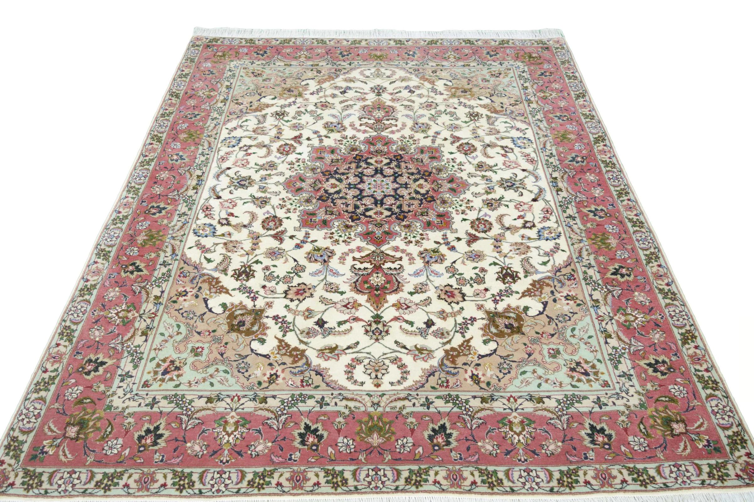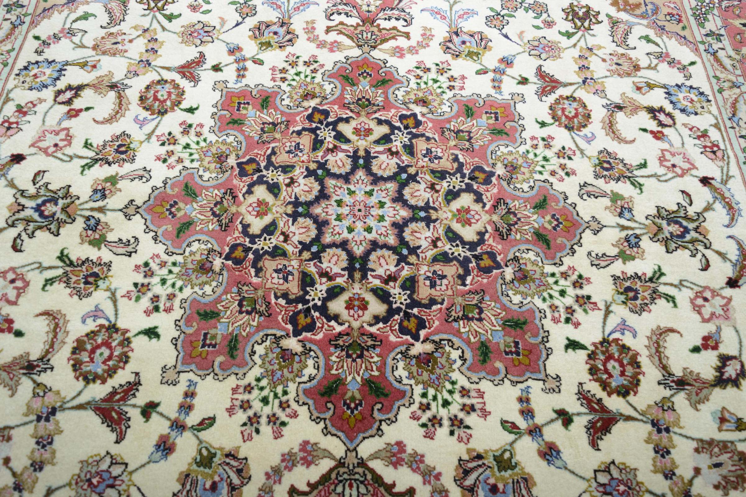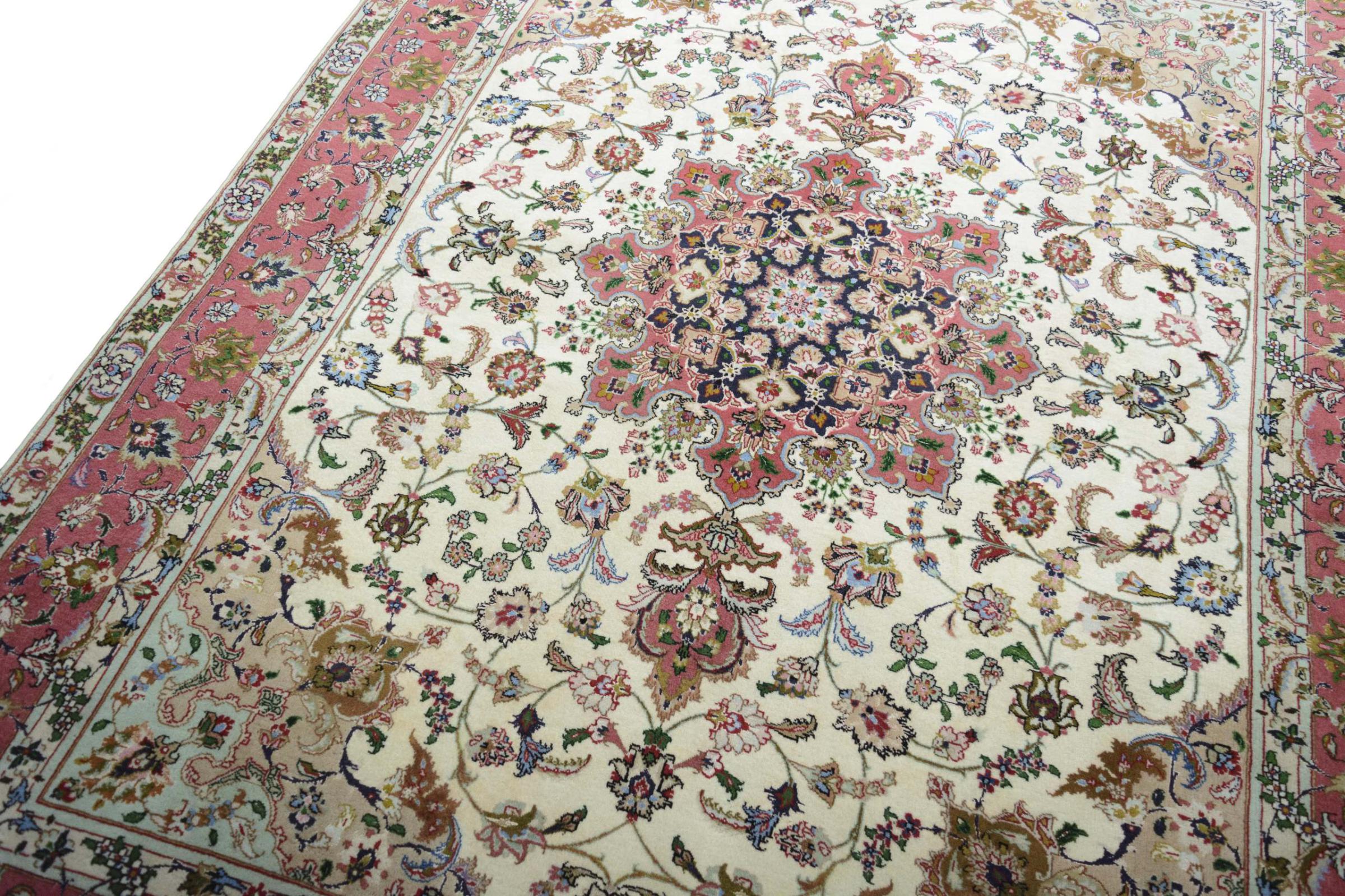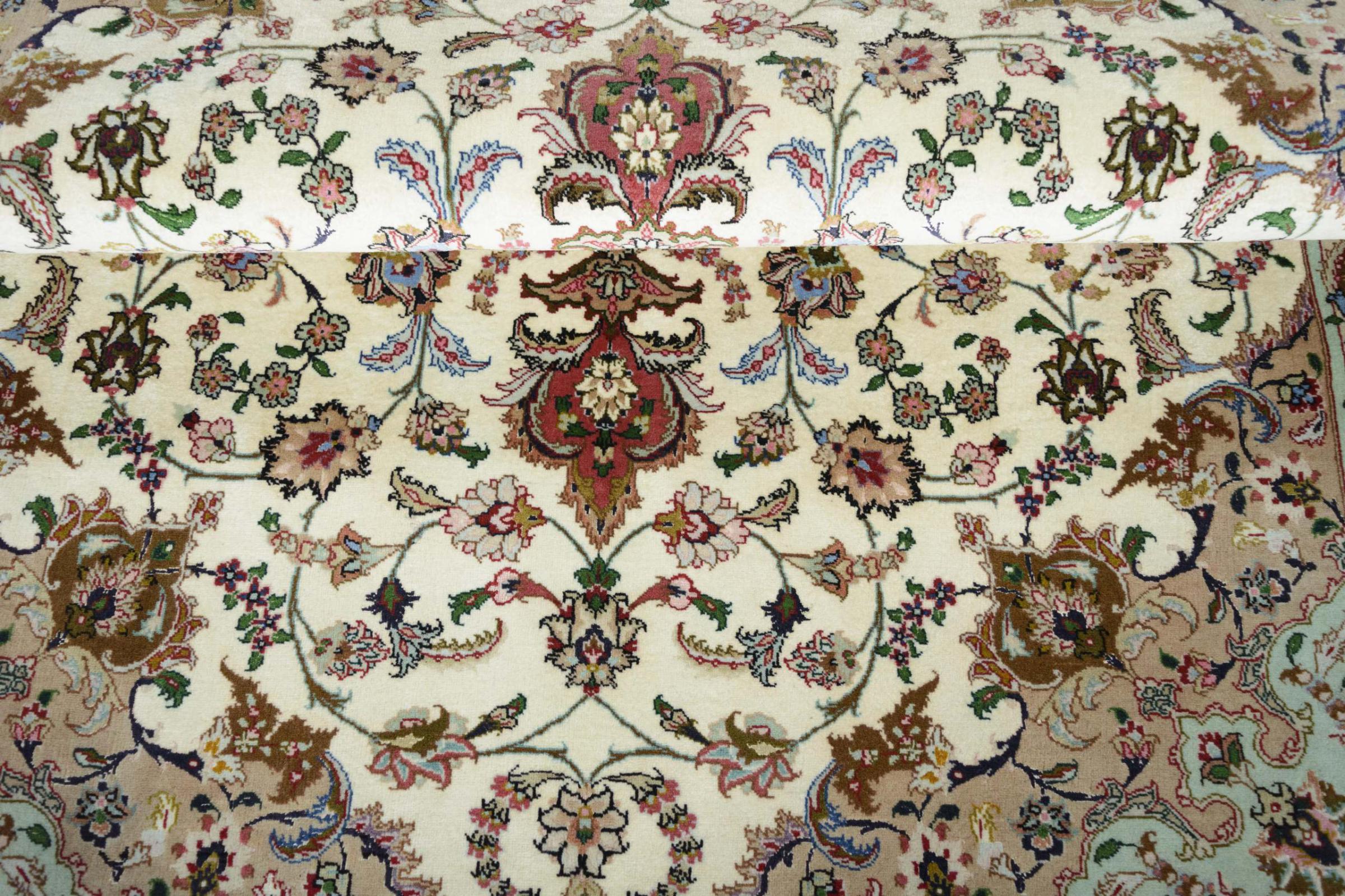 Este Tabriz se anudó a mano en el noroeste de Irán, en la ciudad artesanal y epónima de Tabriz. Sólo se utilizaron lana de alta calidad y seda natural. Con sus motivos y elementos decorativos, refleja Oriente en su forma más bella. Las alfombras de Tabriz son muy conocidas y populares. El número de raj indica el número de nudos en una longitud de 7 cm. Por ejemplo, una Tabriz 60Raj tiene unos 700.000 nudos por metro cuadrado.