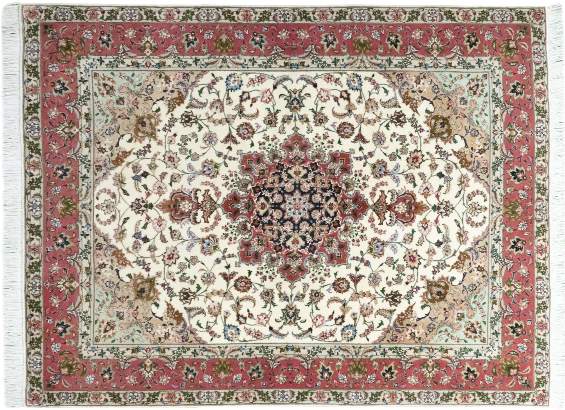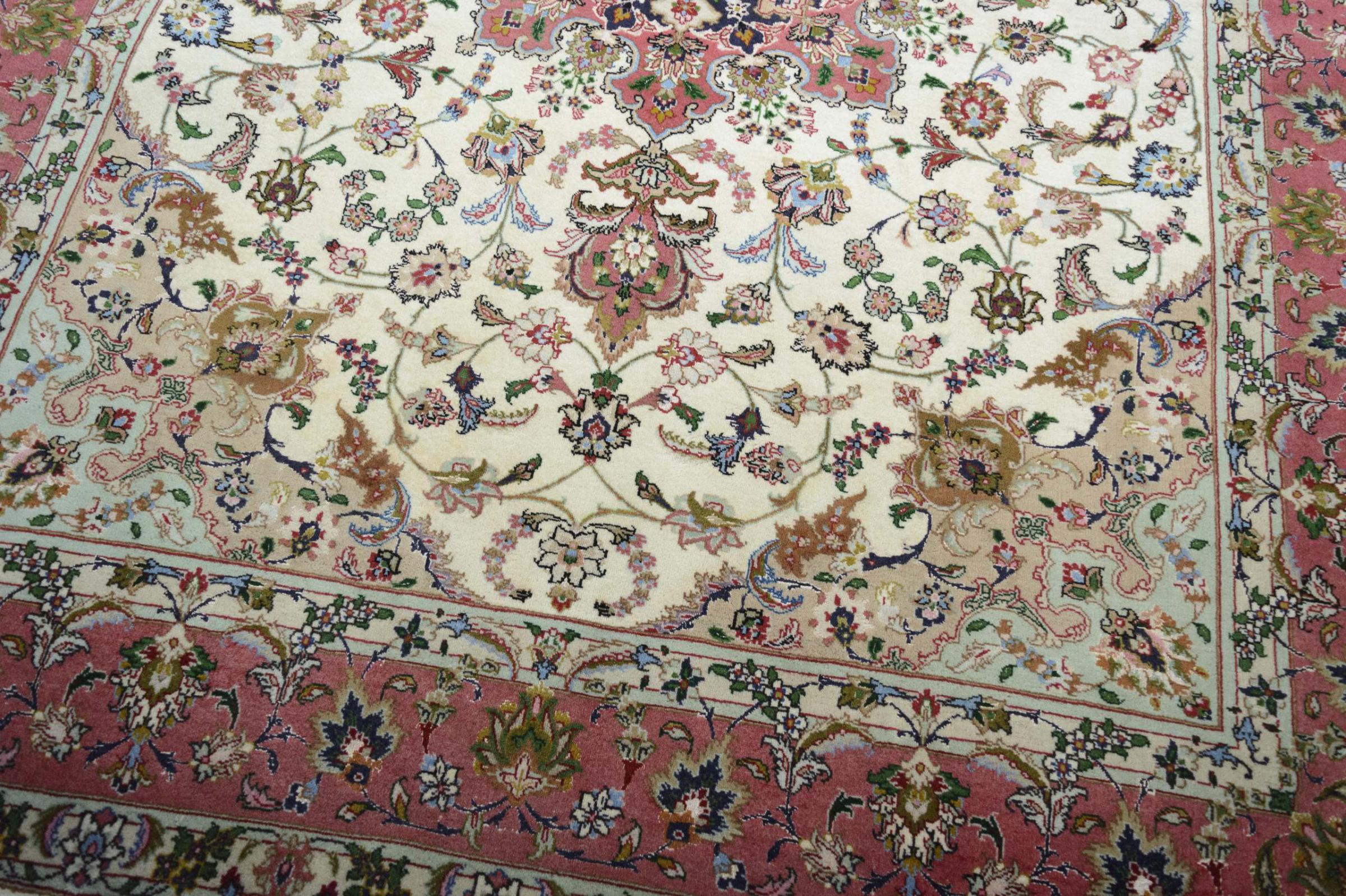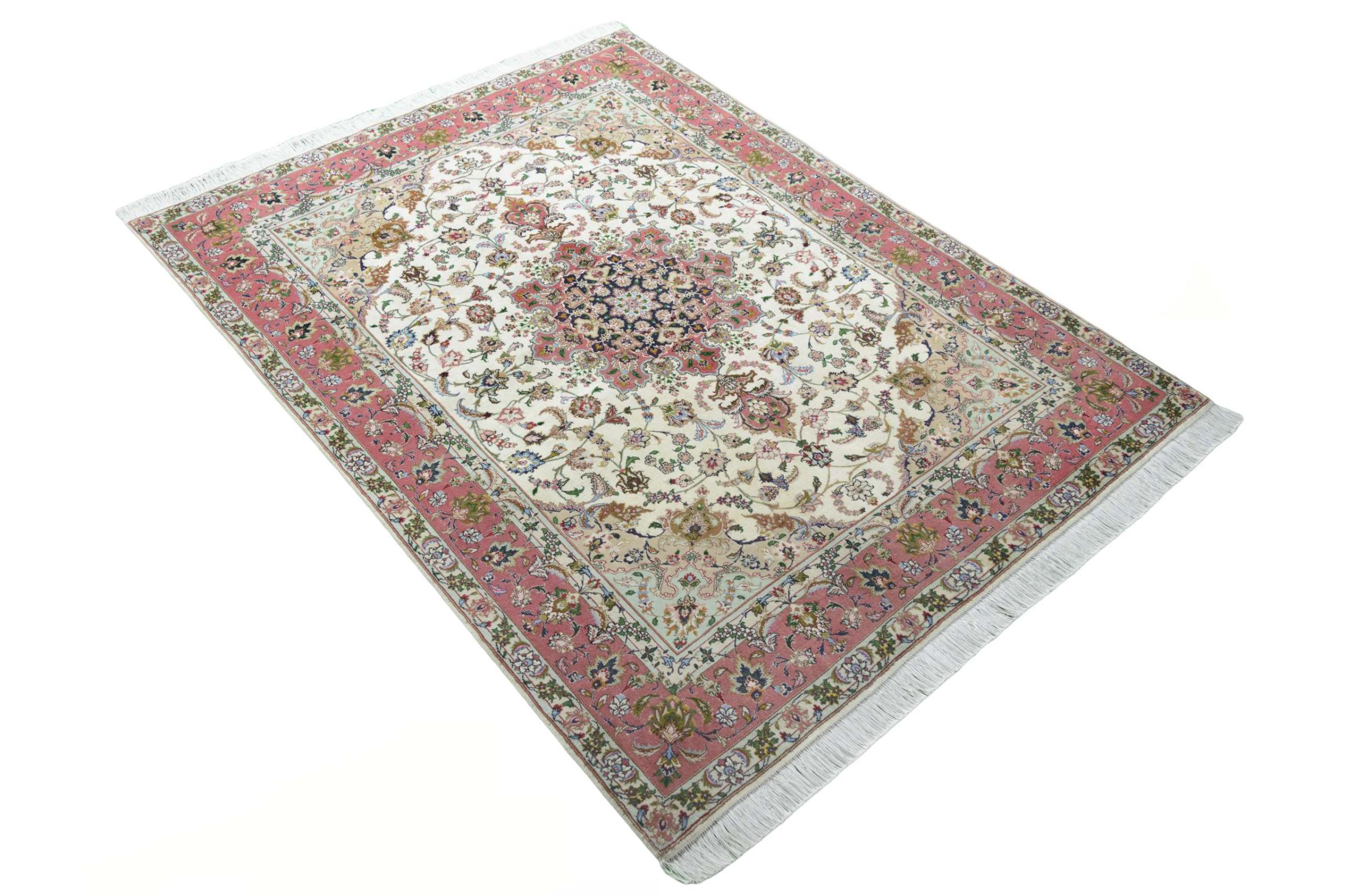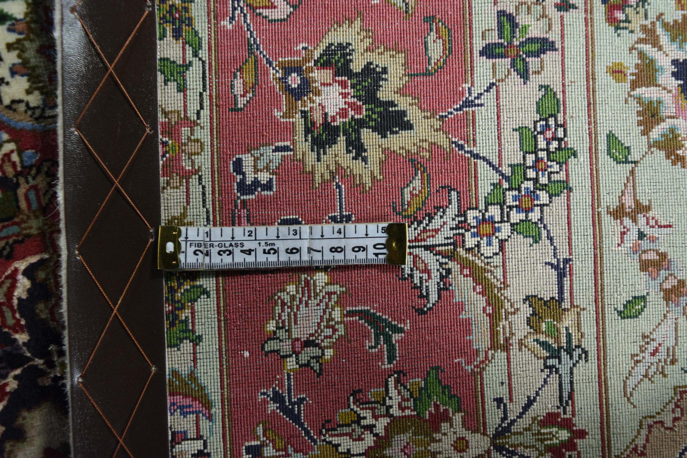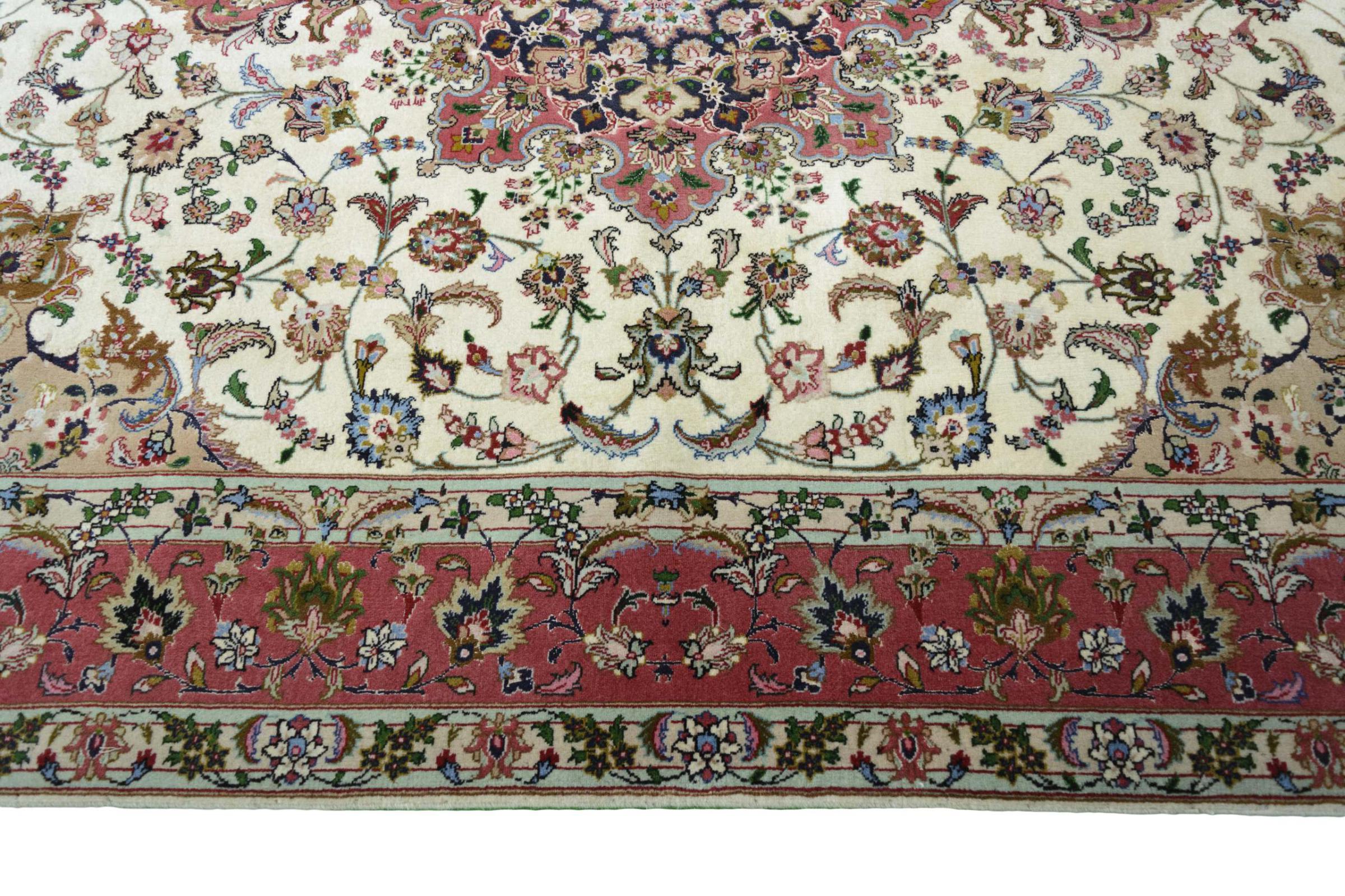 Este Tabriz se anudó a mano en el noroeste de Irán, en la ciudad artesanal y epónima de Tabriz. Sólo se utilizaron lana de alta calidad y seda natural. Con sus motivos y elementos decorativos, refleja Oriente en su forma más bella. Las alfombras de Tabriz son muy conocidas y populares. El número de raj indica el número de nudos en una longitud de 7 cm. Por ejemplo, una Tabriz 60Raj tiene unos 700.000 nudos por metro cuadrado.