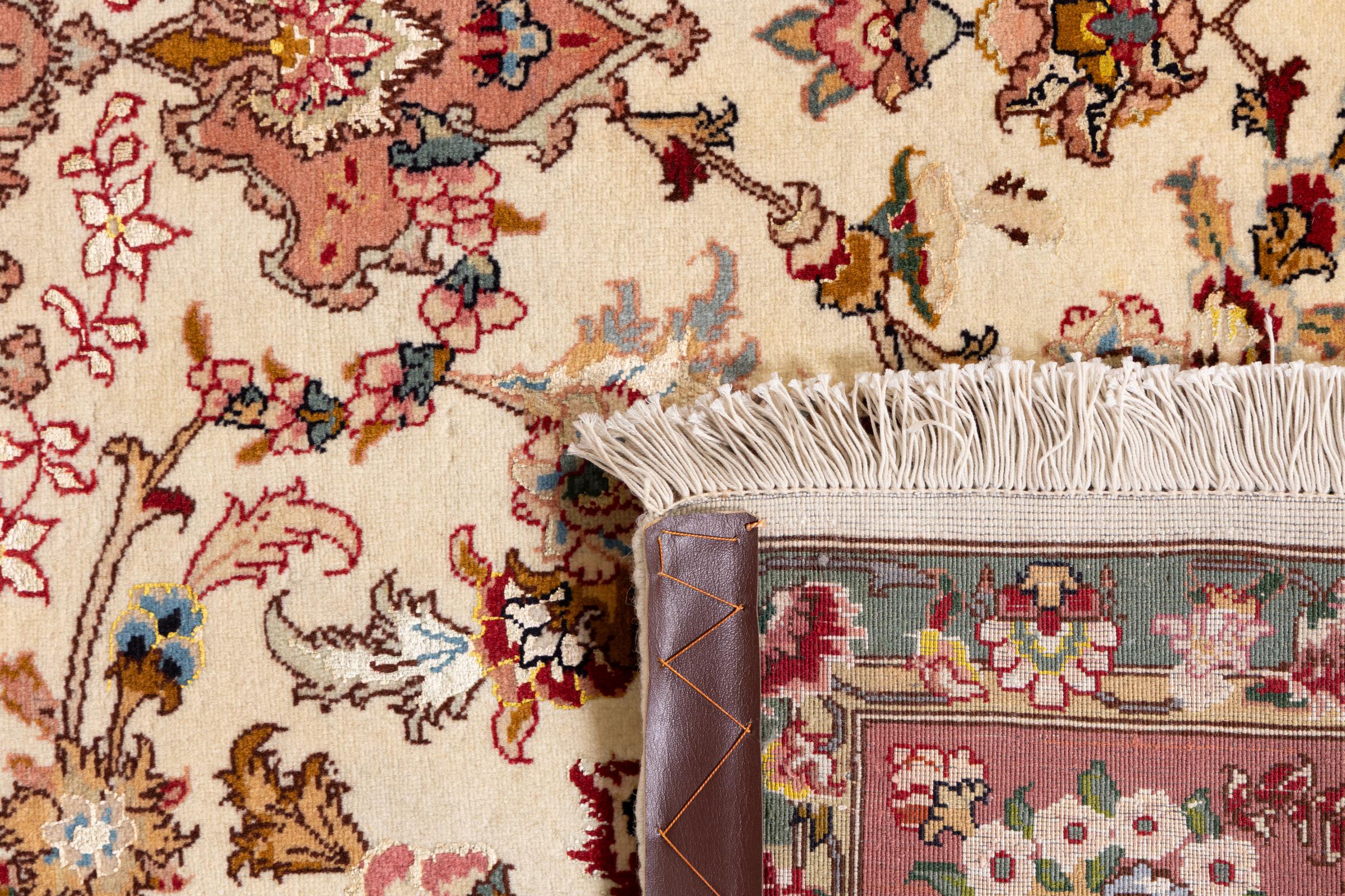 Este Tabriz se anudó a mano en el noroeste de Irán, en la ciudad artesanal y epónima de Tabriz. Sólo se utilizaron lana de alta calidad y seda natural. Con sus motivos y elementos decorativos, refleja Oriente en su forma más bella. Deje que una obra de arte se abra camino en su hogar: Una verdadera atracción para usted y sus invitados. El número Raj indica el número de nudos en una longitud de 7 cm. Una Tabriz 50Raj, por ejemplo, tiene aproximadamente 500.000 nudos por m2, una 70Raj incluso aprox. 1.000.000 de nudos por m2.