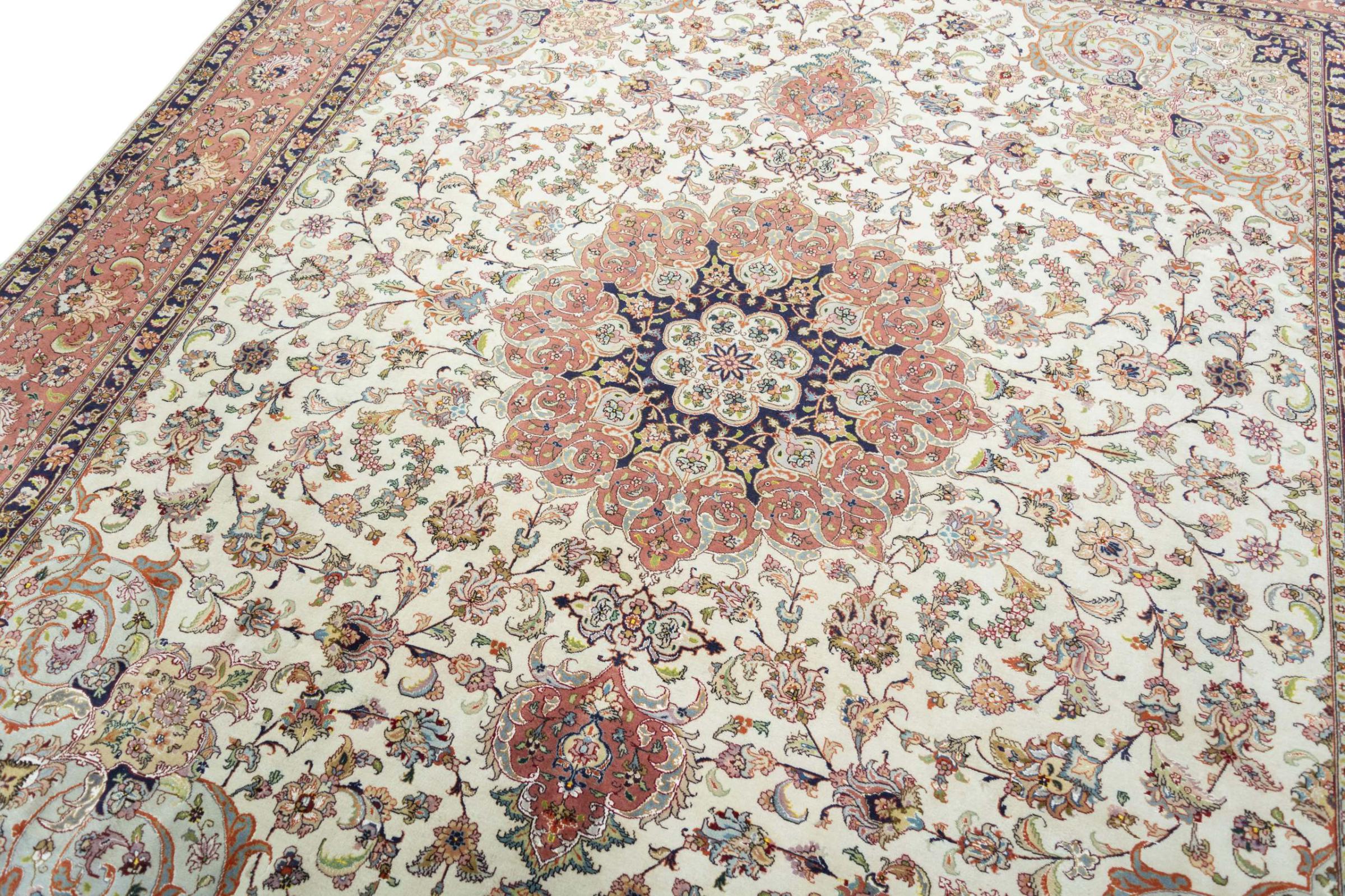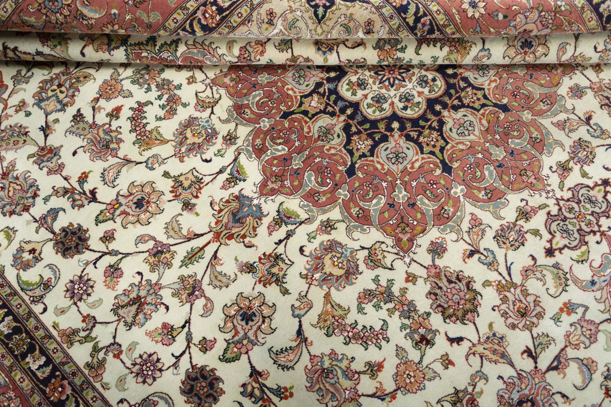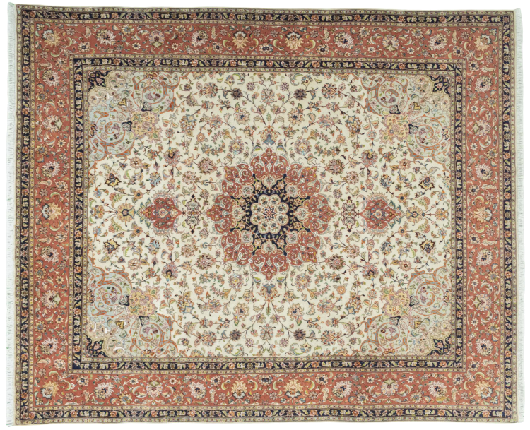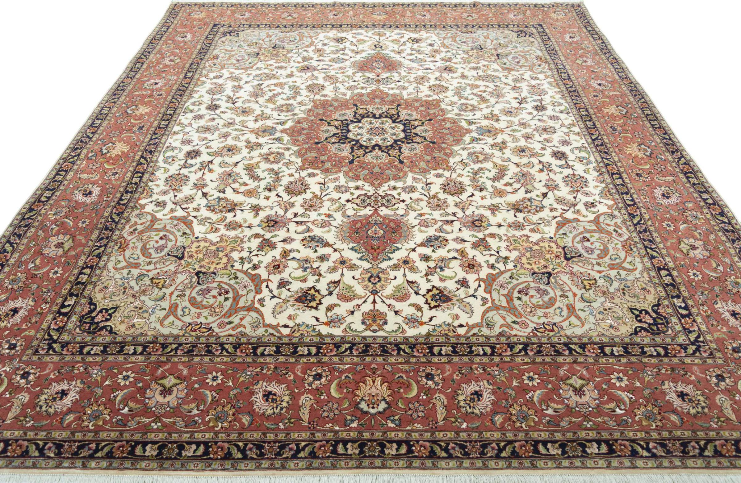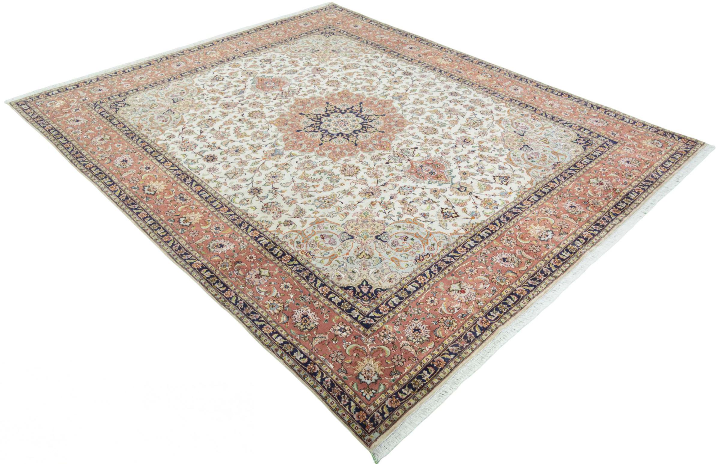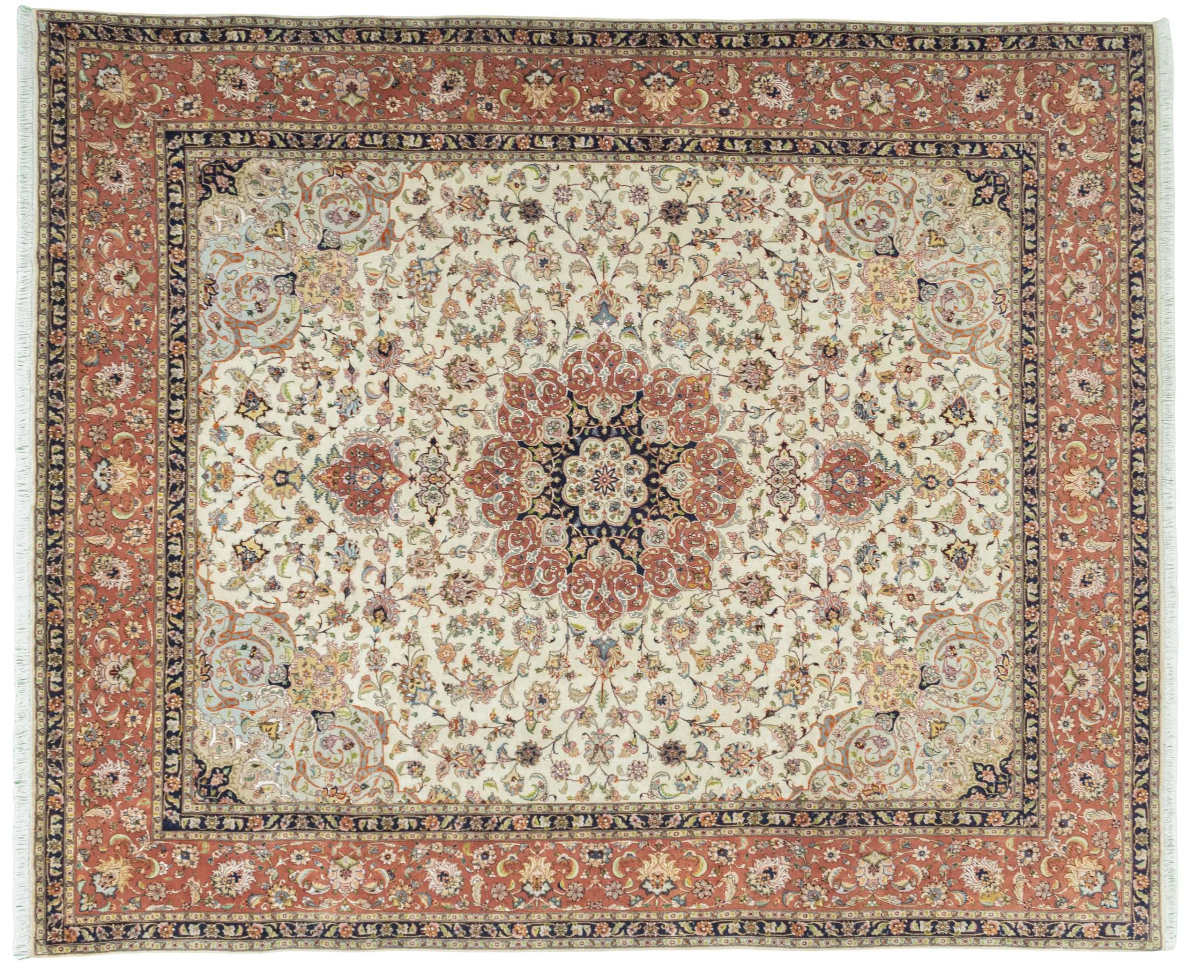 Alfombra número: 310546008259445 Tamaño: 300x249 cm Espesor: alrededor de 8 mm Nudos: 450 000 - 500 000 / m² Elaboración: Anudado a mano Crespón: Lana de corcho con seda Urdimbre: Algodón Estado / Conservación En ciertos lugares se puede ver el desgaste Origen: Persia / Iran Edad: Nuevo Peso: alrededor de 22 kg También conocido como Tabriz, Tabris, Täbris, Tebriz, Tebris, 40Raj, 50Raj Cantidad en stock: Única - Solo 1 en stock