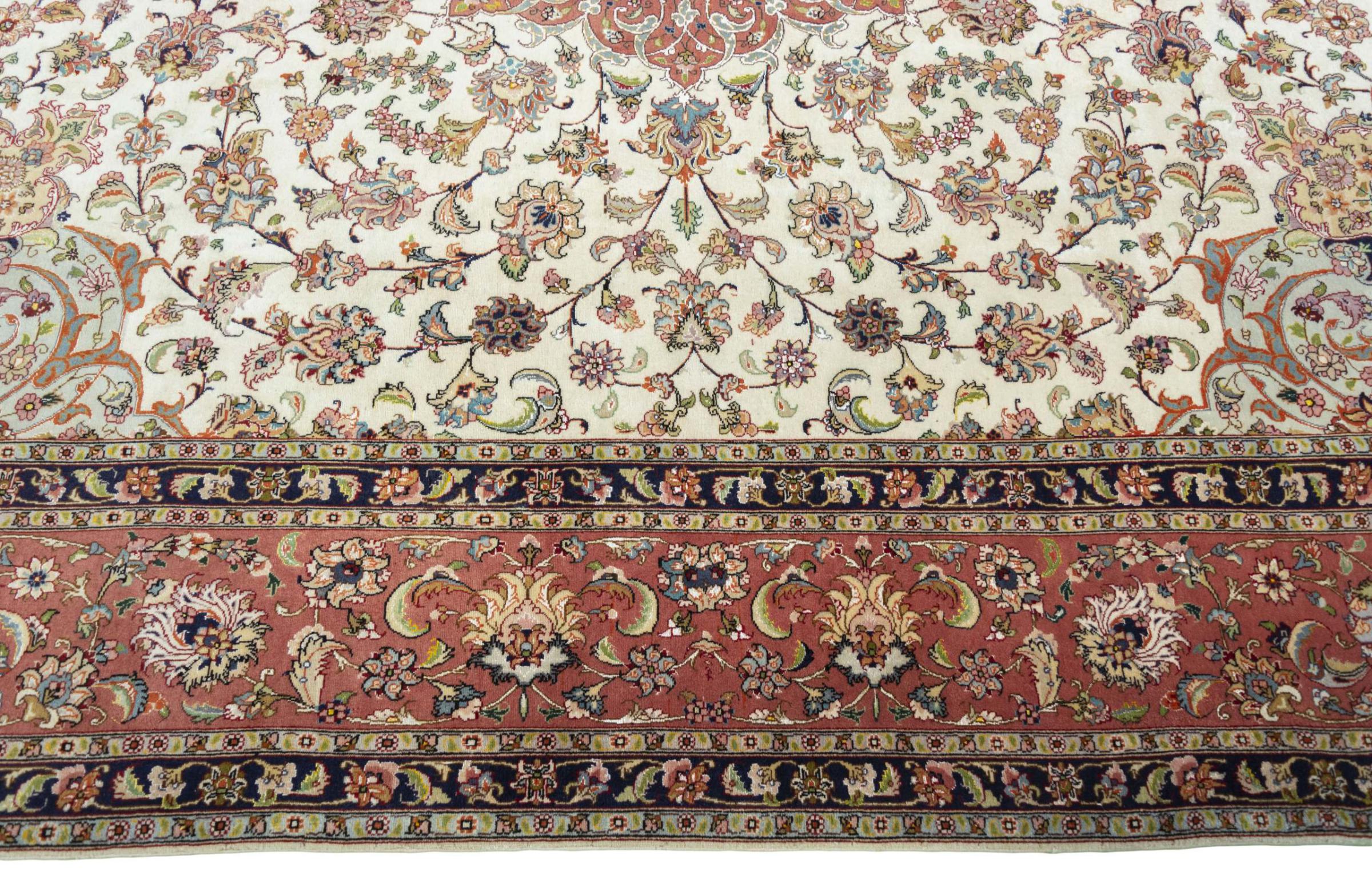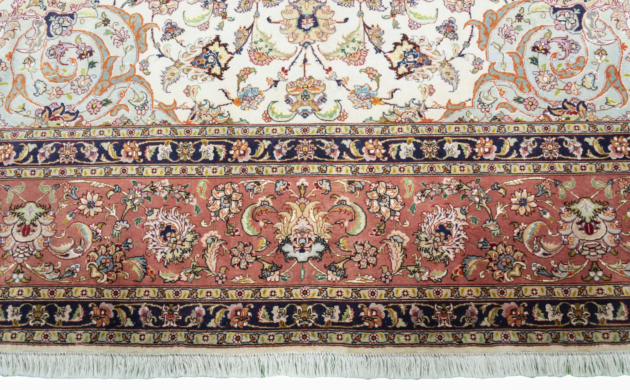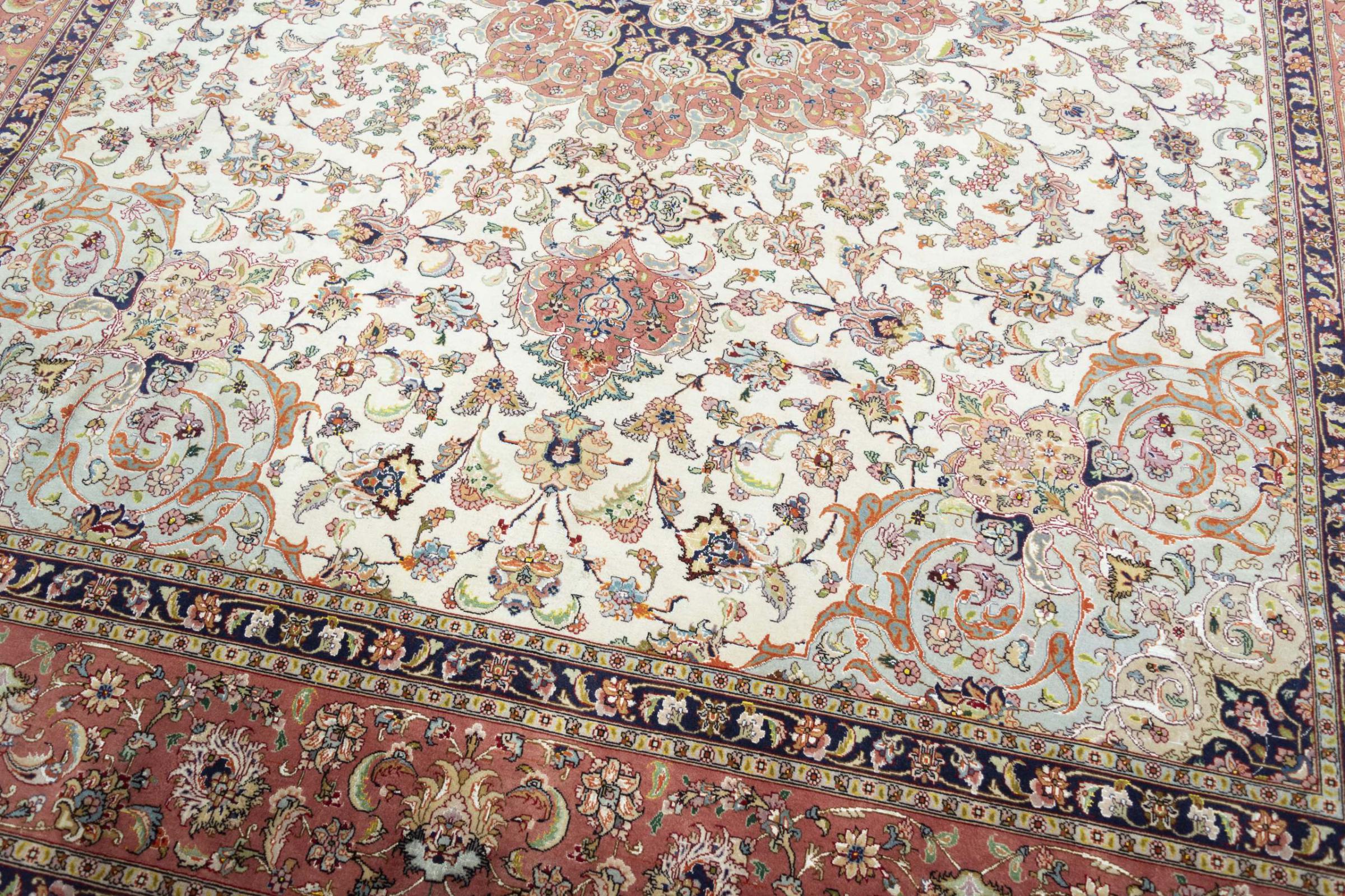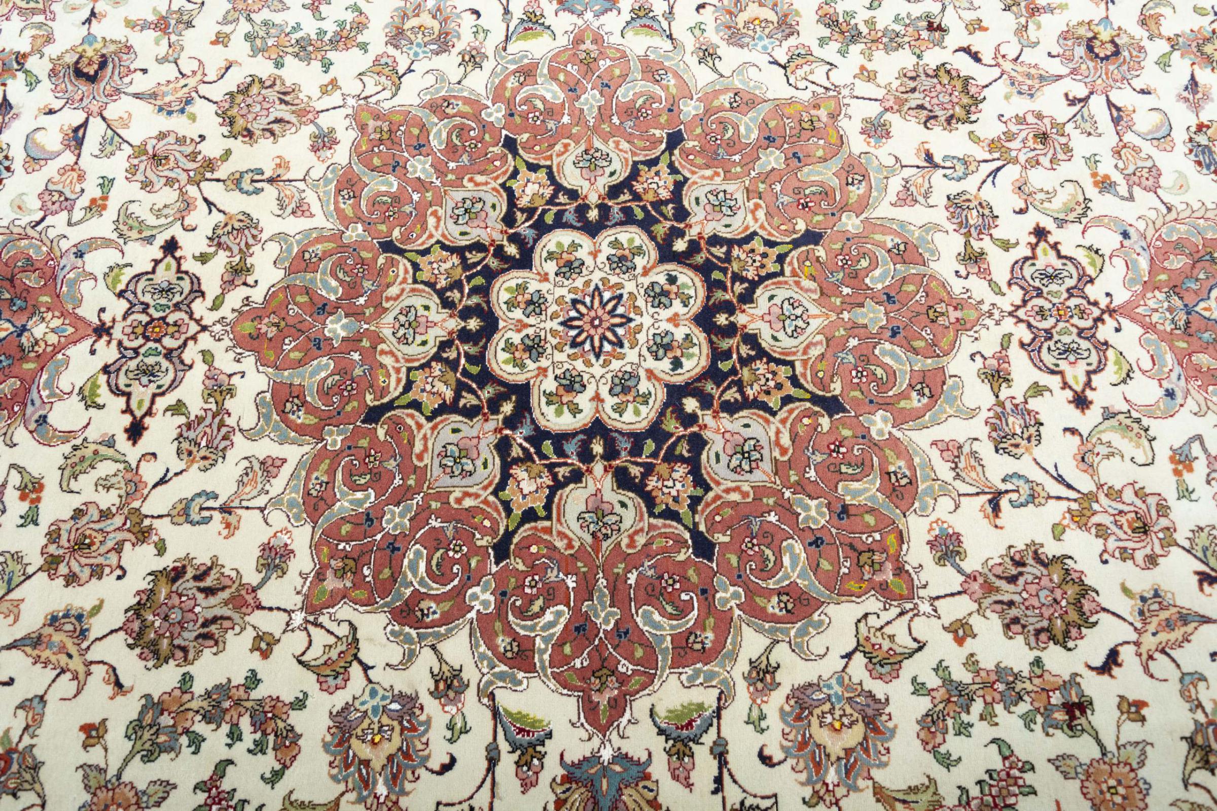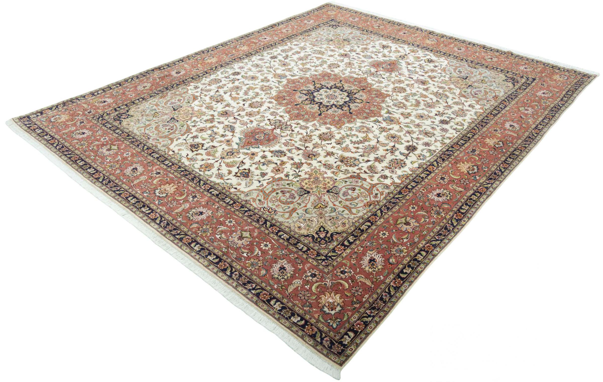 Alfombra número: 310546008259445 Tamaño: 300x249 cm Espesor: alrededor de 8 mm Nudos: 450 000 - 500 000 / m² Elaboración: Anudado a mano Crespón: Lana de corcho con seda Urdimbre: Algodón Estado / Conservación En ciertos lugares se puede ver el desgaste Origen: Persia / Iran Edad: Nuevo Peso: alrededor de 22 kg También conocido como Tabriz, Tabris, Täbris, Tebriz, Tebris, 40Raj, 50Raj Cantidad en stock: Única - Solo 1 en stock