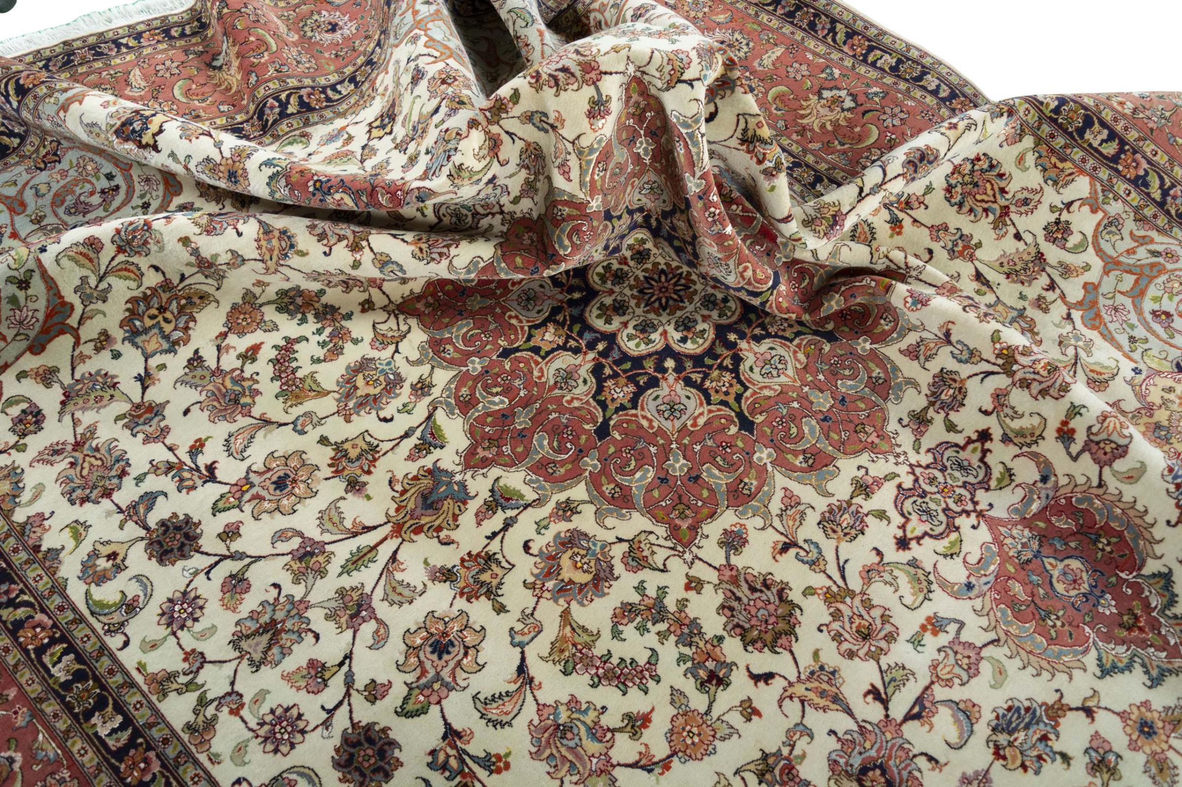 Este Tabriz se anudó a mano en el noroeste de Irán, en la ciudad artesanal y epónima de Tabriz. Sólo se utilizaron lana de alta calidad y seda natural. Con sus motivos y elementos decorativos, refleja Oriente en su forma más bella. Deje que una obra de arte se abra camino en su hogar: Una verdadera atracción para usted y sus invitados. El número Raj indica el número de nudos en una longitud de 7 cm. Una Tabriz 50Raj, por ejemplo, tiene aproximadamente 500.000 nudos por m2, una 70Raj incluso aprox. 1.000.000 de nudos por m2.