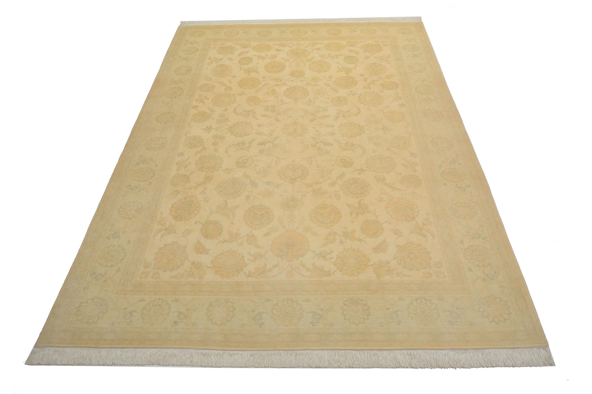 Este Tabriz se anudó a mano en el noroeste de Irán, en la ciudad artesanal y epónima de Tabriz. Sólo se utilizaron lana de alta calidad y seda natural. Con sus motivos y elementos decorativos, refleja Oriente en su forma más bella. Deje que una obra de arte se abra camino en su hogar: Una verdadera atracción para usted y sus invitados. El número Raj indica el número de nudos en una longitud de 7 cm. Una Tabriz 50Raj, por ejemplo, tiene aproximadamente 500.000 nudos por m2, una 70Raj incluso aprox. 1.000.000 de nudos por m2.