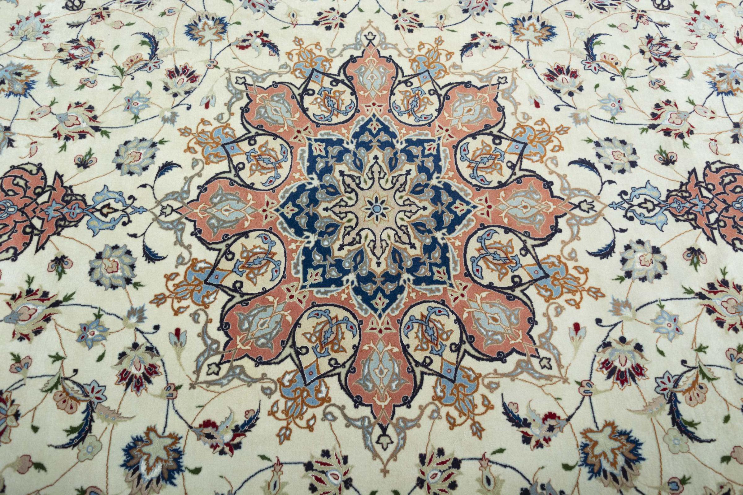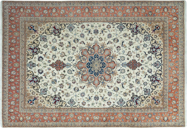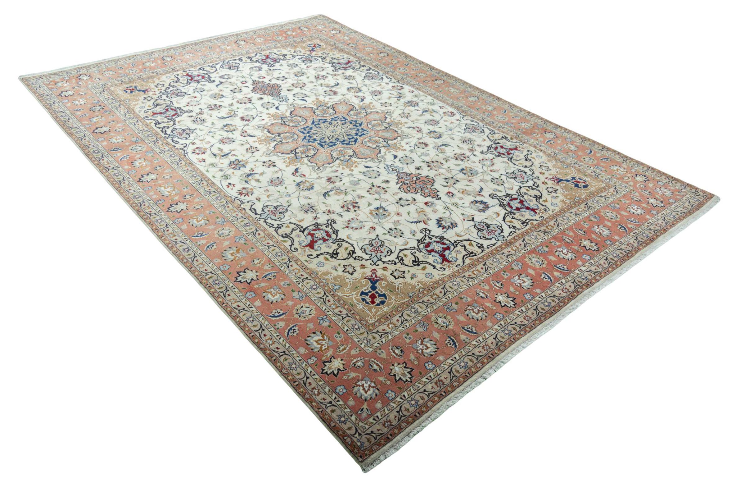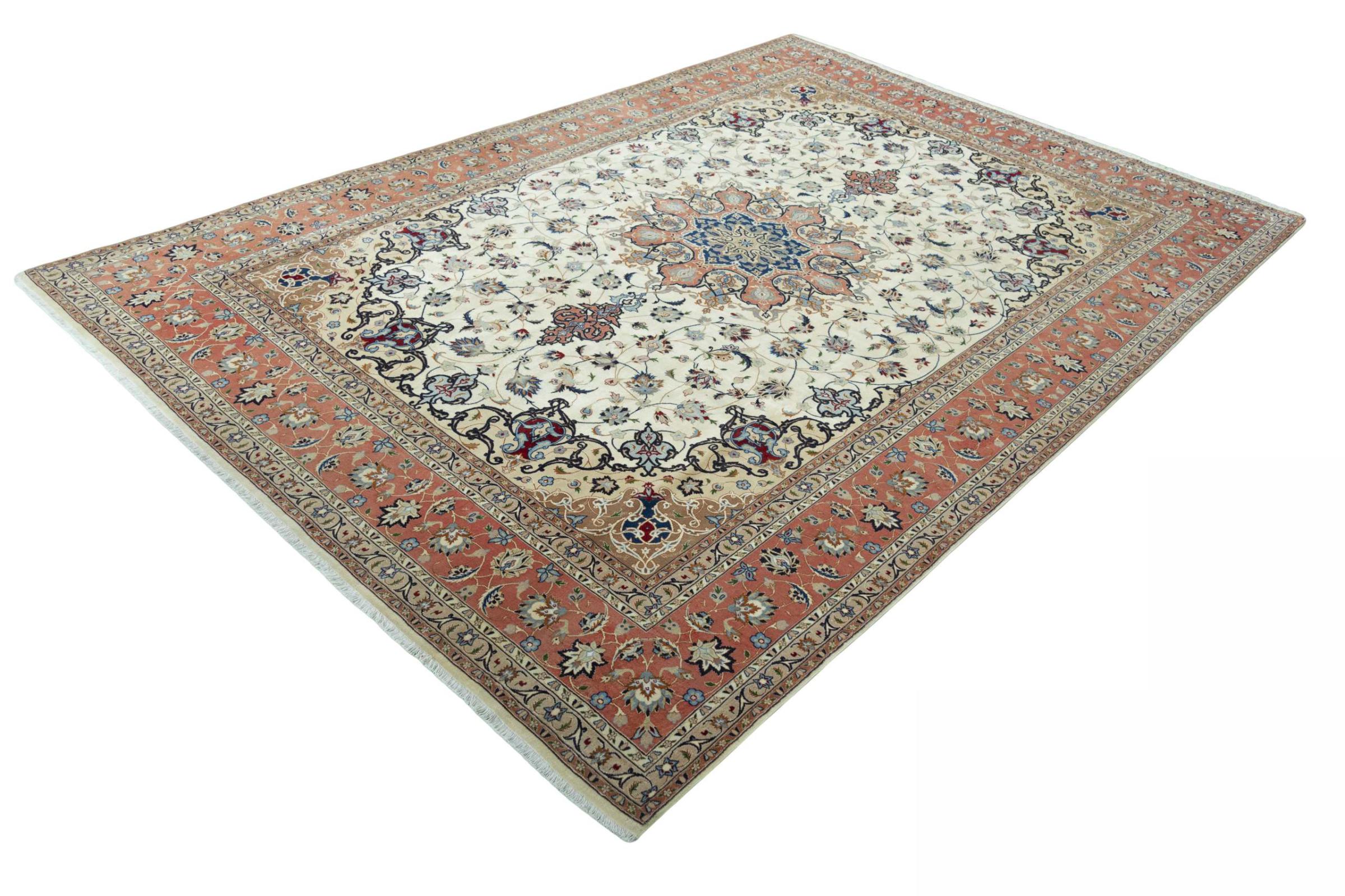 Este Tabriz se anudó a mano en el noroeste de Irán, en la ciudad artesanal y epónima de Tabriz. Sólo se utilizaron lana de alta calidad y seda natural. Con sus motivos y elementos decorativos, refleja Oriente en su forma más bella. Deje que una obra de arte se abra camino en su hogar: Una verdadera atracción para usted y sus invitados. El número Raj indica el número de nudos en una longitud de 7 cm. Una Tabriz 50Raj, por ejemplo, tiene aproximadamente 500.000 nudos por m2, una 70Raj incluso aprox. 1.000.000 de nudos por m2.