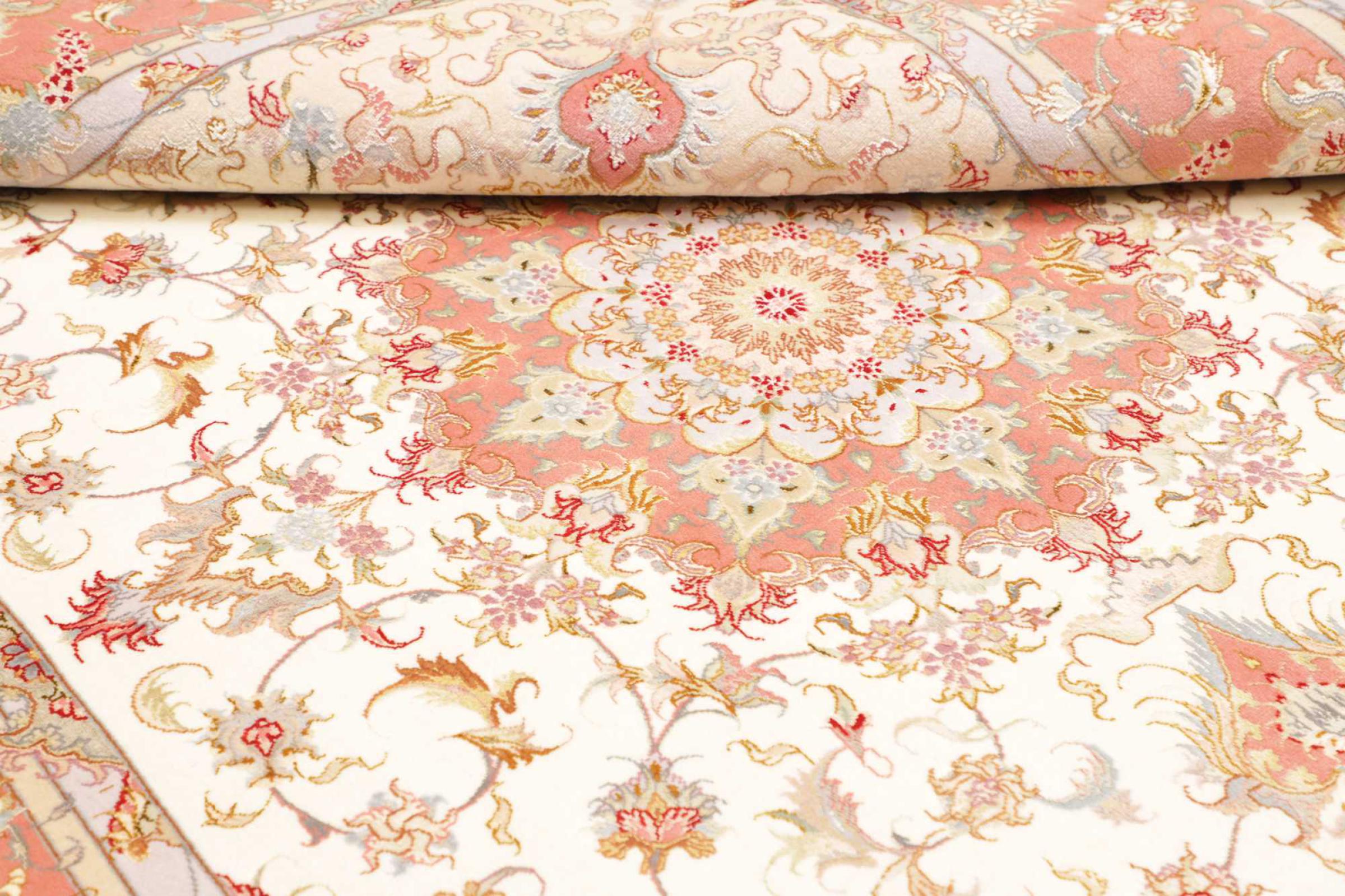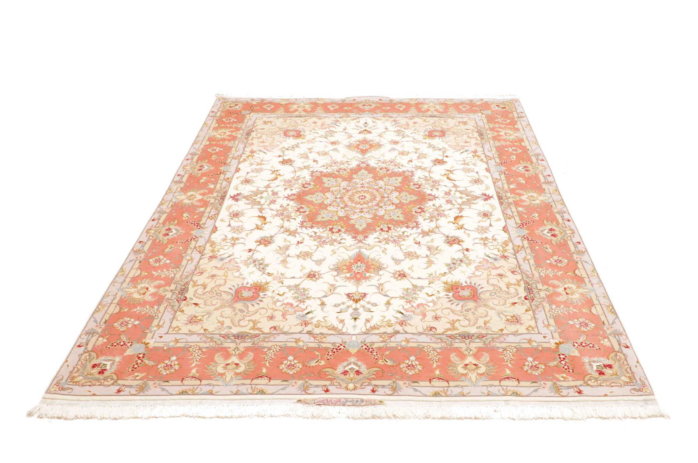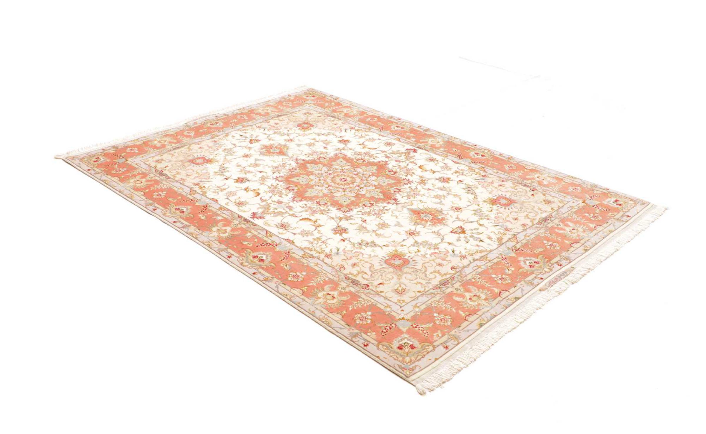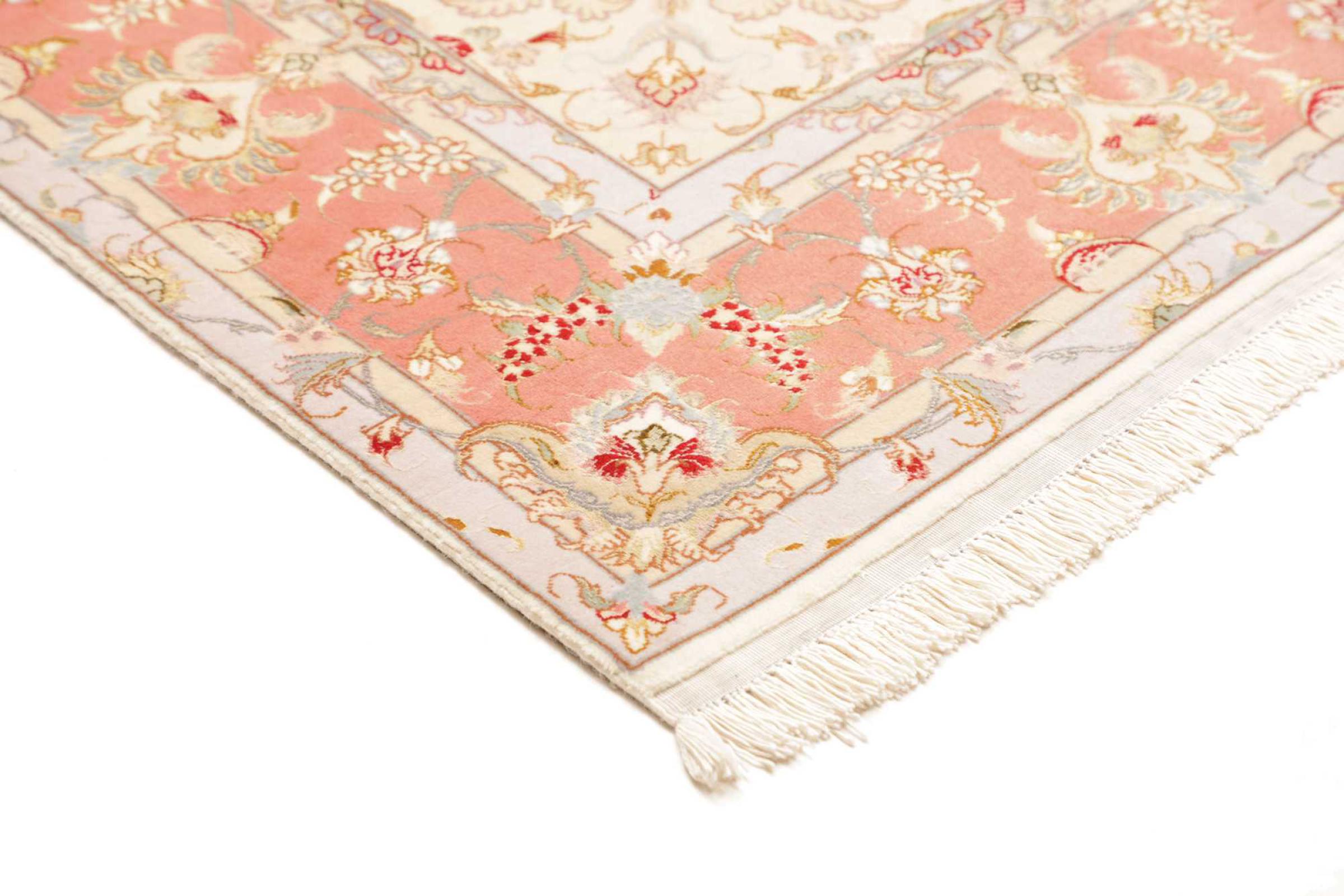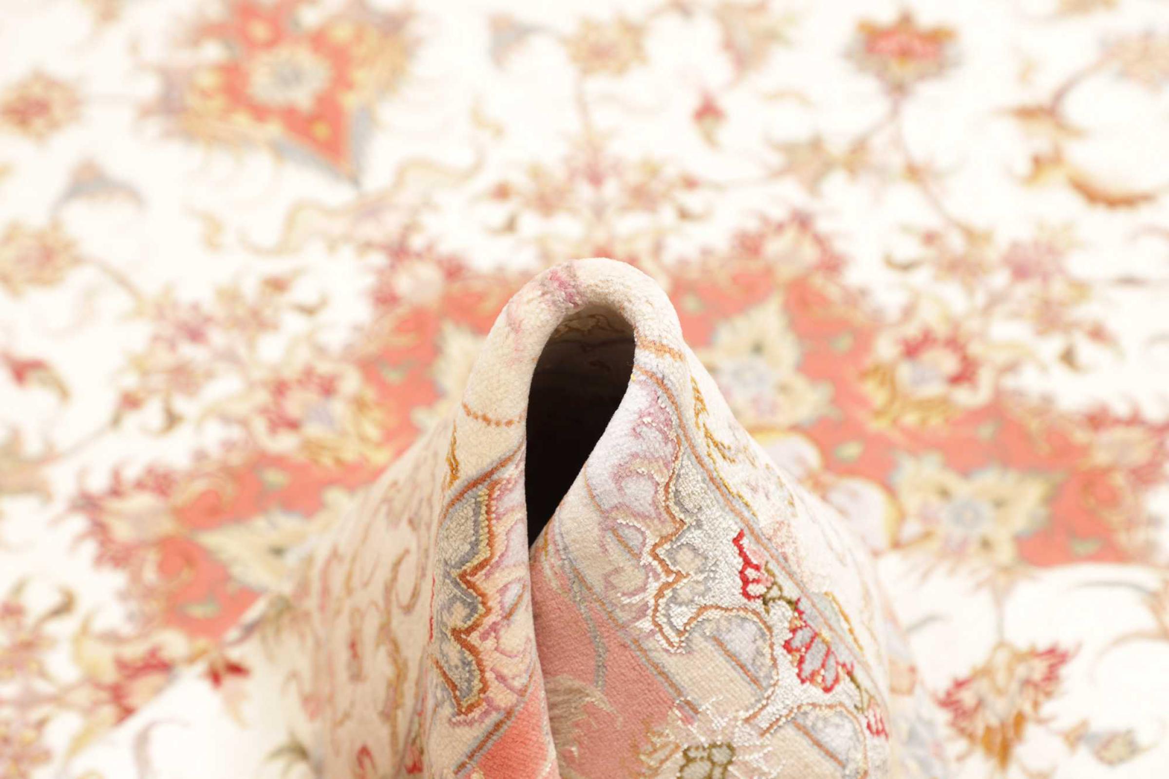 Este Tabriz se anudó a mano en el noroeste de Irán, en la ciudad artesanal y epónima de Tabriz. Sólo se utilizaron lana de alta calidad y seda natural. Con sus motivos y elementos decorativos, refleja Oriente en su forma más bella. El número Raj indica el número de nudos por cada 7 cm de longitud. Esta Tabriz 70Raj tiene alrededor de 1.000.000 de nudos por m2 y es una de las alfombras anudadas a mano más finas. El anudado de una alfombra así requiere un año de trabajo manual muy cualificado y experimentado.