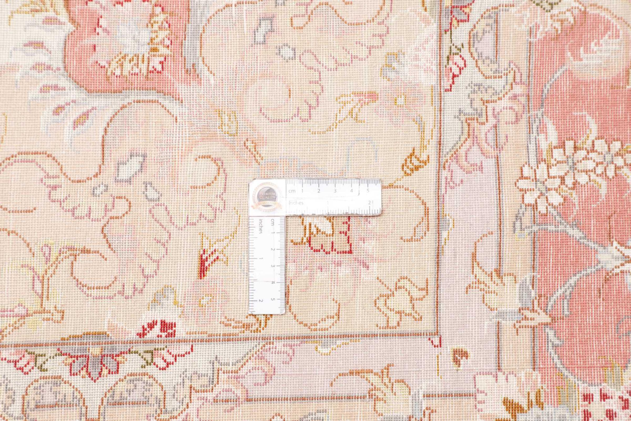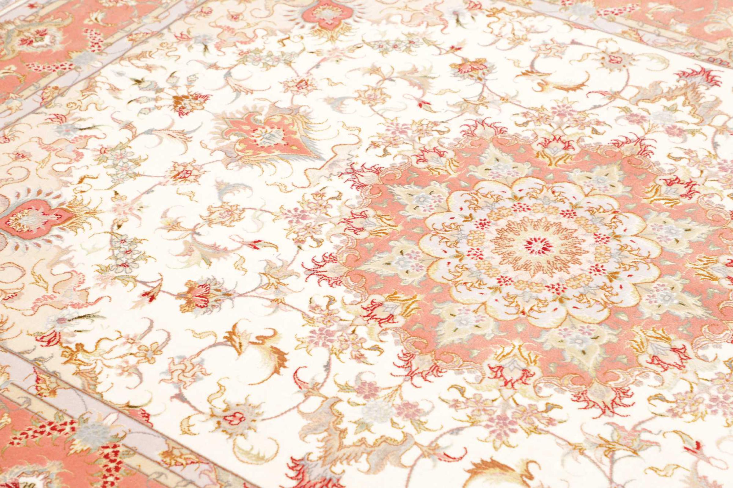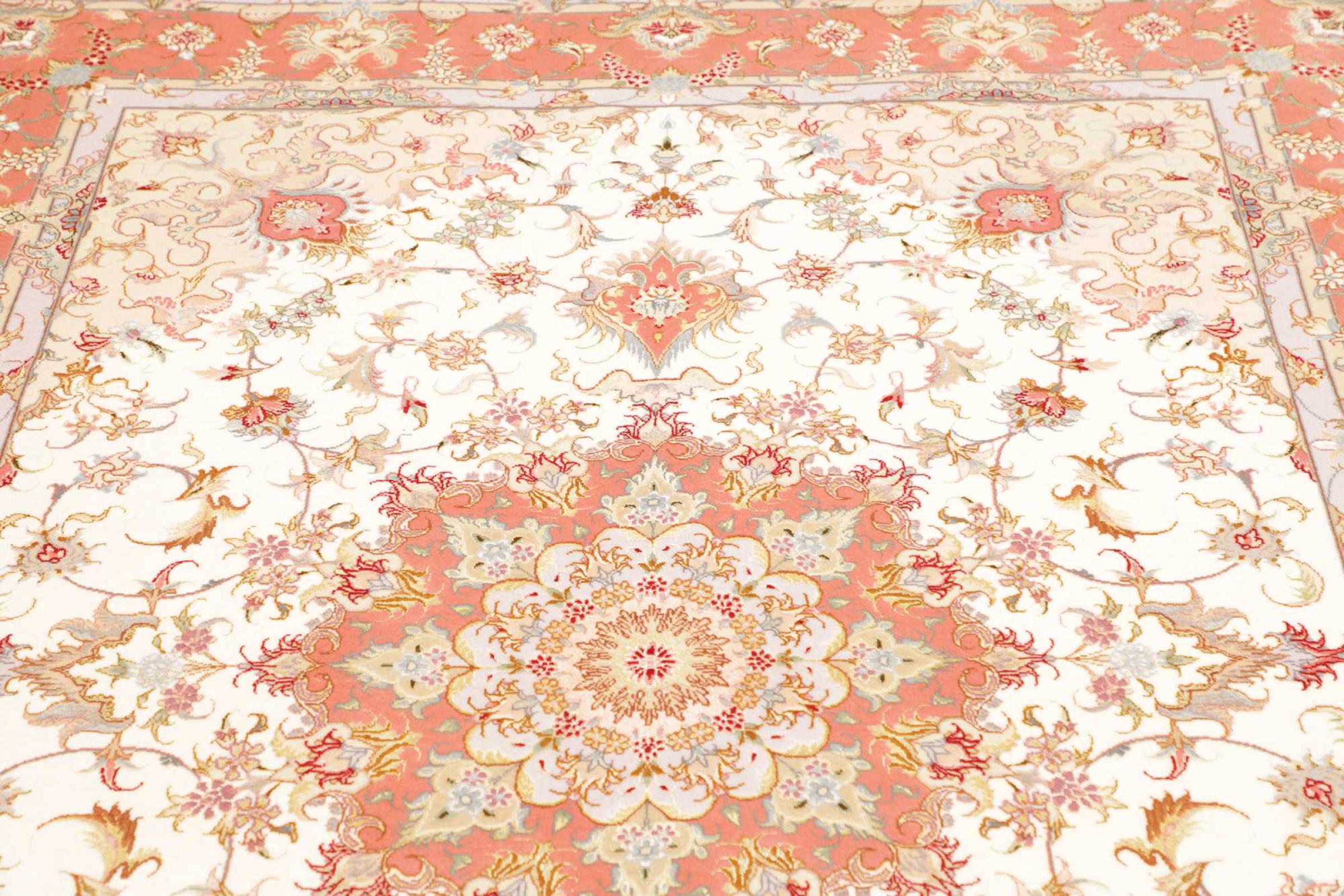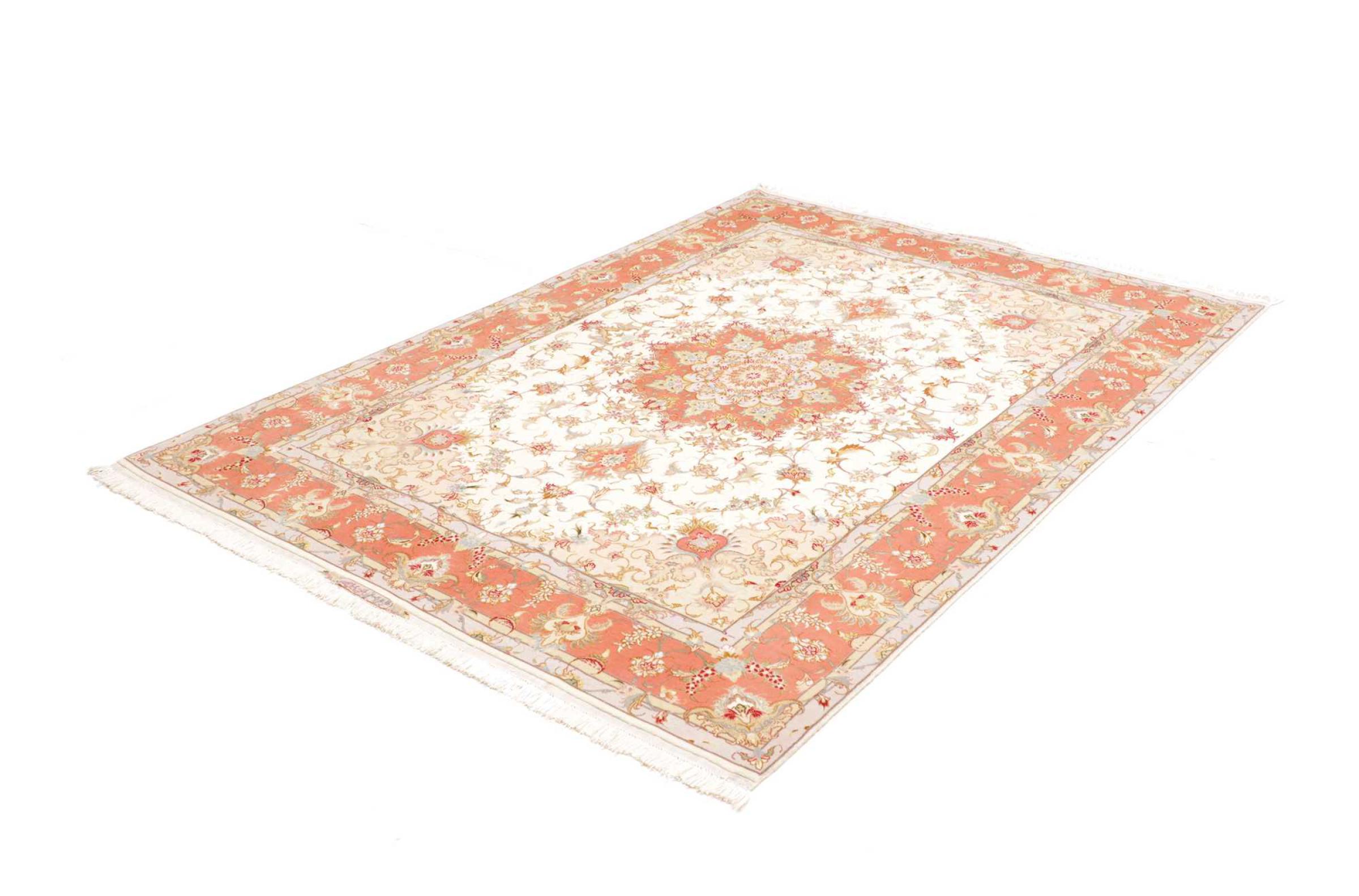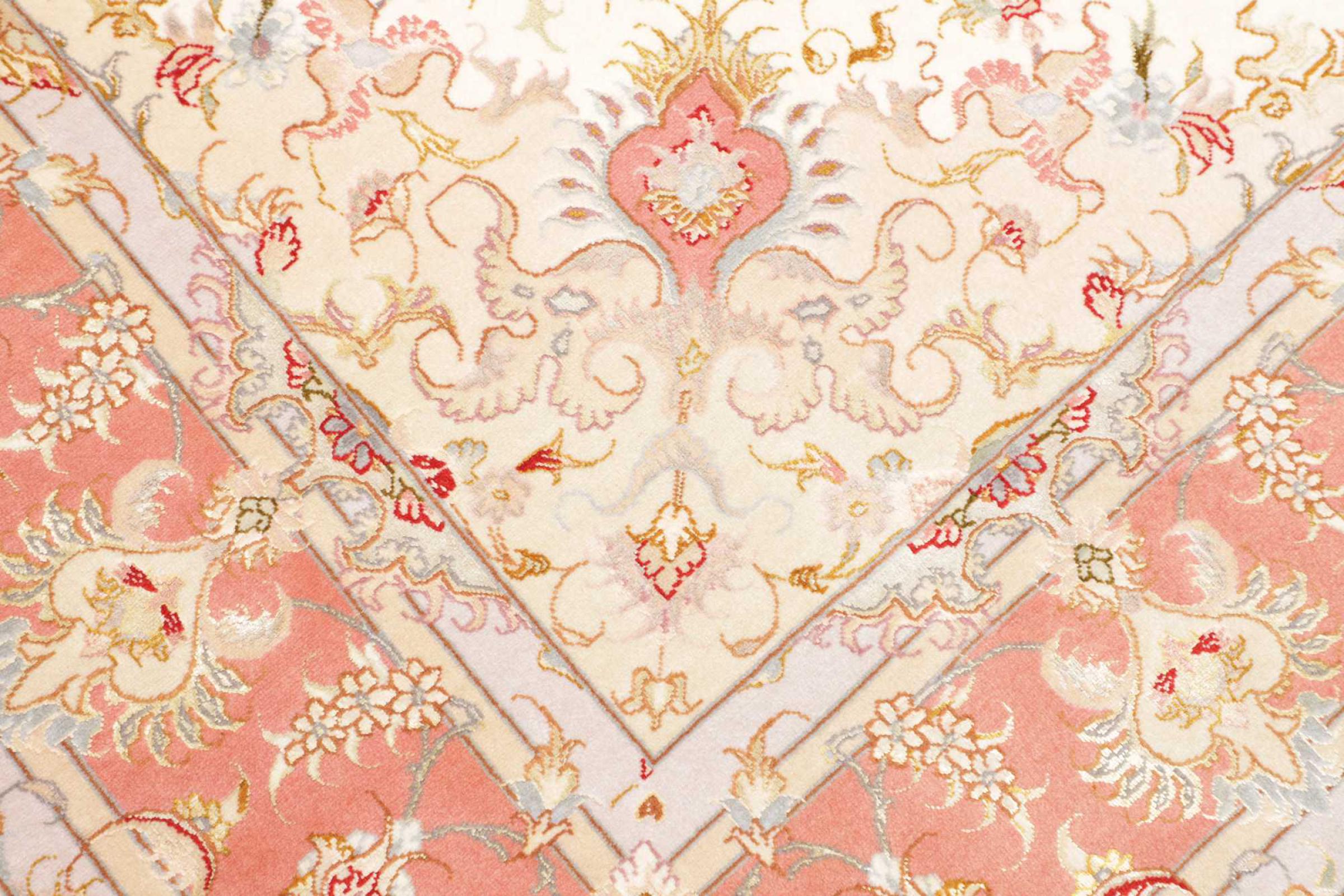 Este Tabriz se anudó a mano en el noroeste de Irán, en la ciudad artesanal y epónima de Tabriz. Sólo se utilizaron lana de alta calidad y seda natural. Con sus motivos y elementos decorativos, refleja Oriente en su forma más bella. El número Raj indica el número de nudos por cada 7 cm de longitud. Esta Tabriz 70Raj tiene alrededor de 1.000.000 de nudos por m2 y es una de las alfombras anudadas a mano más finas. El anudado de una alfombra así requiere un año de trabajo manual muy cualificado y experimentado.