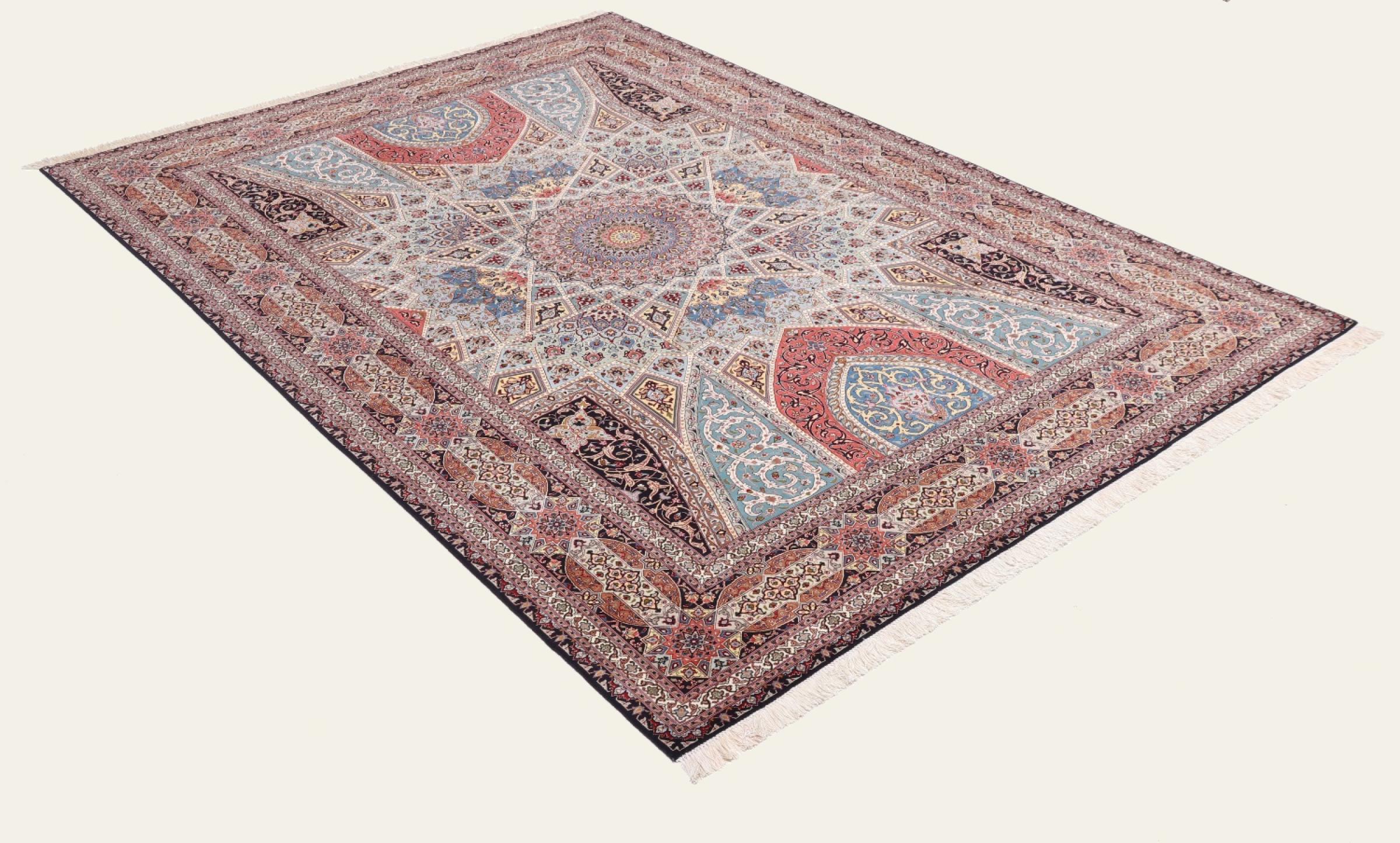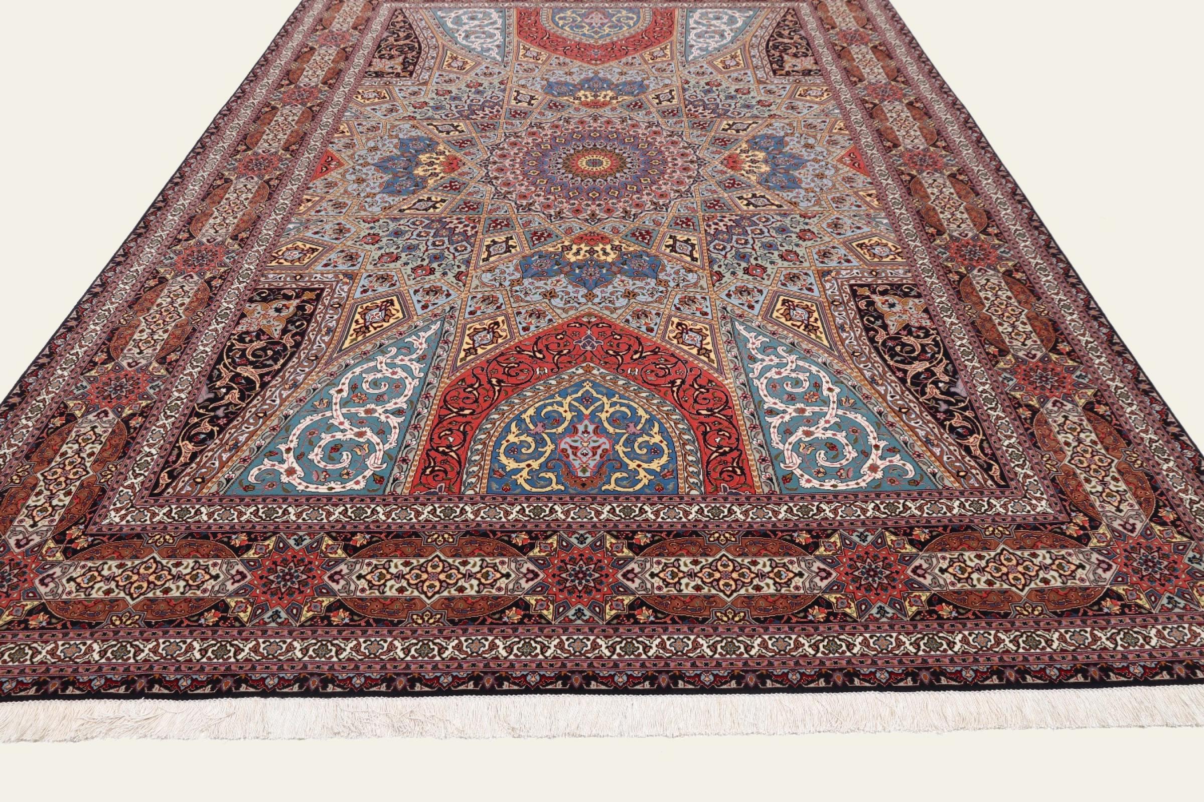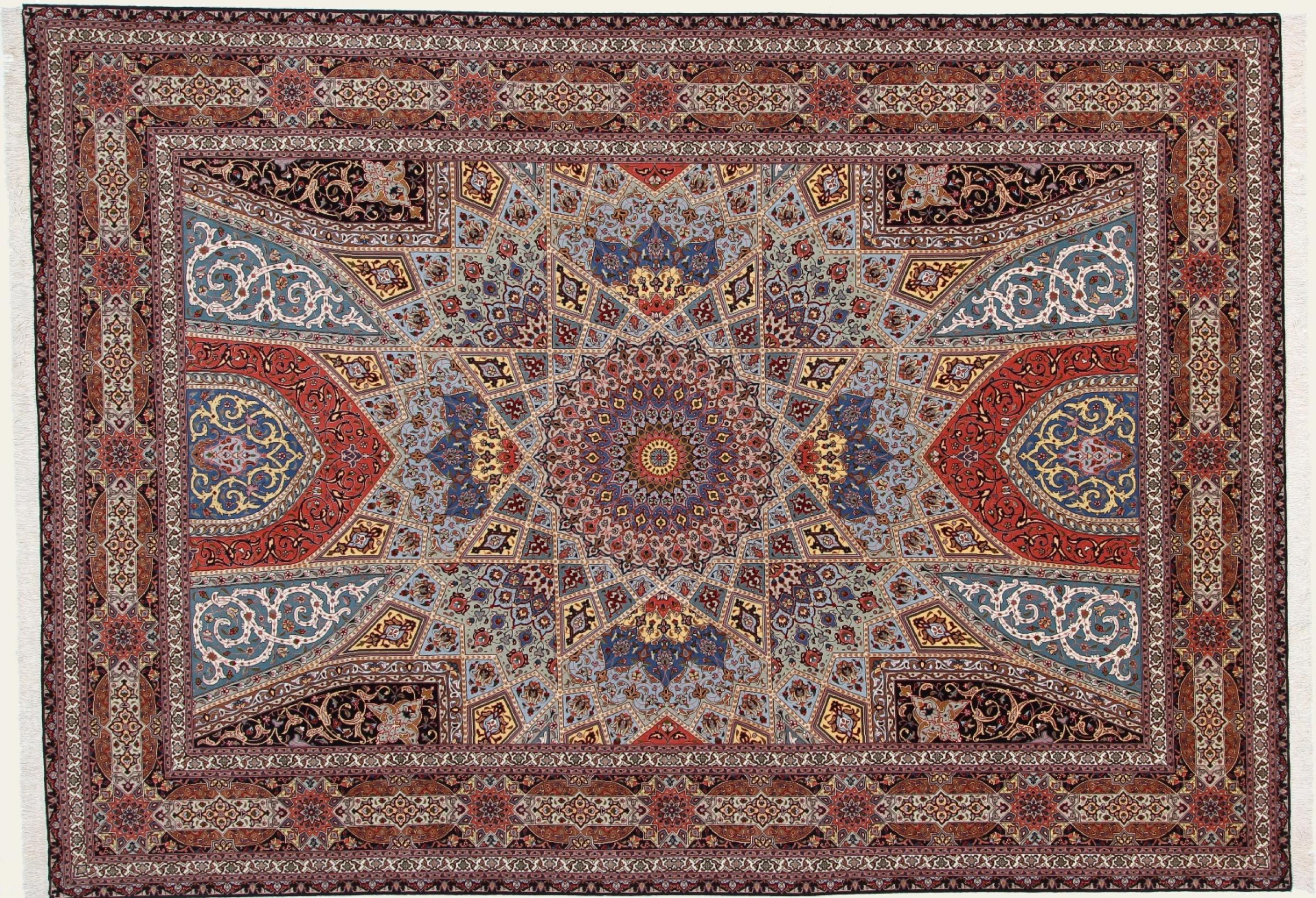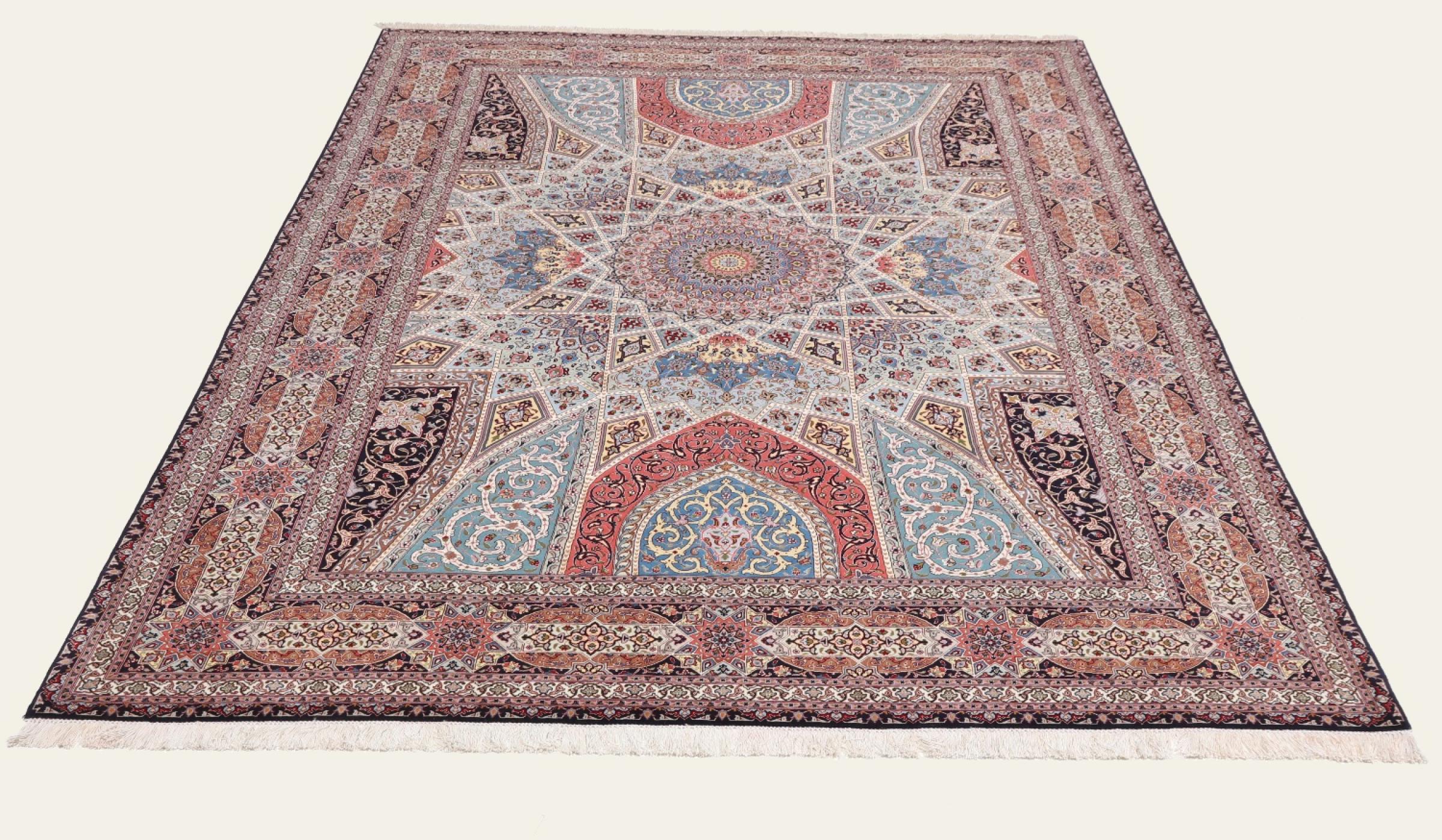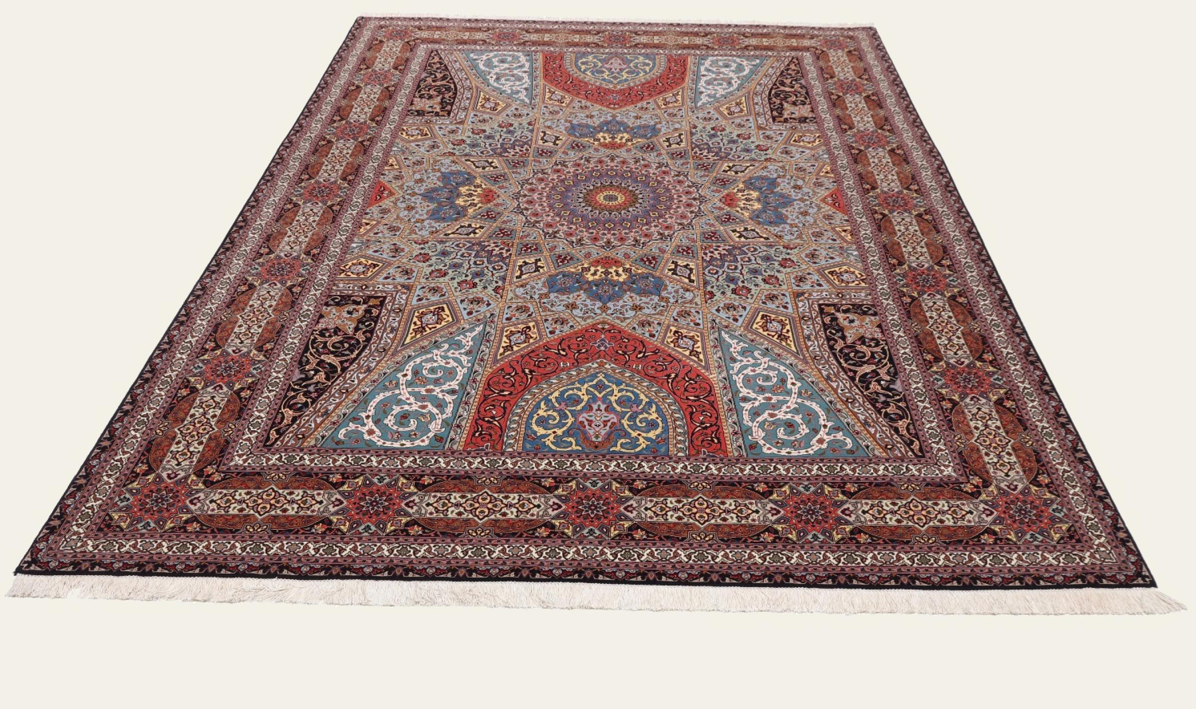 Los motivos de las alfombras Tabriz Gumbad nos hacen recordar a las formas presentes en las cúpulas de las mezquitas. El anudado a mano y la lana utilizada en su elaboración, la convierten en un ejemplar muy valioso de la cultura de las alfombras de la ciudad de Tabriz.