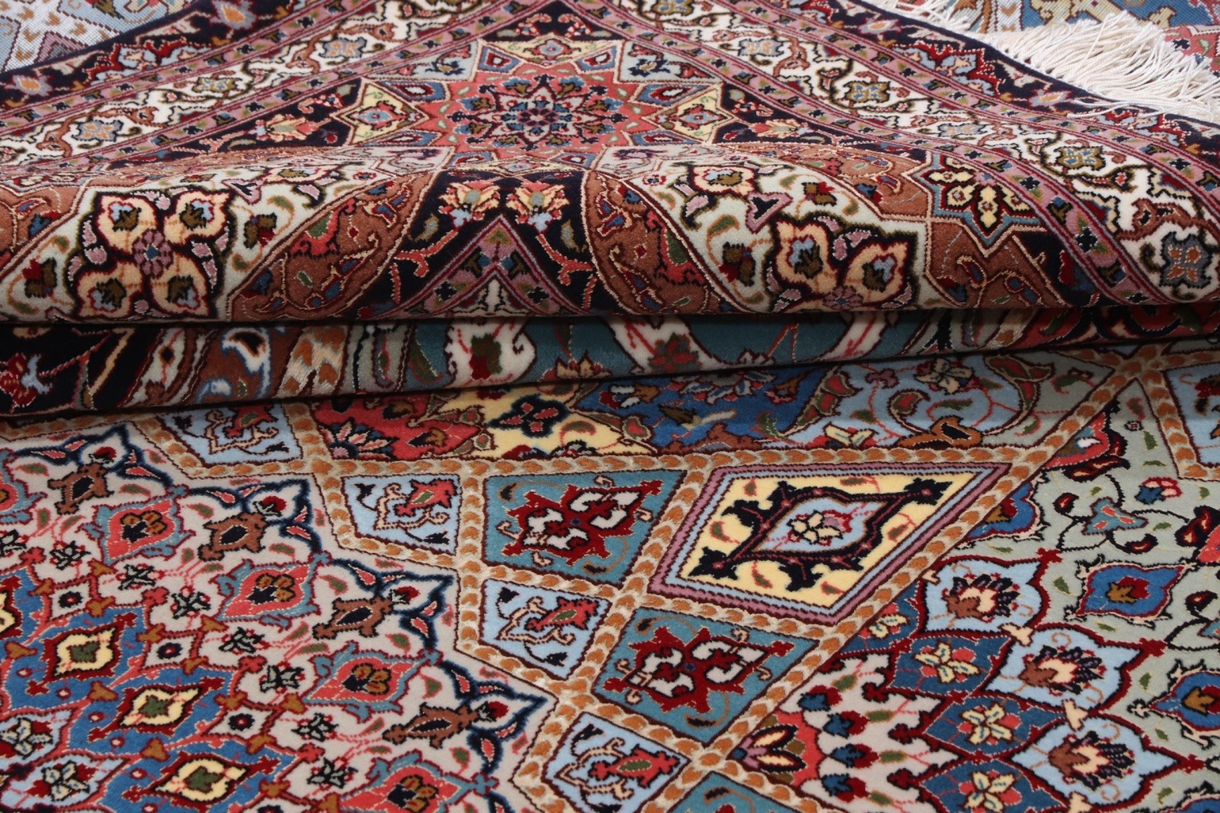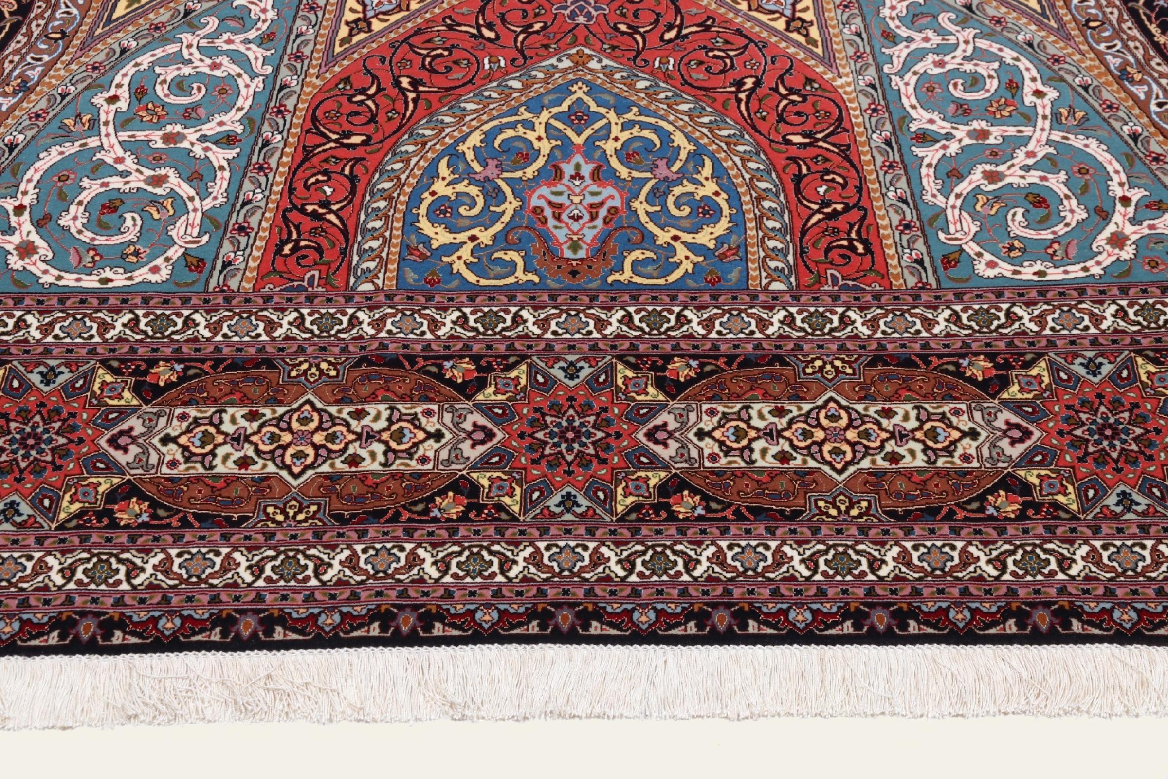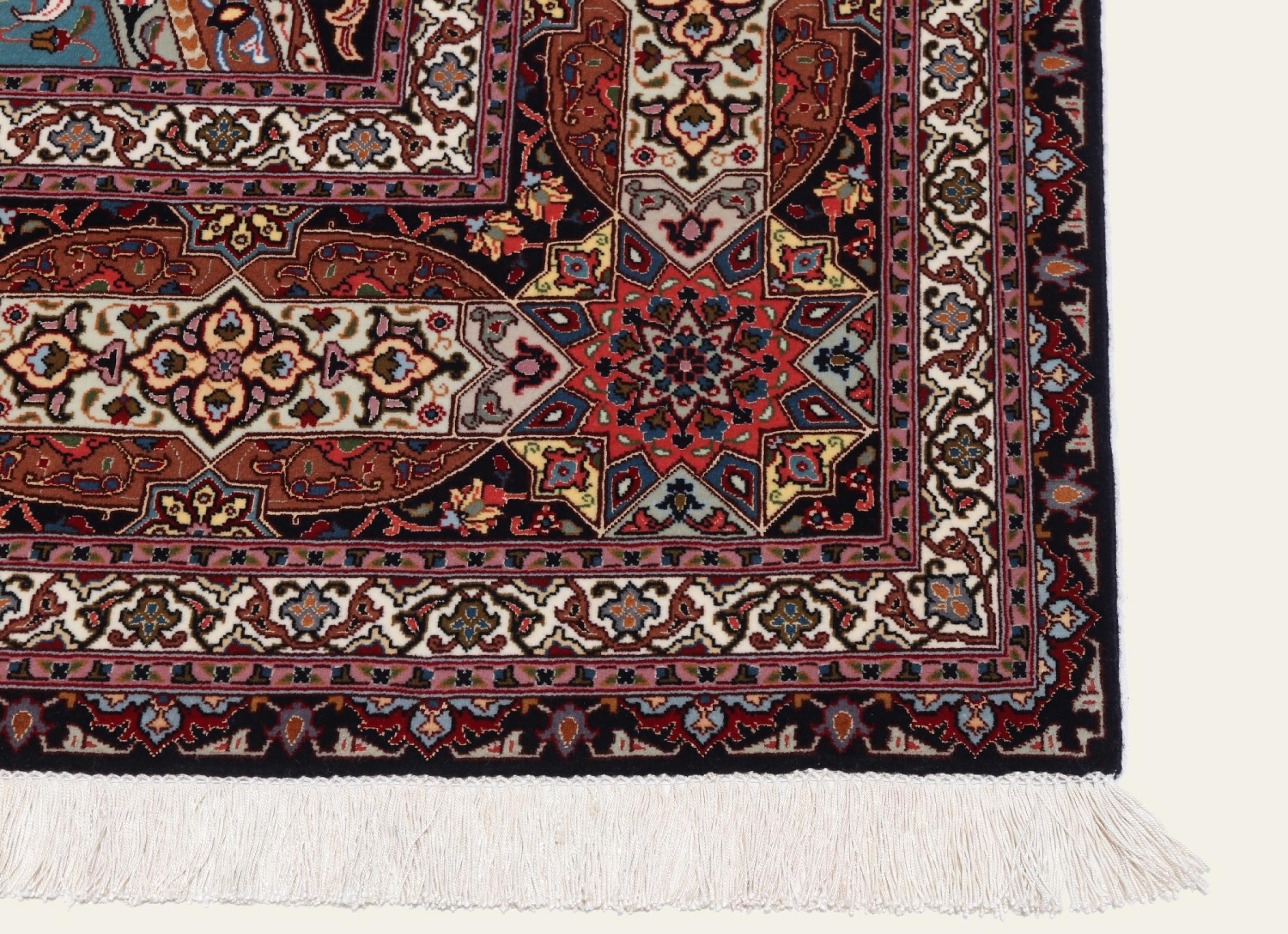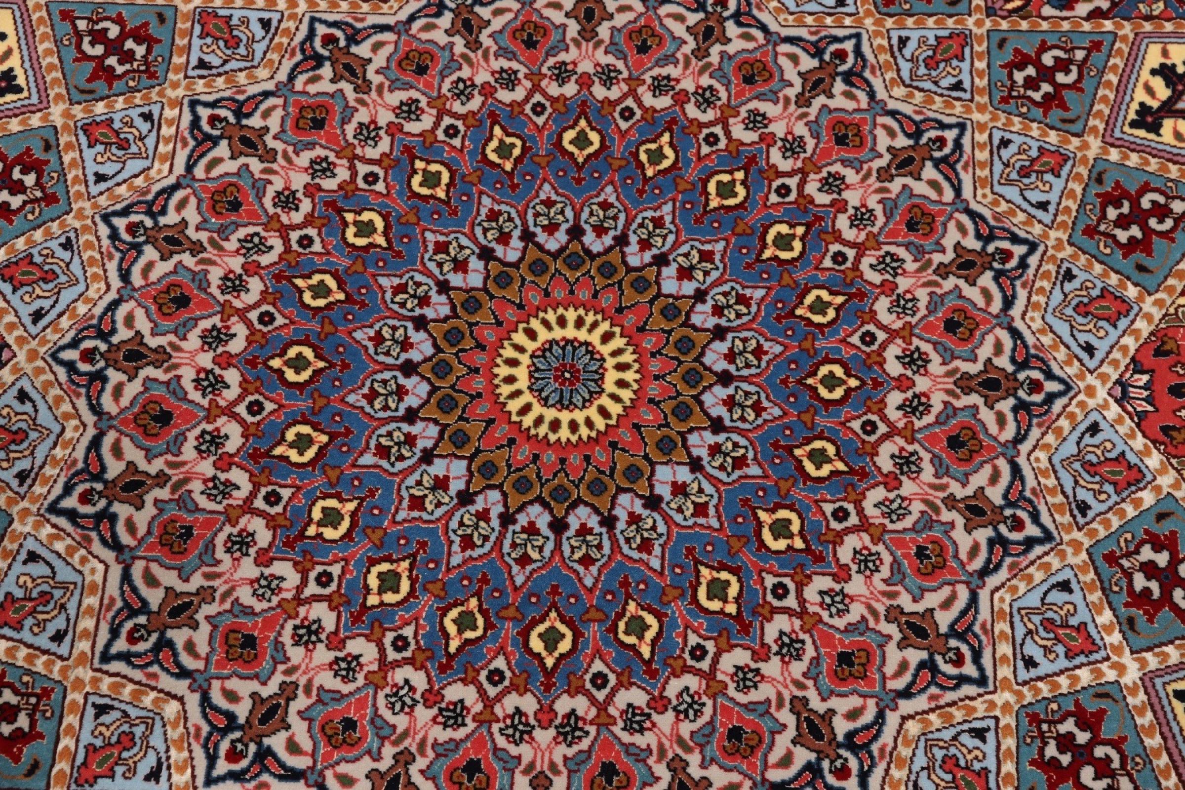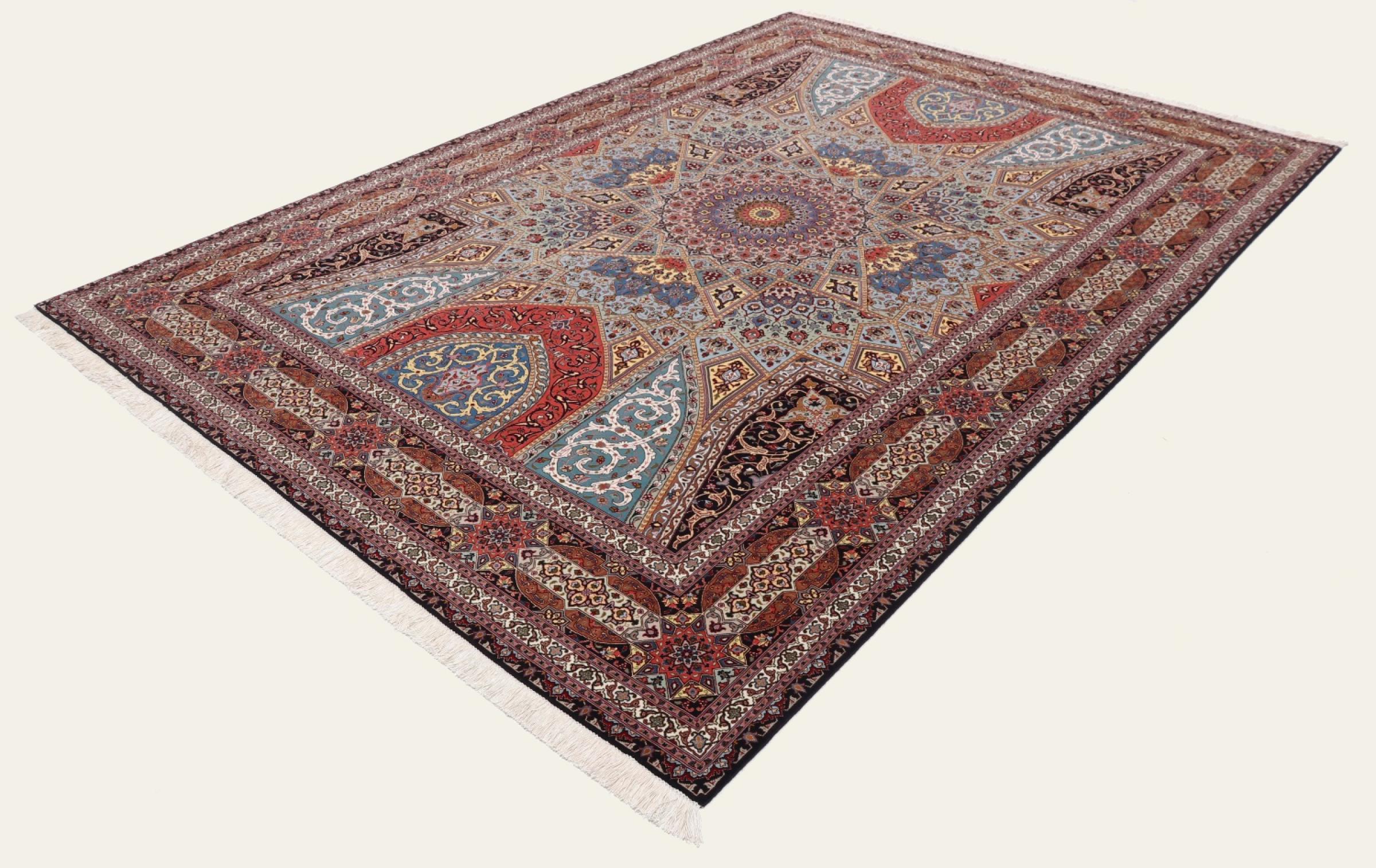 Los motivos de las alfombras Tabriz Gumbad nos hacen recordar a las formas presentes en las cúpulas de las mezquitas. El anudado a mano y la lana utilizada en su elaboración, la convierten en un ejemplar muy valioso de la cultura de las alfombras de la ciudad de Tabriz.