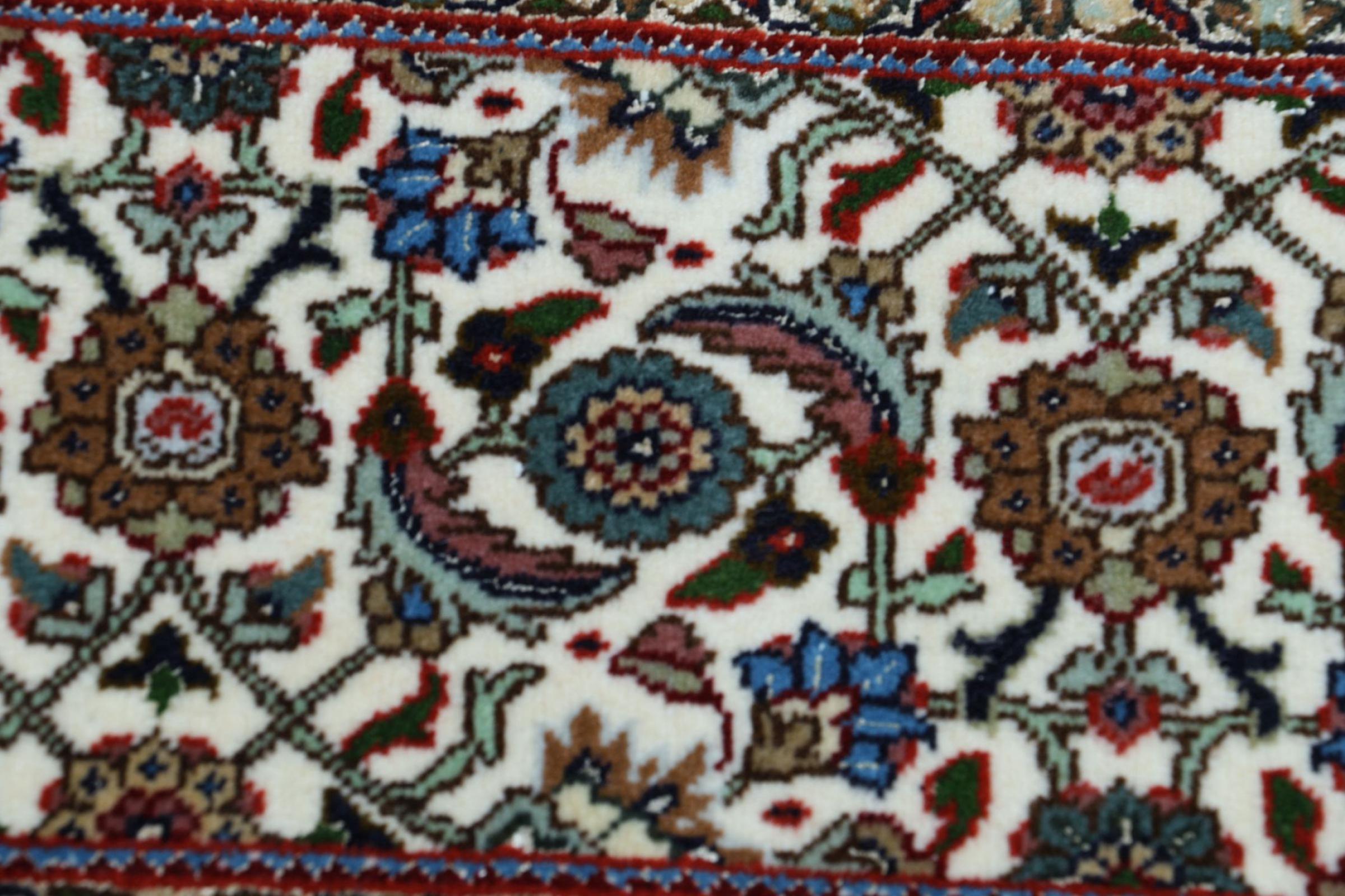 Esta alfombra de Tabriz tiene una vestimenta completamente tradicional. Los motivos hérati o motivos Mahi son uno de los diseños más clásicos. Cualquiera al que le atraiga el diseño tradicional, no querrá perderse esta alfombra en ninguna ocasión.