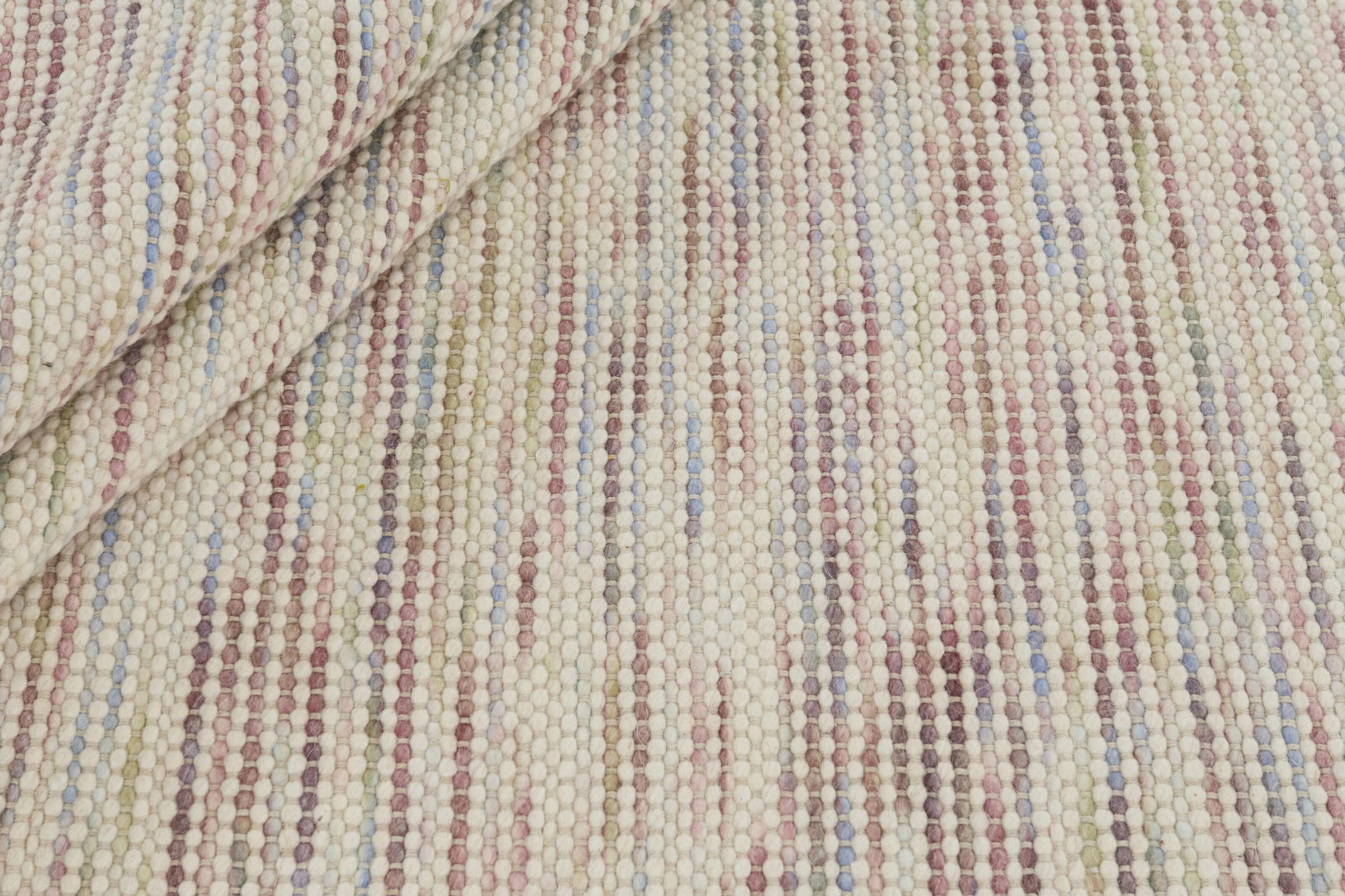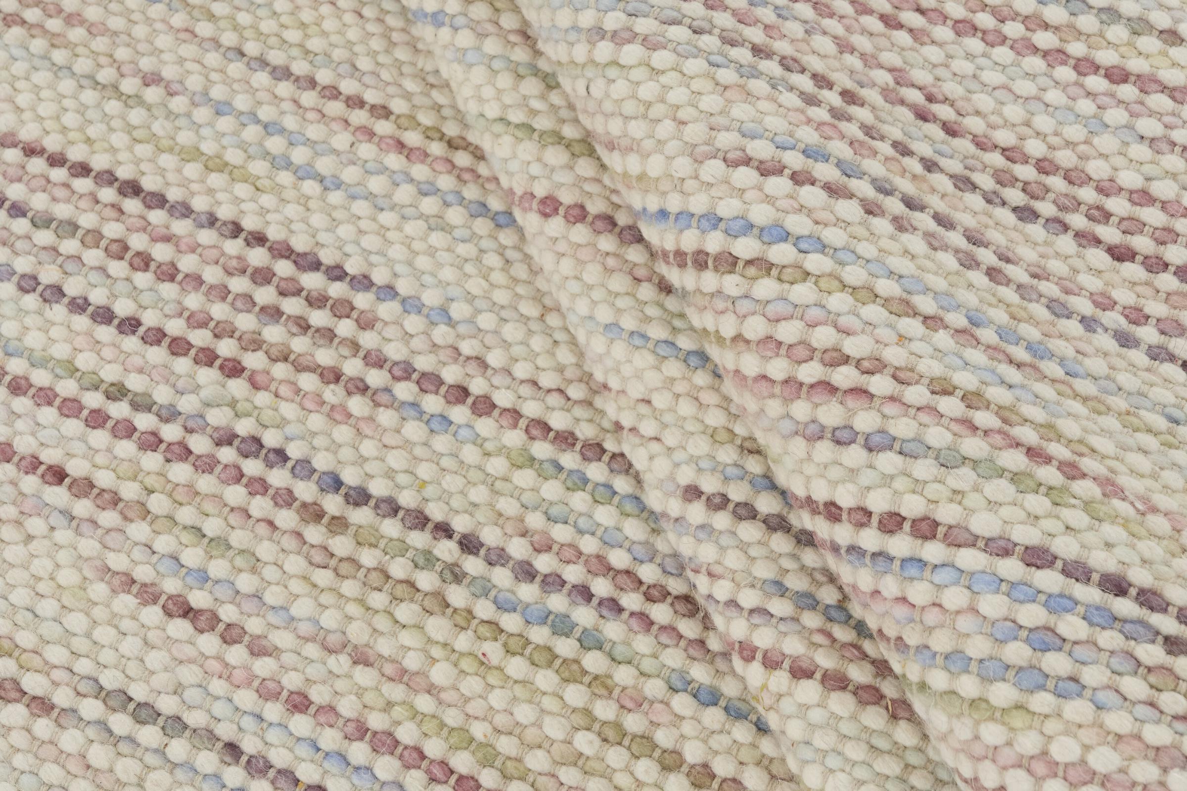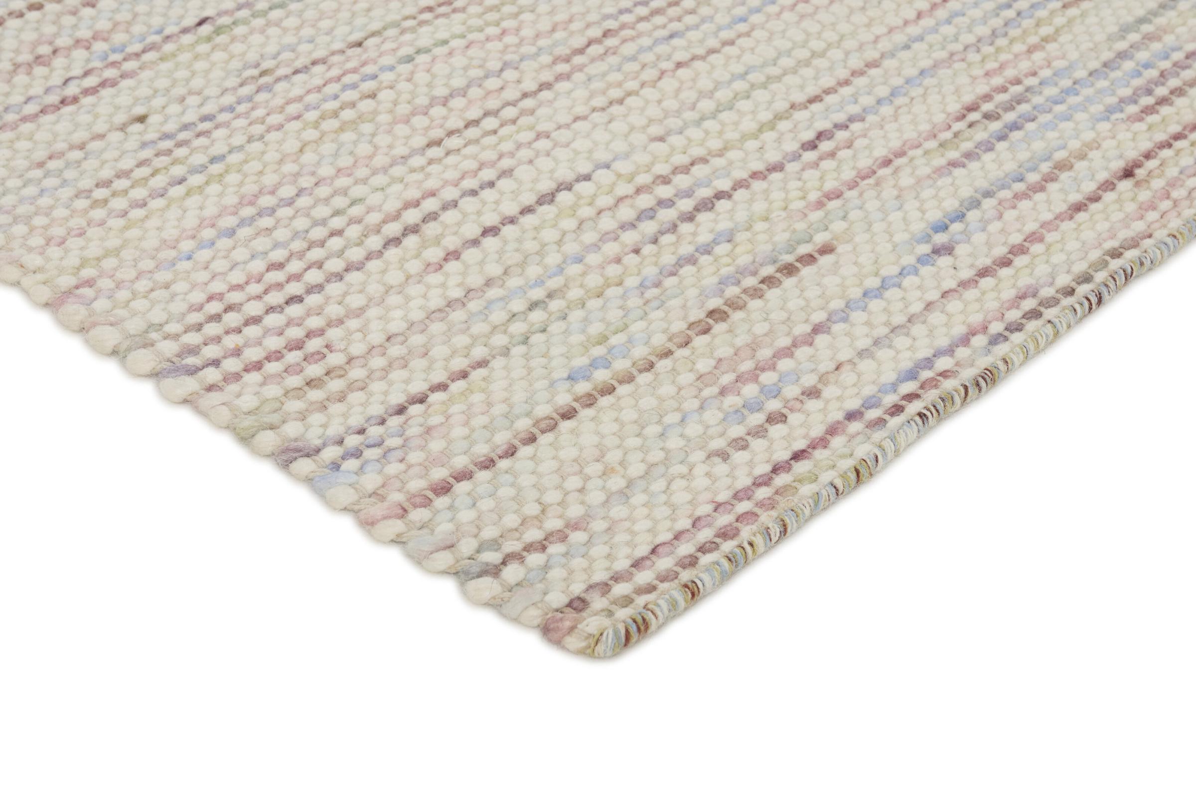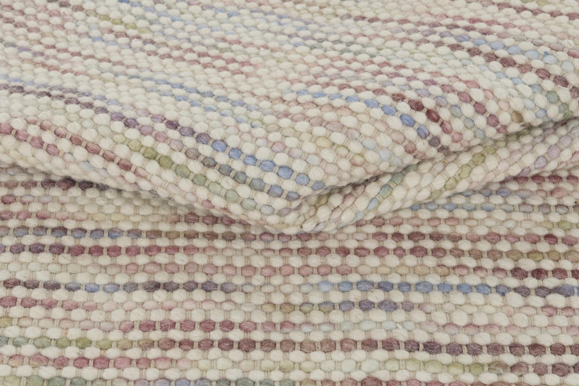 Esta alfombra de diseño Texura Nordlyn Sense, agradablemente agradable, luminosa y al mismo tiempo bastante sencilla, es un kilim de diseño moderno tejido originalmente a mano con lana de oveja natural. Con 10 mm de grosor, es más alto que muchos kilims tradicionales, lo que lo hace aún más robusto e ideal para el uso diario. Agregará un acento muy amigable a su ambiente.