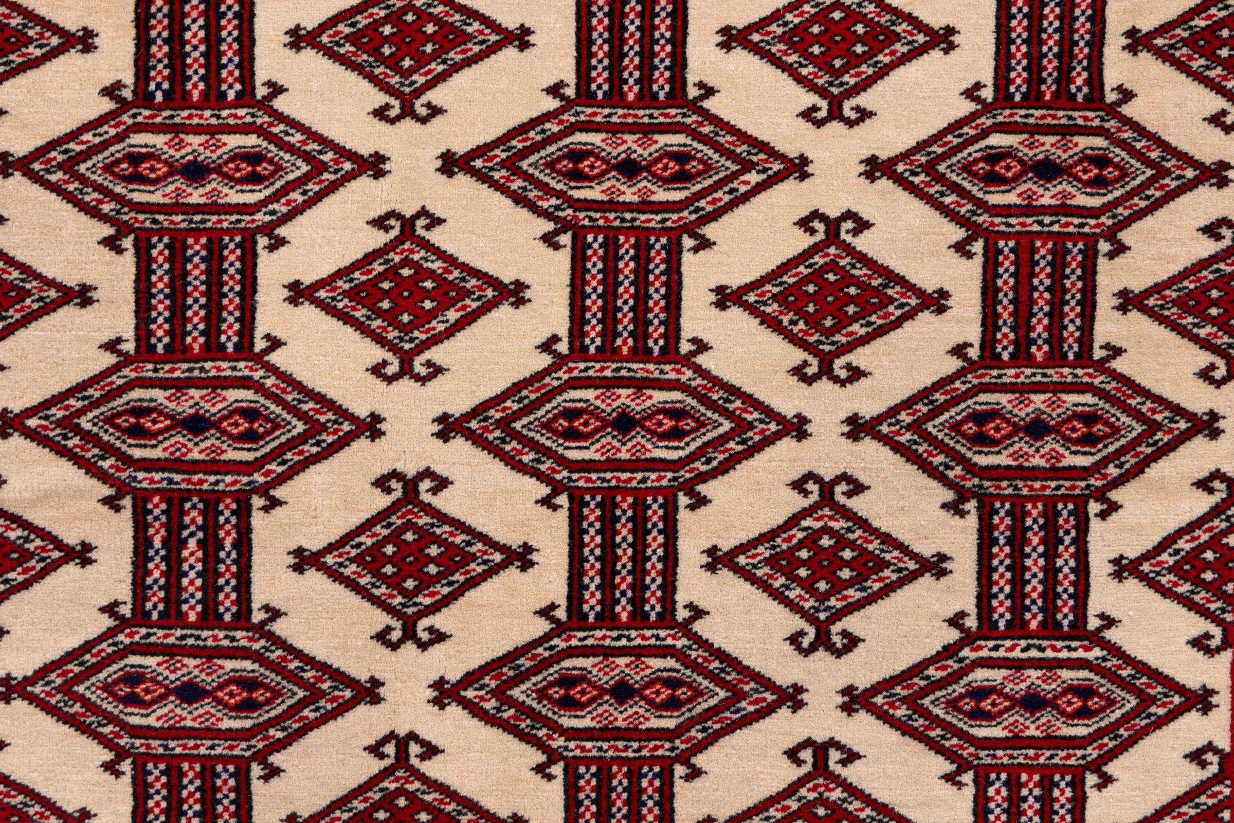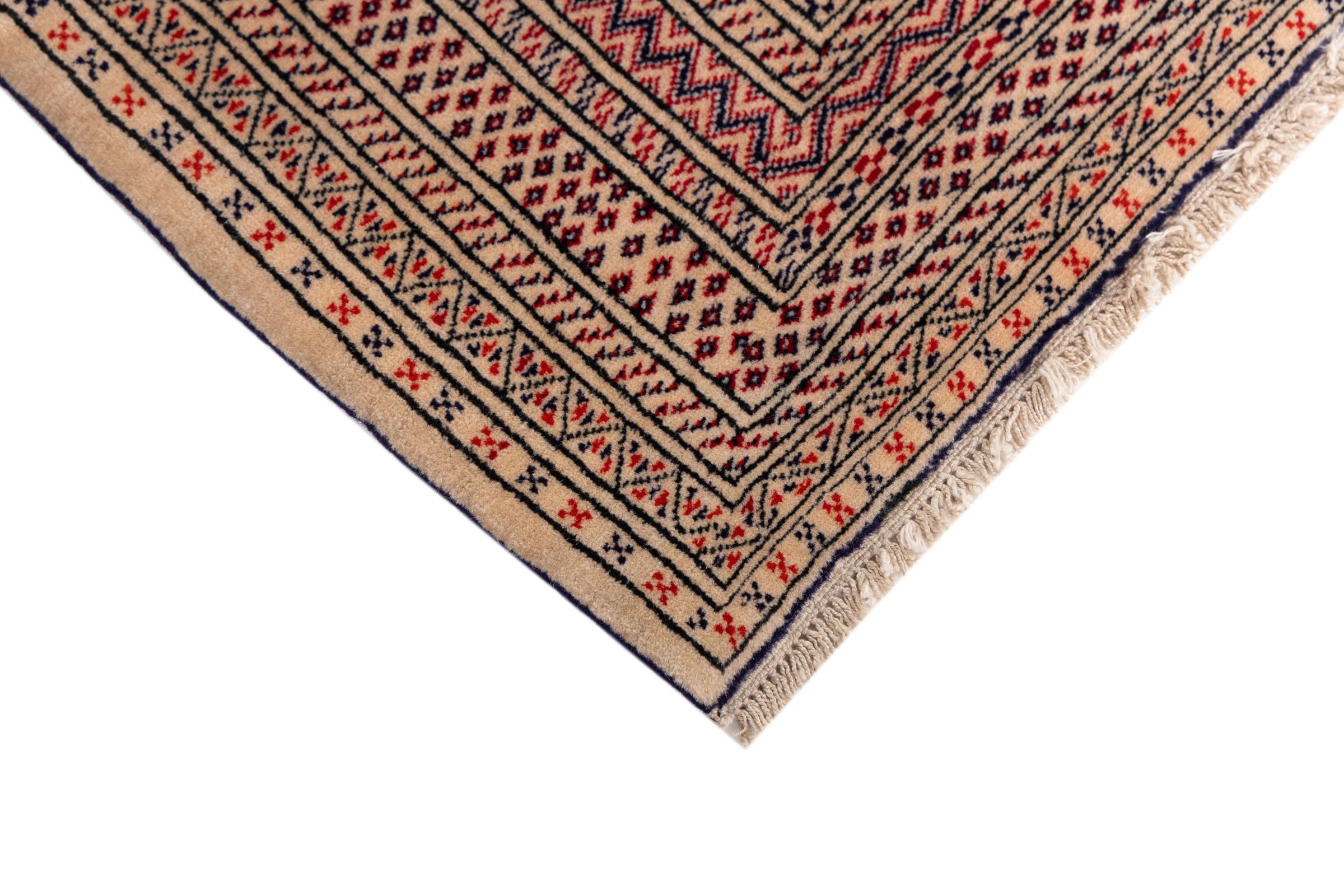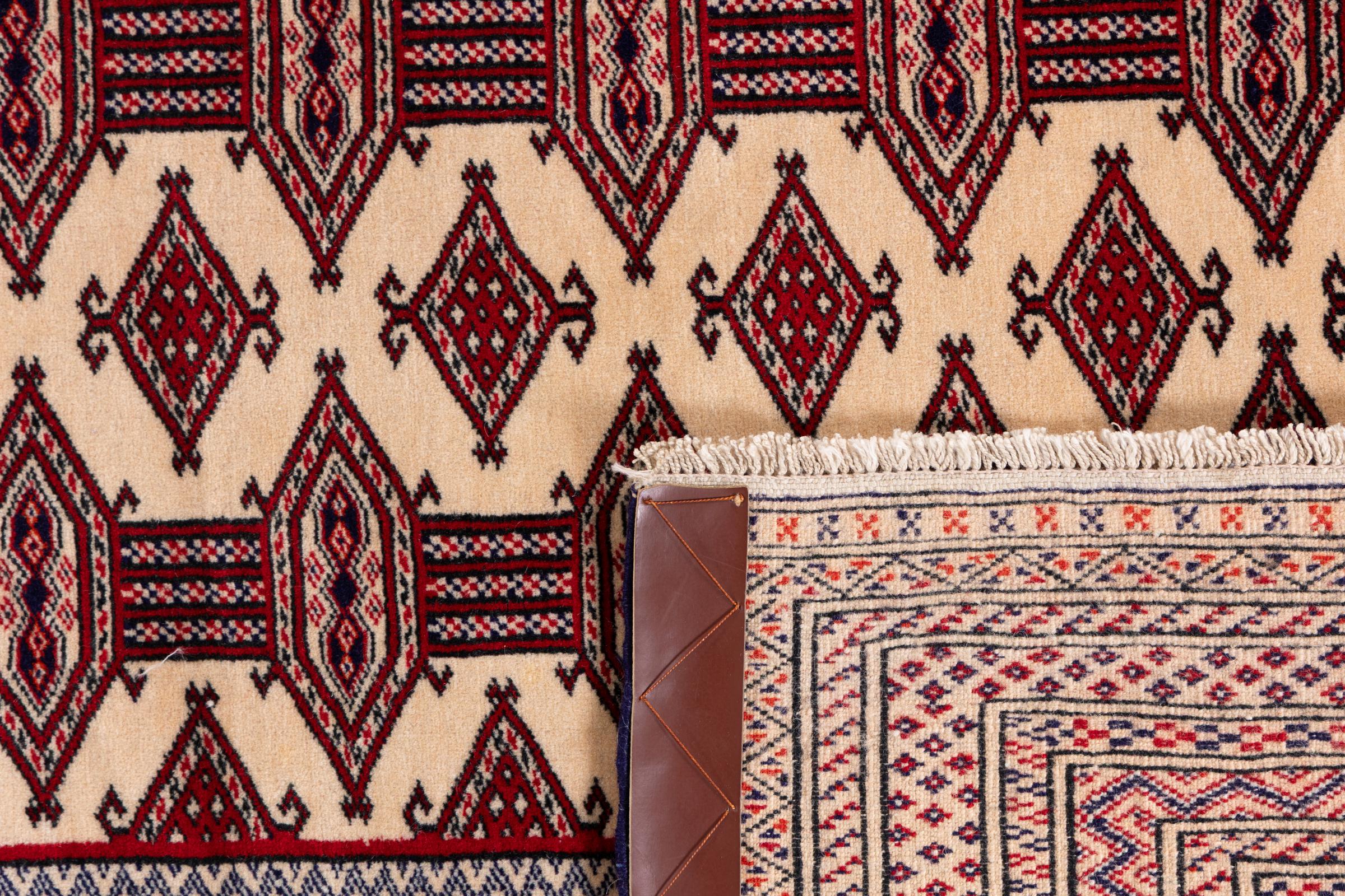 Esta alfombra turcomana se anudó a mano de forma tradicional e impresiona por su alto nivel de fabricación y su lana de oveja de alta calidad con un alto contenido en grasa. Sus colores cálidos y oscuros reflejan la cultura turcomana y aportan un toque oriental y acogedor a su hogar. Las alfombras paquistaníes suelen parecerse a este tipo de alfombra, pero a menudo no se acercan a su calidad.