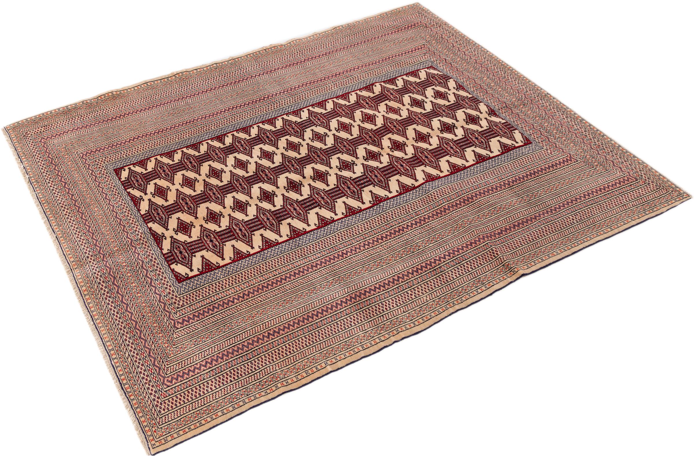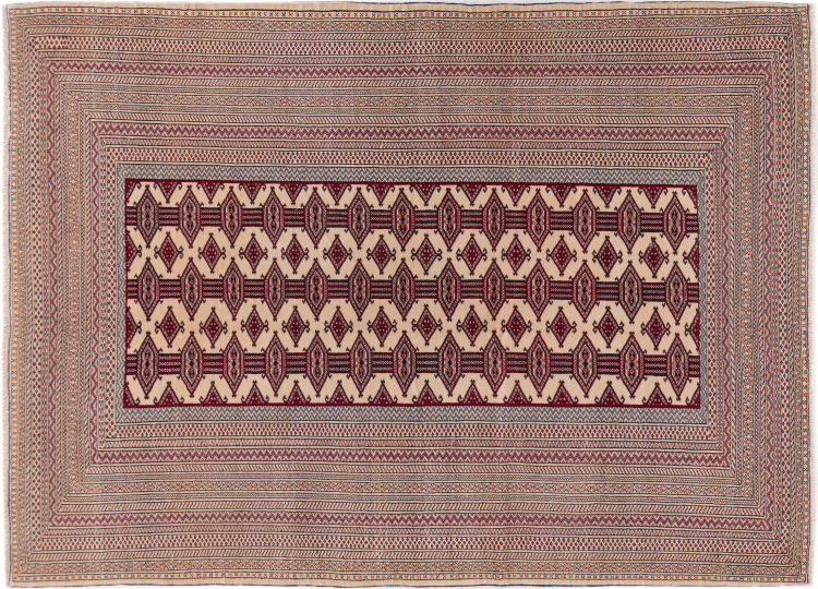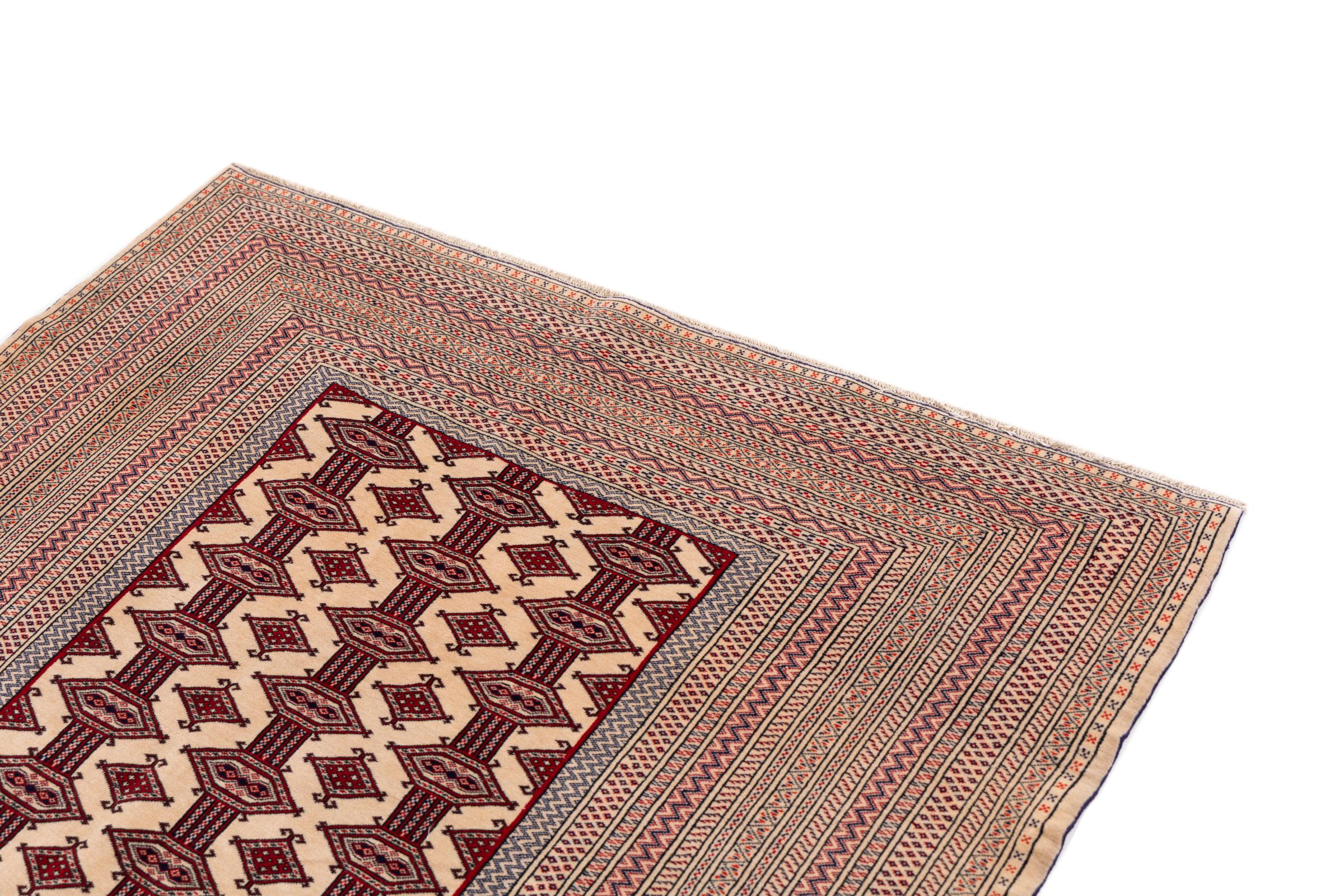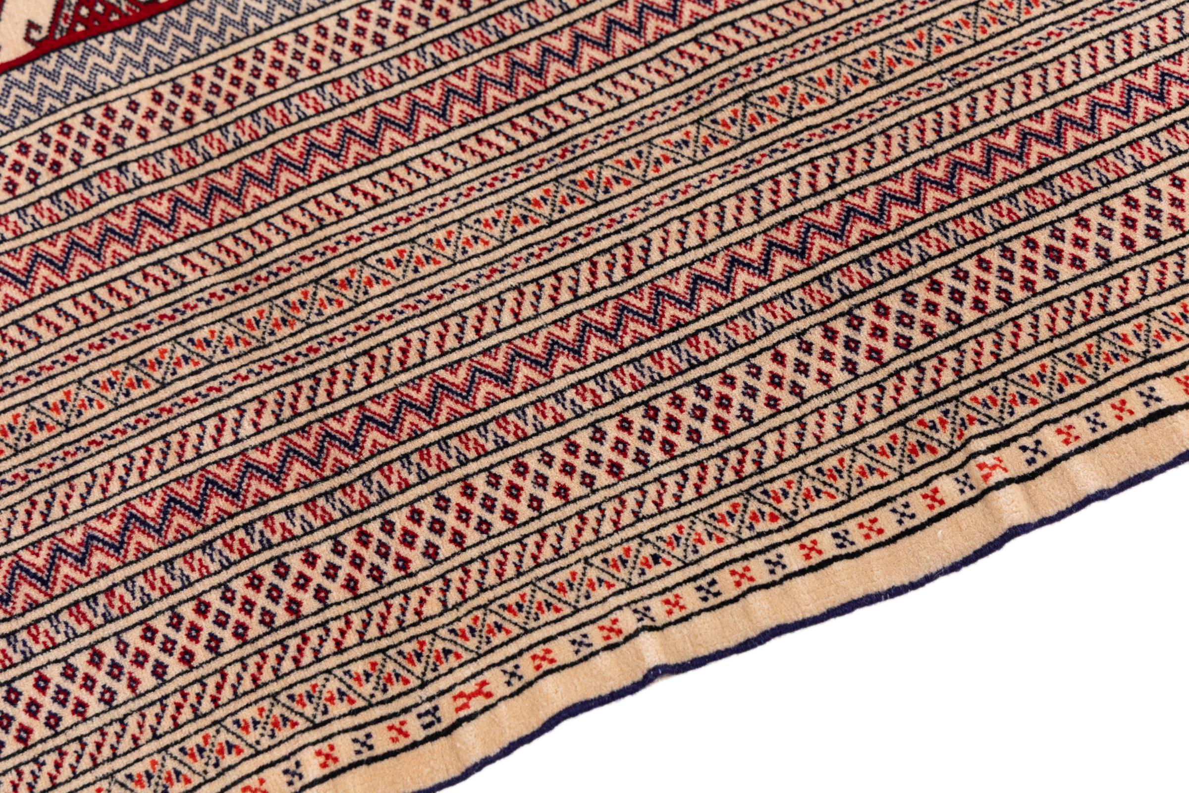 Esta alfombra turcomana se anudó a mano de forma tradicional e impresiona por su alto nivel de fabricación y su lana de oveja de alta calidad con un alto contenido en grasa. Sus colores cálidos y oscuros reflejan la cultura turcomana y aportan un toque oriental y acogedor a su hogar. Las alfombras paquistaníes suelen parecerse a este tipo de alfombra, pero a menudo no se acercan a su calidad.